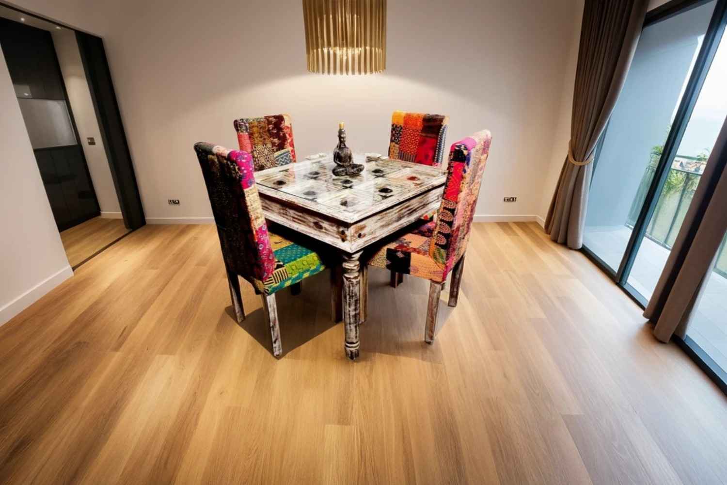 4-Seater jombri dining table with zernal wooden chair set is made by Sheesham (Rosewood) with teak finish.It is compact four seater dining table.Its design is very unique with outsider legs.It is very useful design for small space area and its light weighted with knock down facility that makes shifting easy.