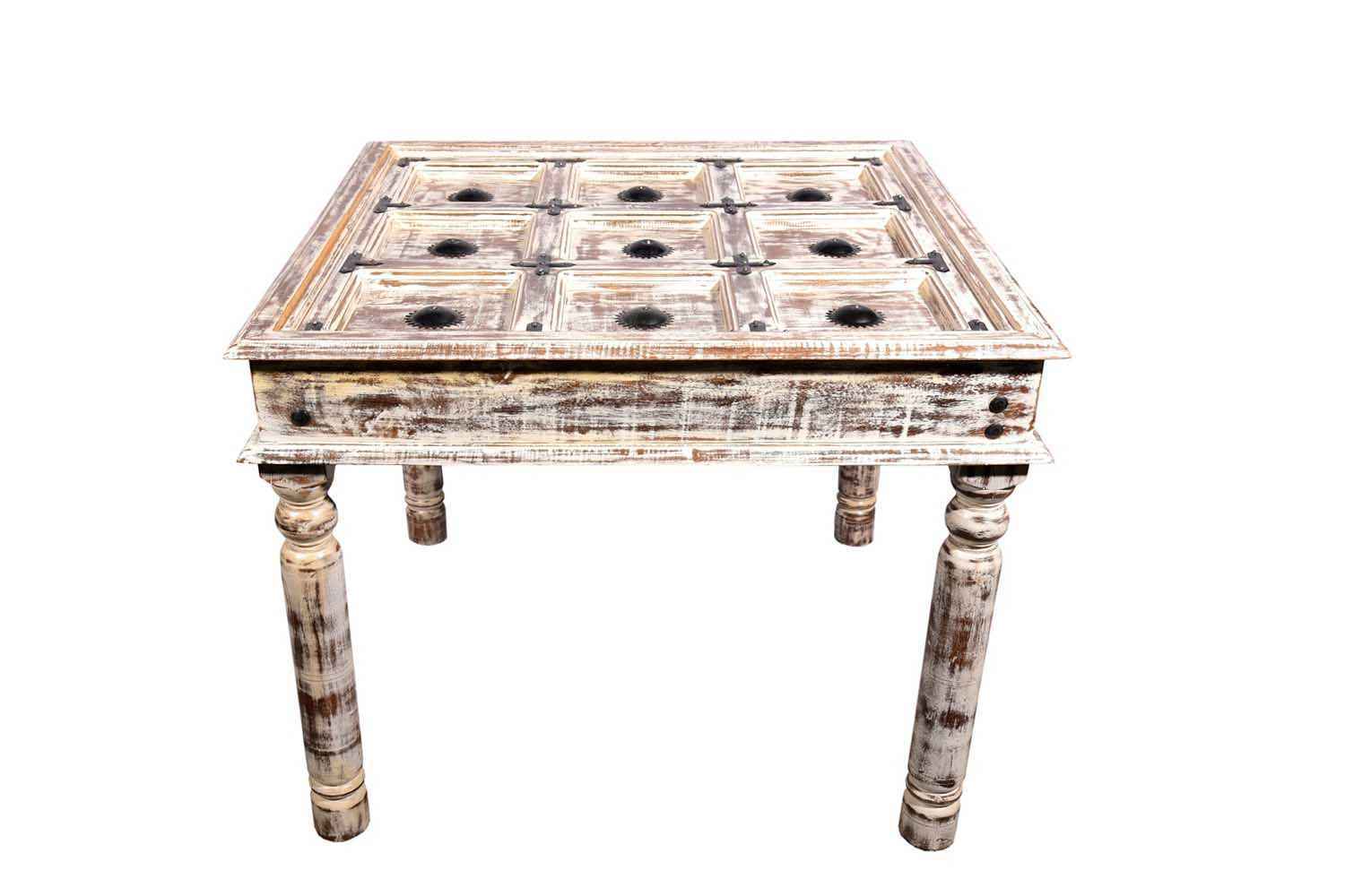 Table - 4 Seater Restro Tailor Dining  Table Set is made for home and commercial use and we have used  old theme with rough & teak Finish . It is made by old sleeper wood and iron base with Natural finish.It is a four seater dining table of Square shape and it’s giving a tailor recycle table look.This wooden dining table design mostly used in garden,outdoor section.This dining table contain four powder coated iron base Sheesham wood top chair with honey finish.