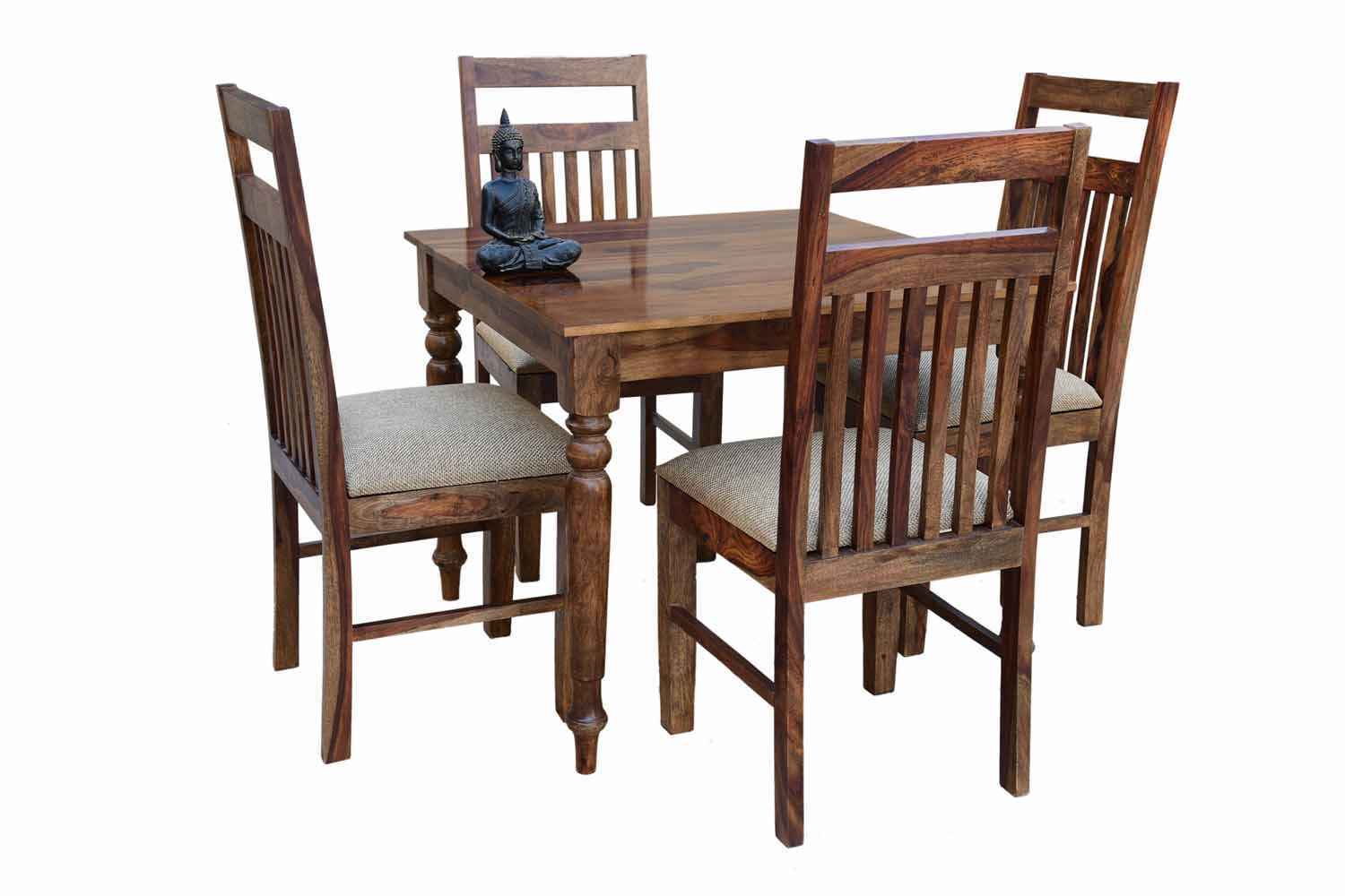 4-Seater Platinum squalres round leg dining with jailro strip brown upholstery chair is made by Sheesham (Rosewood) with teak finish.It contains round four legs with well carving.It is square shape four seating dining table.We follow simple design to make this product.It’s available in knockdown facility that makes easy shifting.
