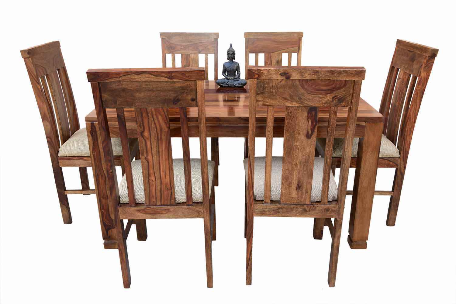 6-Seater pencil Dining table with Upholstery chair set is made by Sheesham(Rosewood) with teak finish.We gave pencil shape design table in leg portion that giving amazing look.It’s top and top support frame divided by a curved line.It is very stable Sheesham wooden dining table set and available in knockdown facility that makes shifting easy.