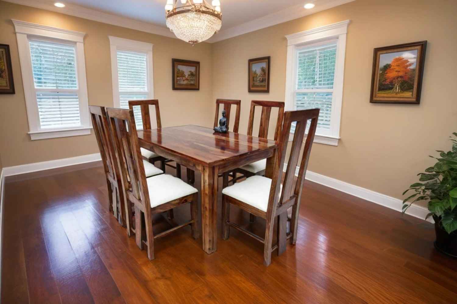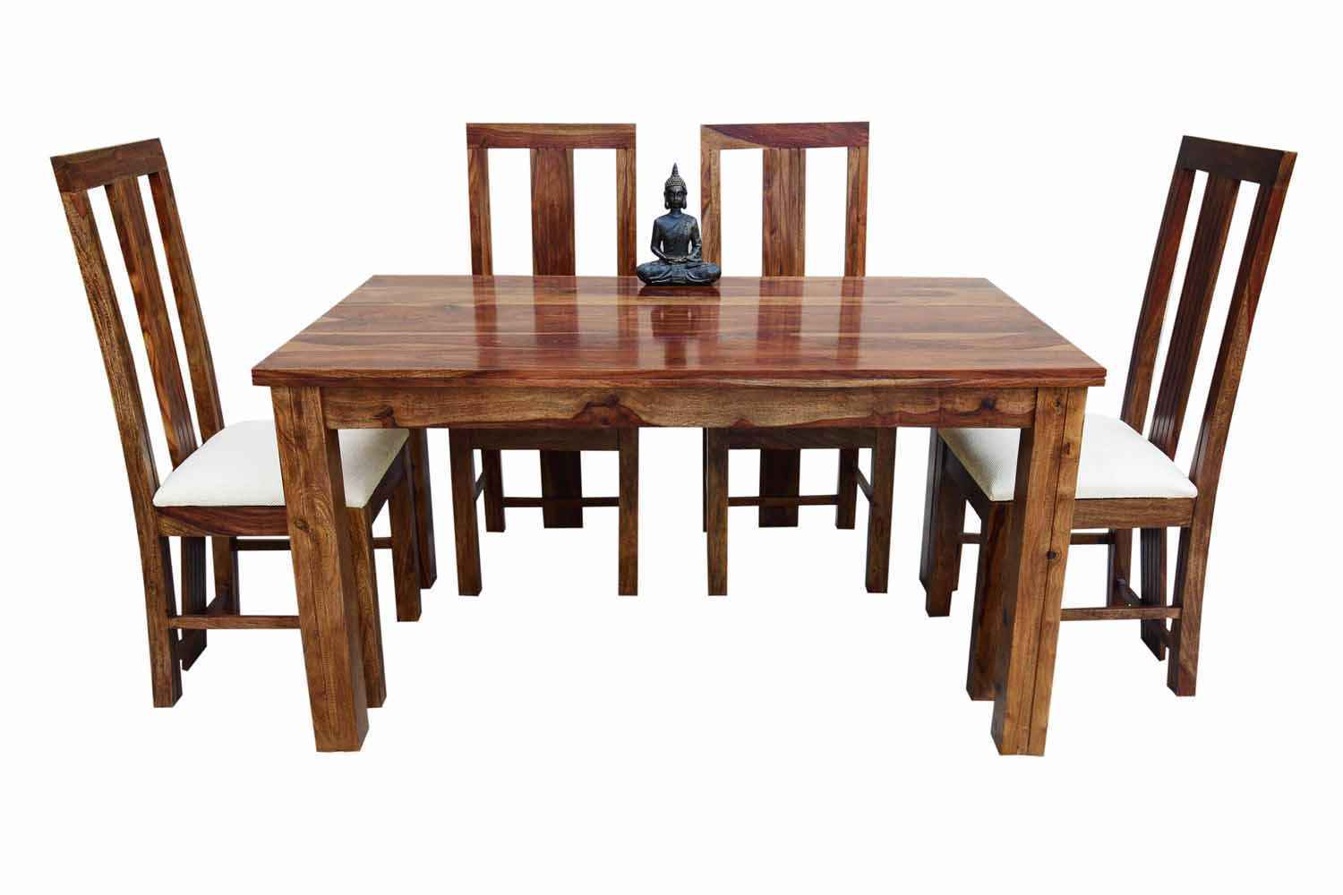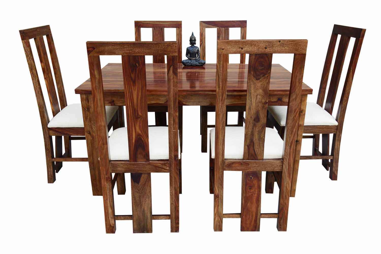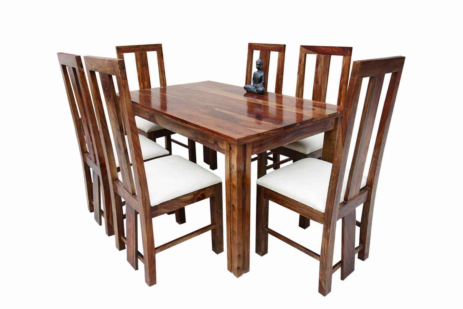 6 Seater Classic Dining Table Set Small size is made for your sweet home.It is made by Sheesham (Rosewood)with walnut finish. This dining table set is simple and good looking. This design mostly used in small space area.This dining table contains six Sheesham wood chair with teak finish. Sheesham wood furniture is always count in best quality furniture.