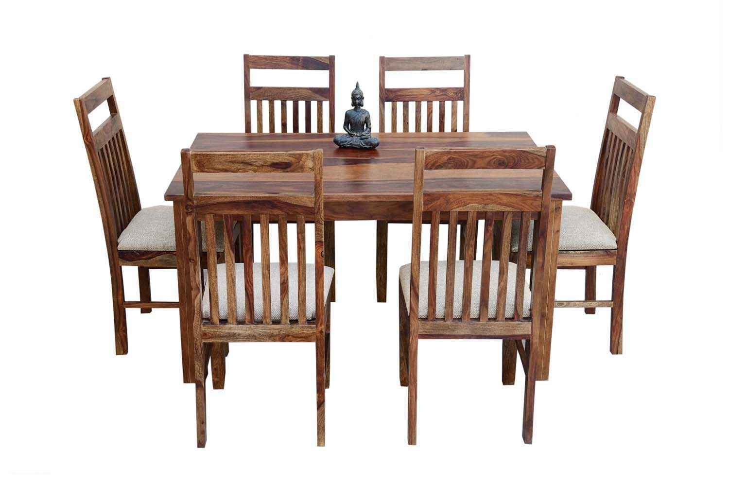 6-Seater pencil Dining table with Upholstery chair set is made by Sheesham(Rosewood) with teak finish.We gave pencil shape design table in leg portion that giving amazing look.It’s top and top support frame divided by a curved line.It is very stable Sheesham wooden dining table set and available in knockdown facility that makes shifting easy.