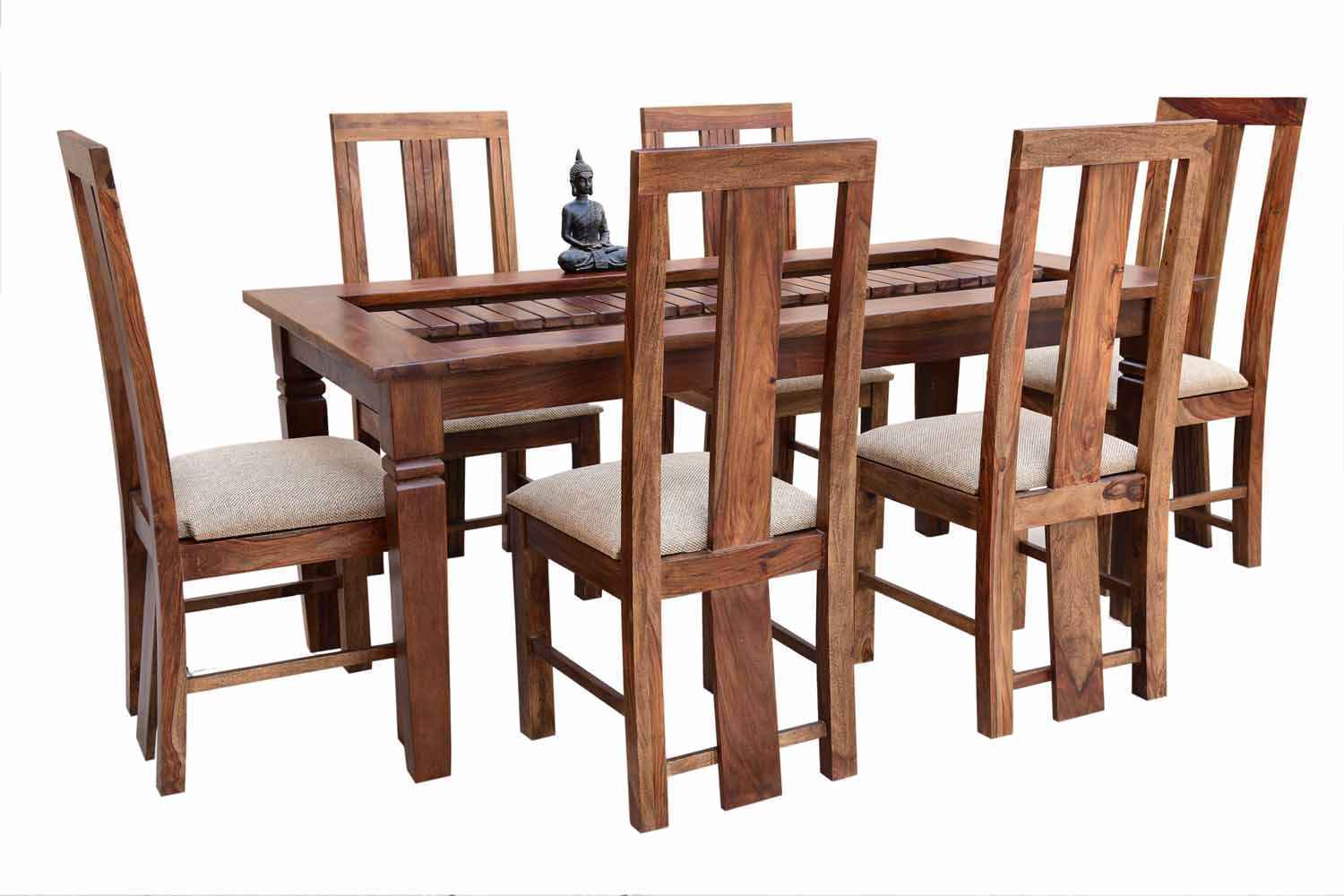 6 Seater Classic Dining Table Set Small size is made for your sweet home.It is made by Sheesham (Rosewood)with walnut finish. This dining table set is simple and good looking. This design mostly used in small space area.This dining table contains six Sheesham wood chair with teak finish. Sheesham wood furniture is always count in best quality furniture.
