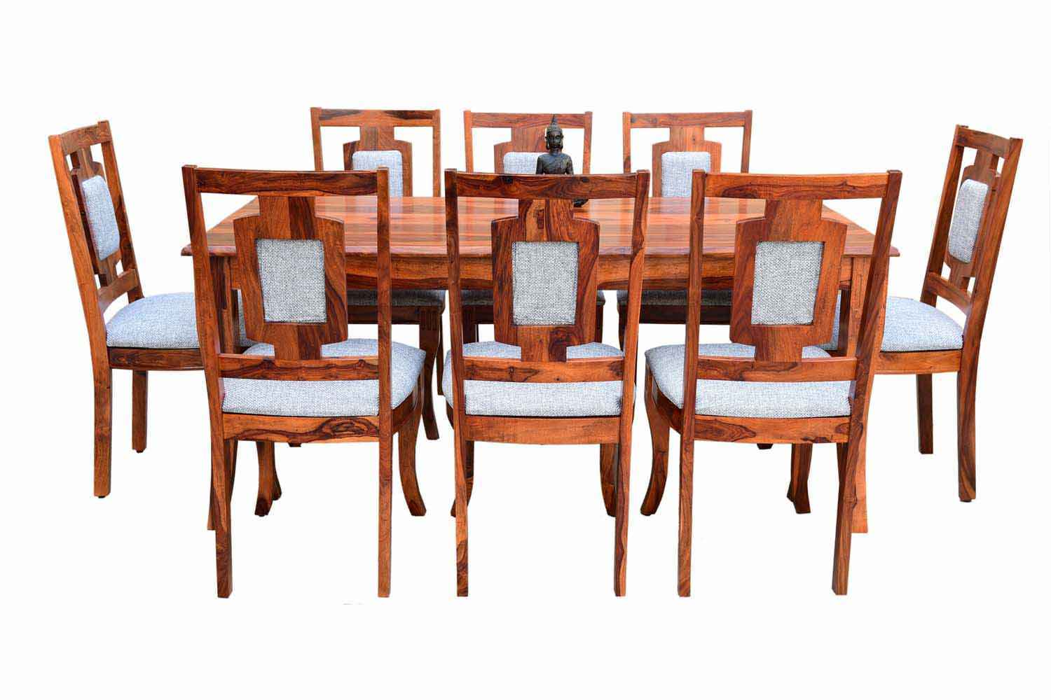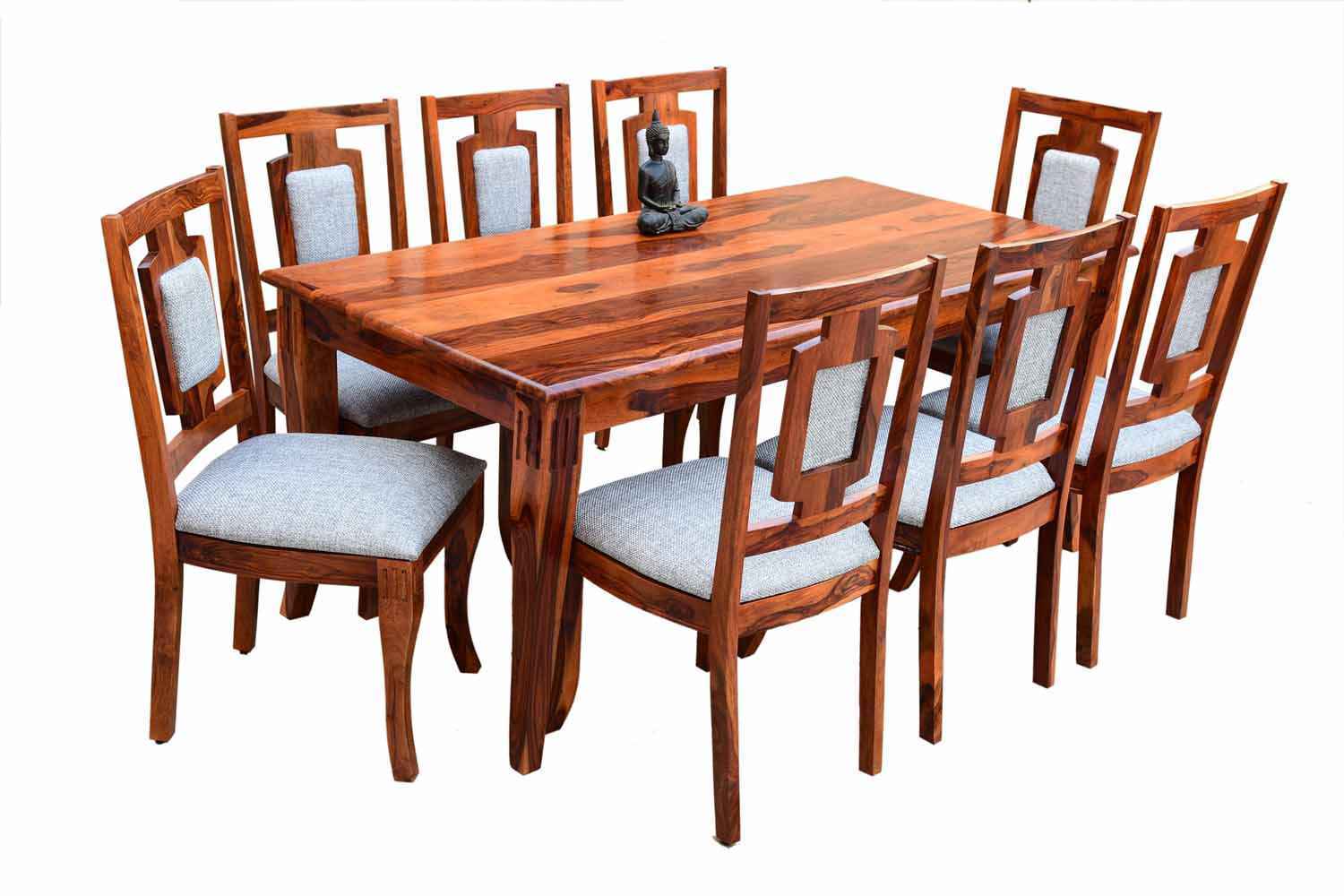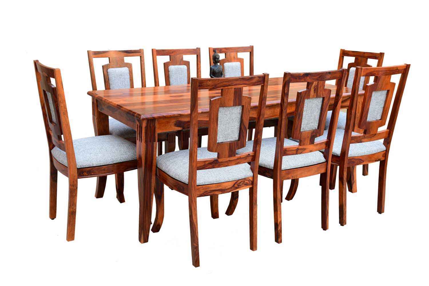 8 Seater SPL Dining Table set is make your interior beautiful.It made by Sheesham (Rosewood) with Teak finish.This Sheesham wood dining table has square shape design with well finished carving in top frame.It is a eight sitting dining table with good space.This dining table contain eight Sheesham wood chair with teak finish. Sheesham wood furniture always count in best quality furniture.