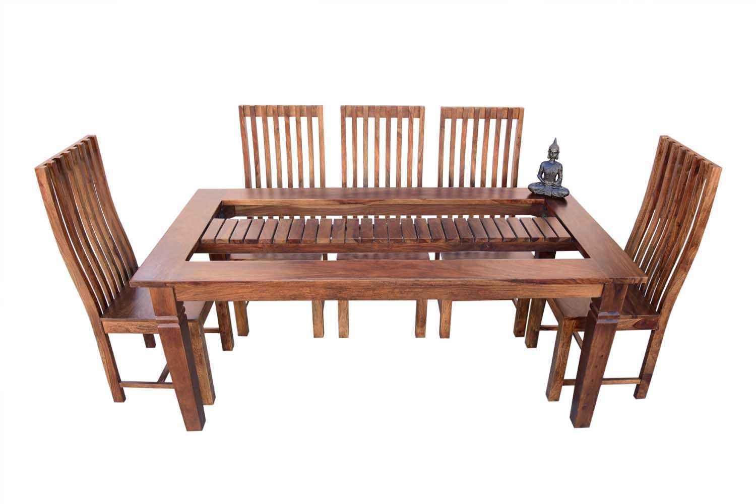 8 Seater SPL Dining Table set is make your interior beautiful.It made by Sheesham (Rosewood) with Teak finish.This  Sheesham wood dining table has square shape design with well finished carving in top frame.It is a eight sitting dining table with good space.This dining table contain eight Sheesham wood chair with teak finish. Sheesham wood furniture always count in best quality furniture.