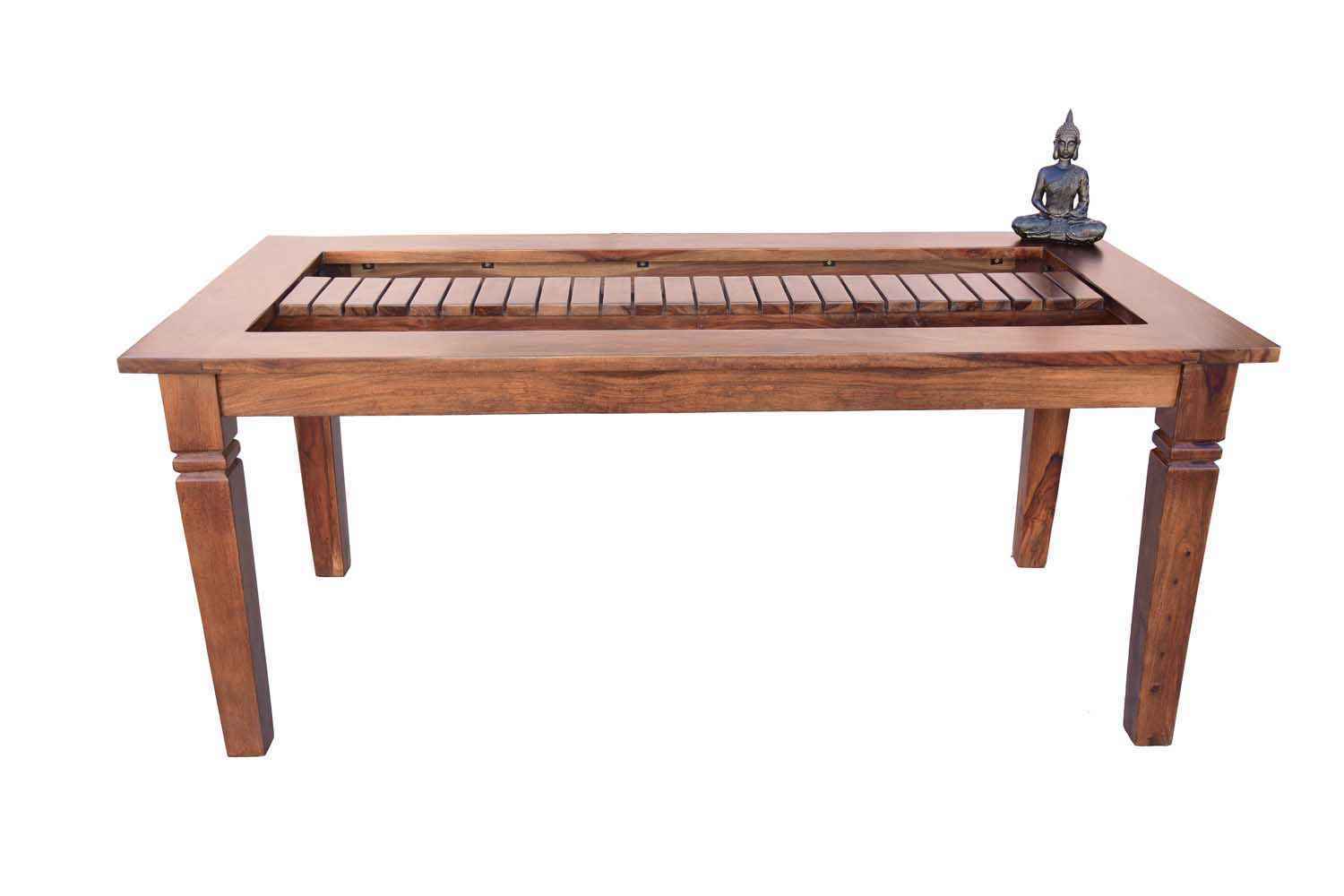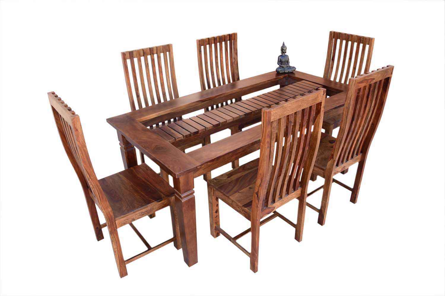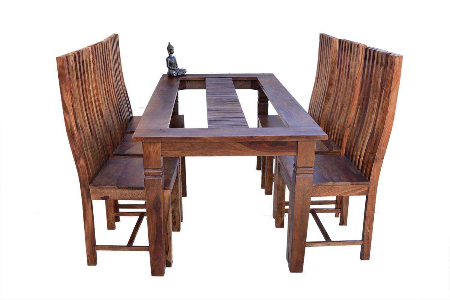 4 seater swingo dining table with Elpho brown upholstery chair set is made by Sheesham (Rosewood) with teak finish.It is four seater dining table.Carving work separates its design from others.Its top design is very unique.We gave rectangle shape hole in both side of top carving and all top area covered by transparent glass.It is available in knockdown facility that makes easy shifting. (WE ARE NOT PROVIDING GLASS WITH THIS DINING TABLE)