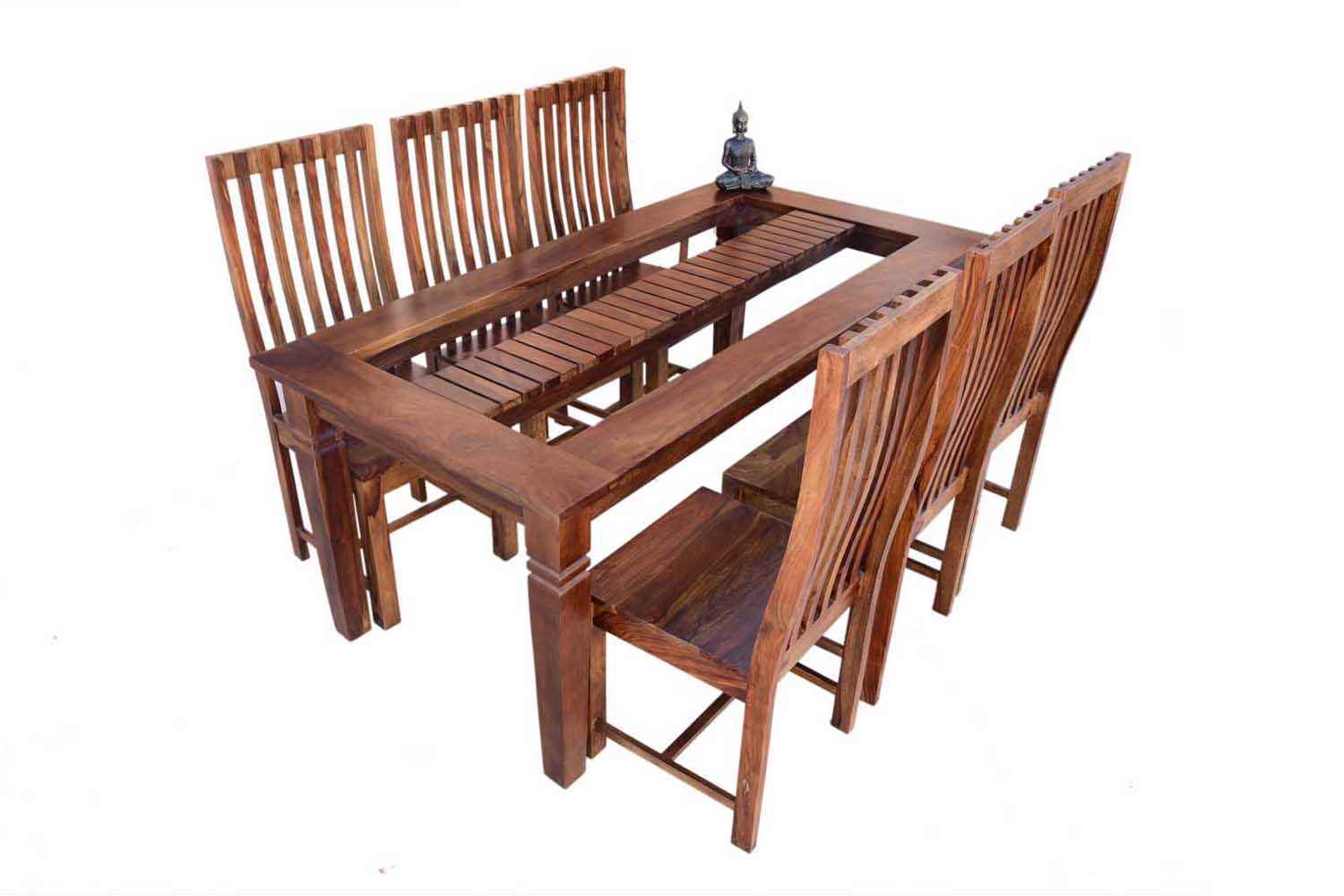 8-Seater Platinum dining table set is made for your sweet home. It made by Sheesham (Rosewood) with Teak finish. It is a four sitting dining table with heritage look and legs are in special antique design that giving a different look than others.This dining table design mostly use in heritage collection. This dining table contains four Sheesham wooden chair, round leg carving with teak finish. Sheesham wood furniture always count  as a best quality product