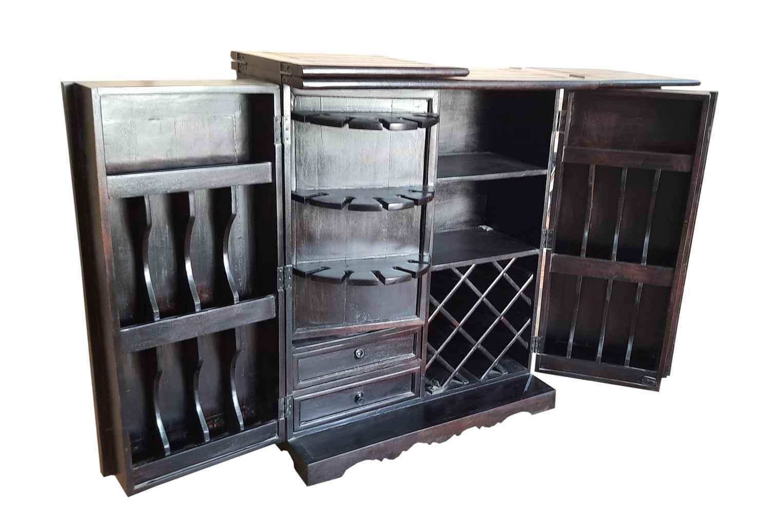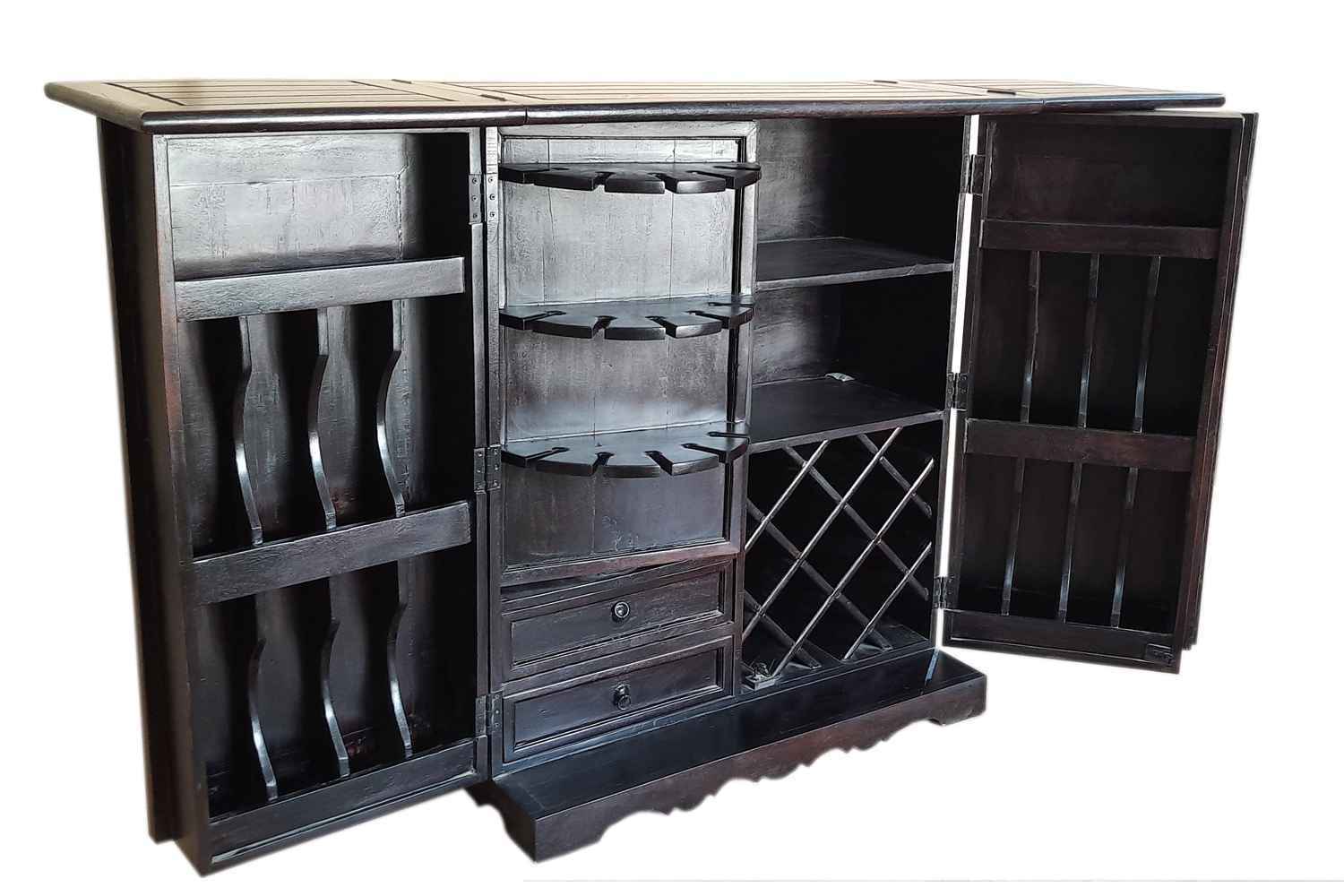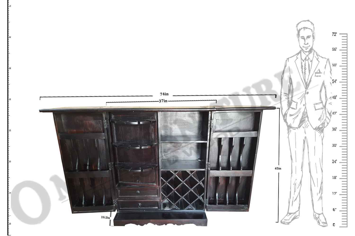 Pyramid bar cabinet is made by Sheesham wood (Rosewood) with walnut finish. This wooden bar cabinet comes with two front doors to reveal a 13 bottle wine rack, two drawers ,side shelves in doors to accommodate wine bottles , stem glass holder for 9 glasses , bar accessories. This expandable wooden bar cabinet opens into long counter. You can buy this sheesham wood furniture online from O my furniture.