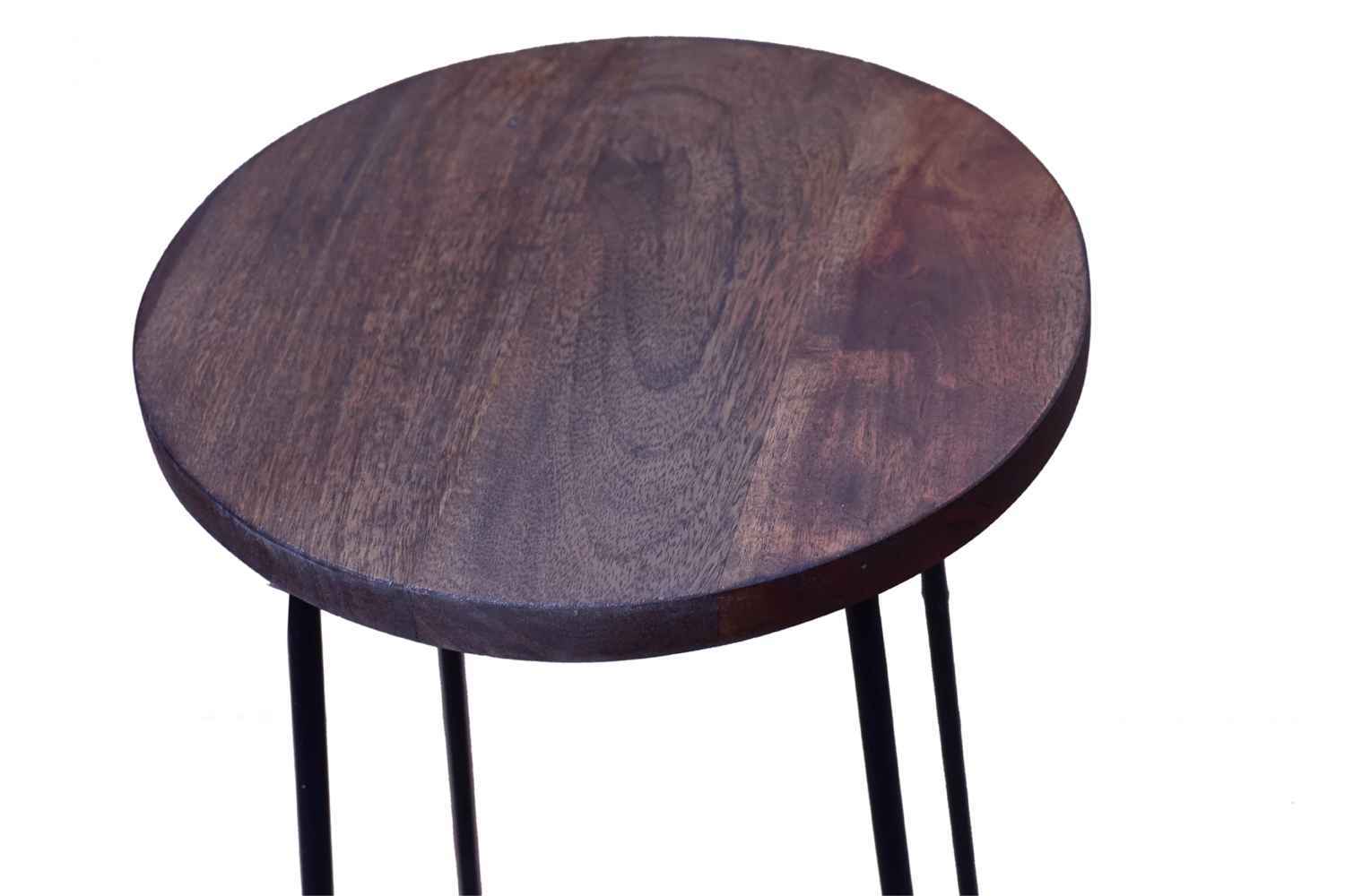 Nusi bar stool is made by acacia wood with natural finishing and powder coated iron. Nusi bar stool having round shaped wooden top with cone shaped wooden legs and round shaped iron attached to it that make the design unique and sturdy for usage.