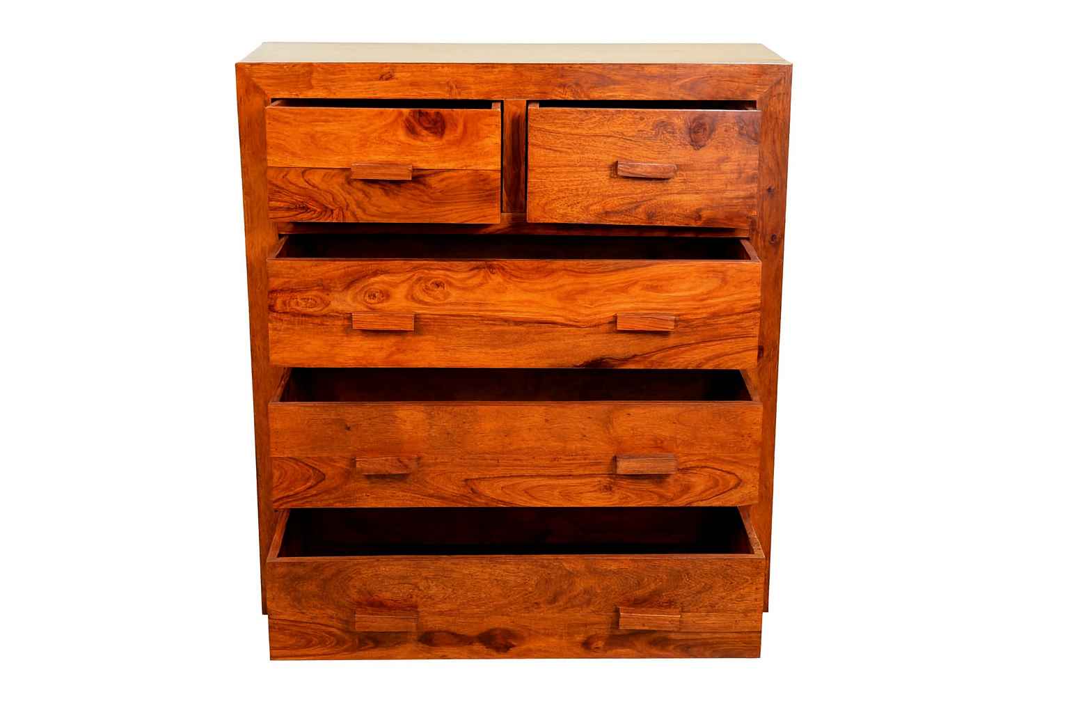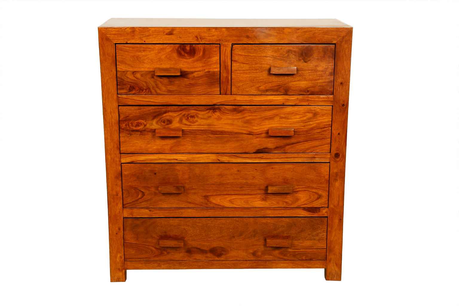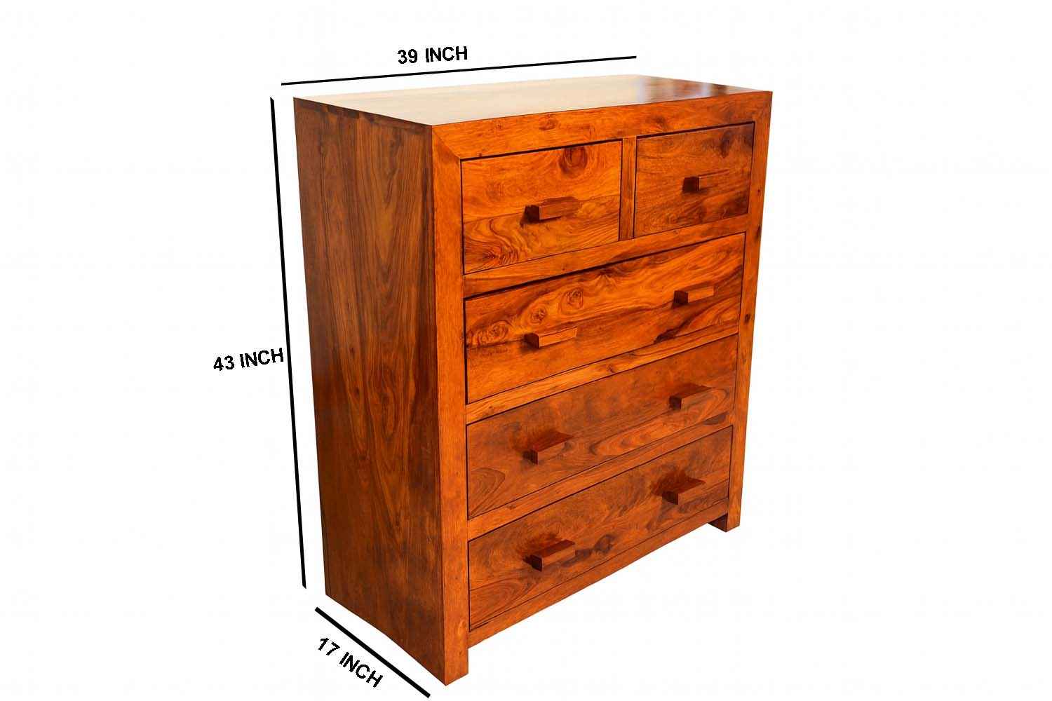 Beamy long chest of drawer is made by Mango wood with walnut and teak finish. This is five drawer set of chest of drawer. We have used walnut finishing in body and drawers are finished with teak that makes it amazing colorful look with more storage capacity and less space consuming that make your interior more attractive.You can buy bedroom furniture online from O my furniture.