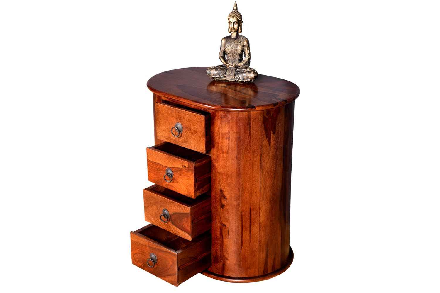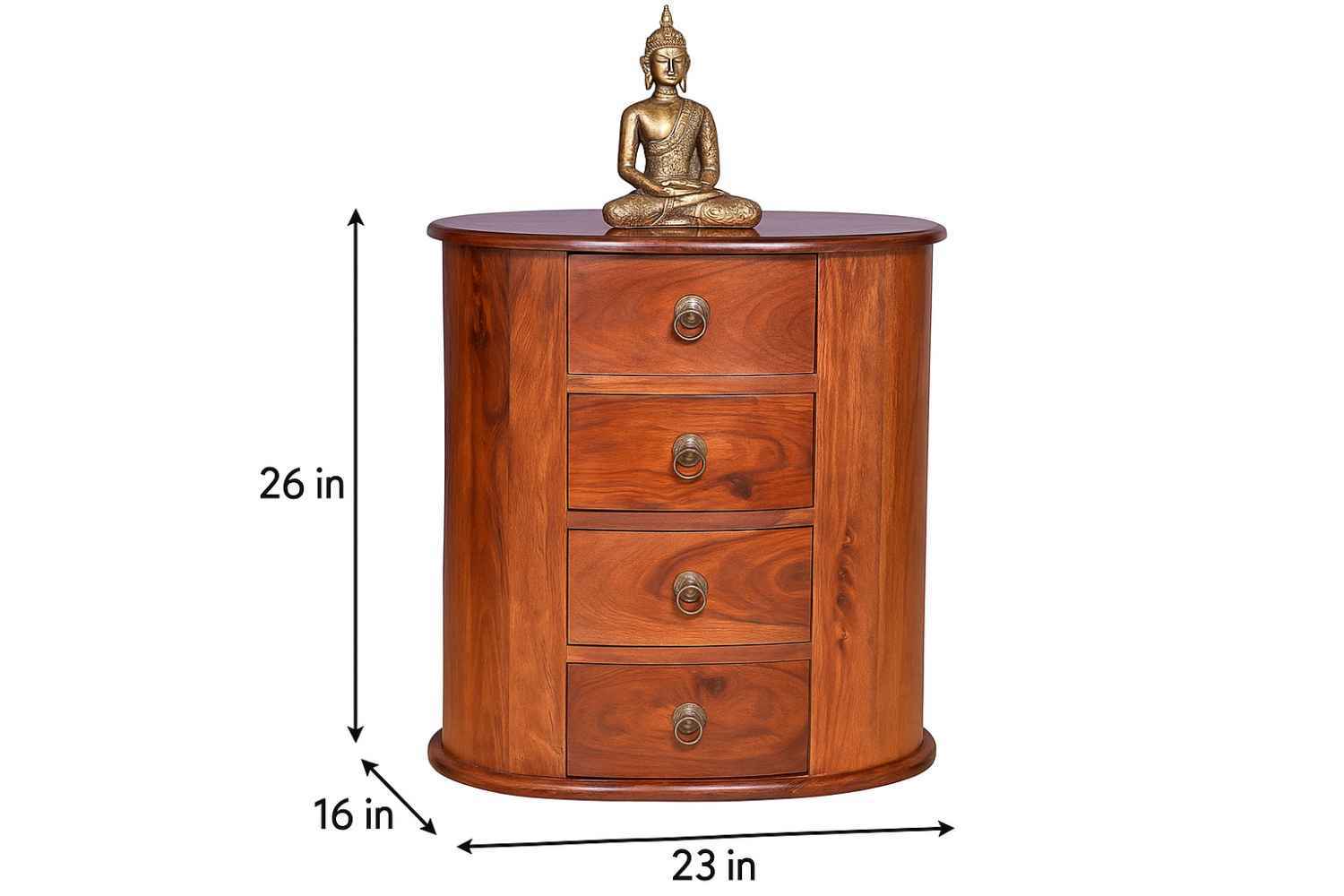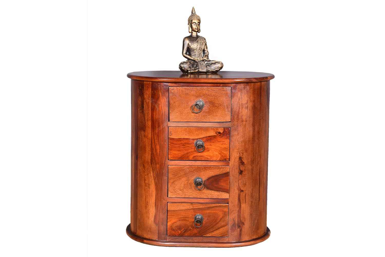 Beamy four drawer sheesham  chest of drawer  made by Sheesham (Rosewood) with teak finish.It is in oval shape.This chest of drawer contains four drawer with iron handle accessories.Chest of drawer top and bottom are lightly out as compare to whole body frame. Sheesham wood furniture is always count in best quality furniture product.You can buy Sheesham wood furniture online from O my furniture.
