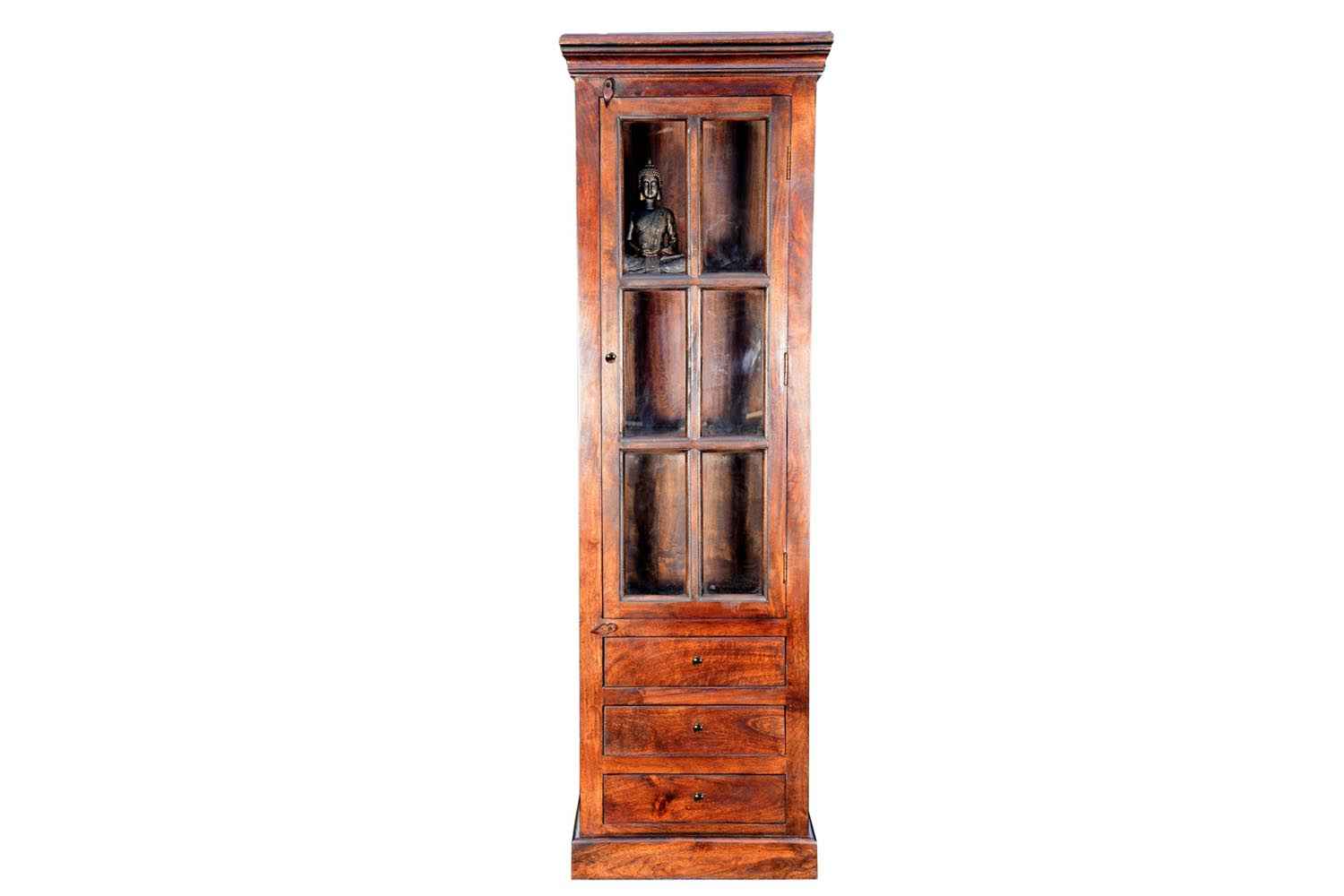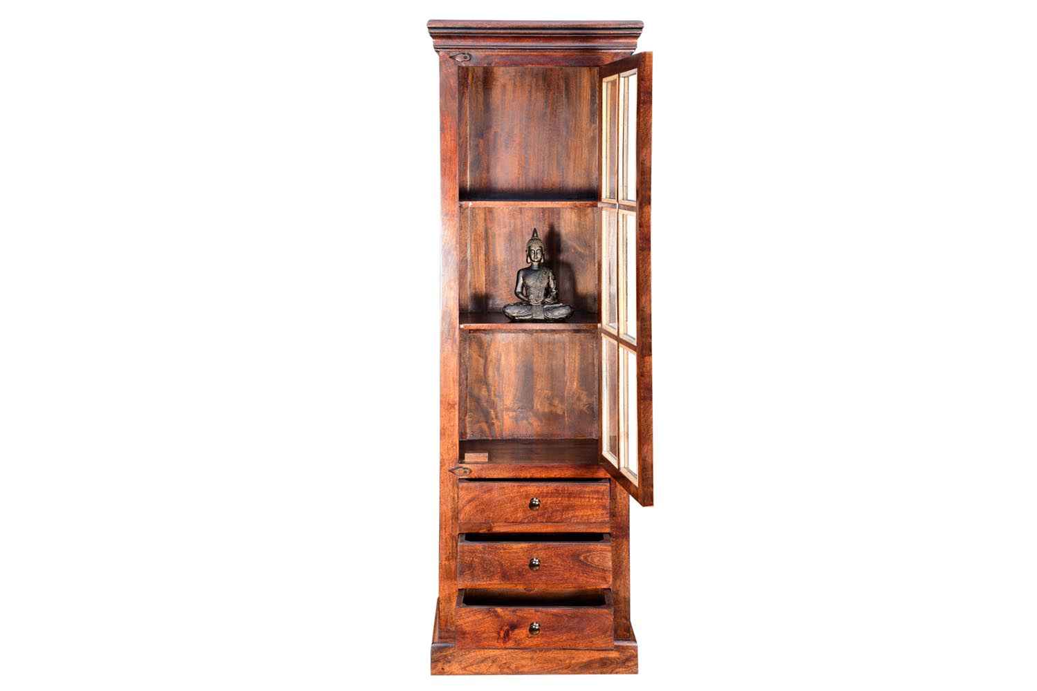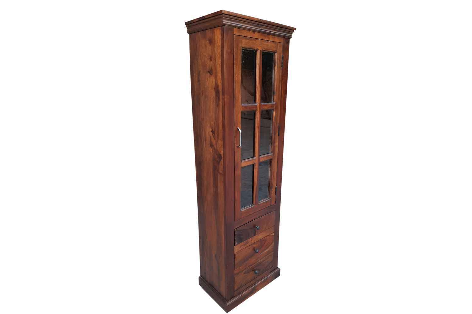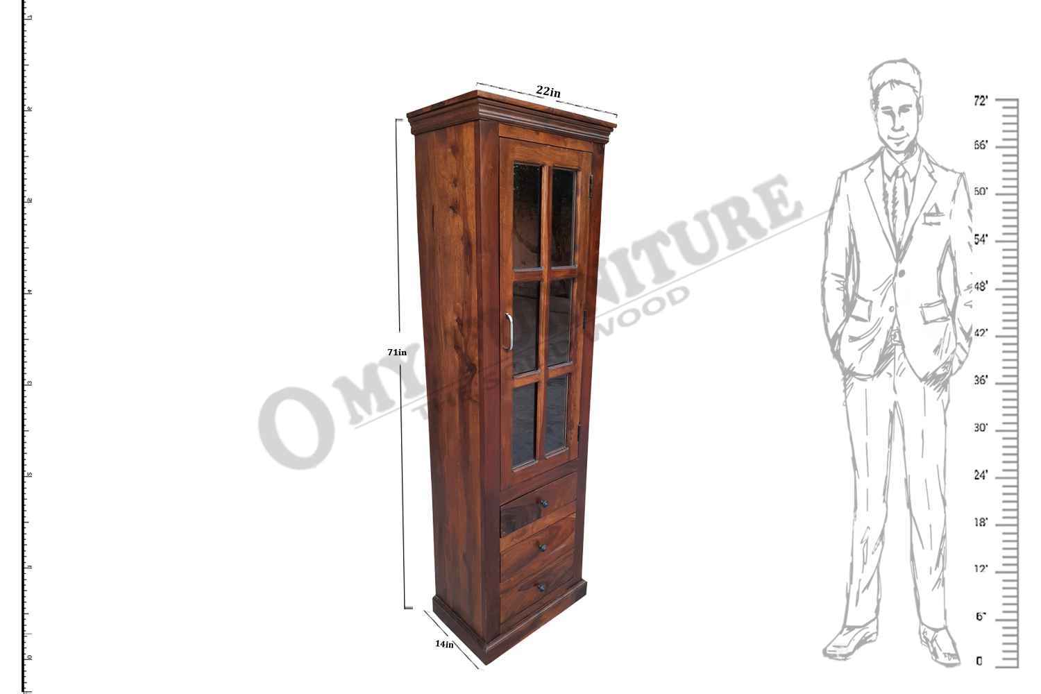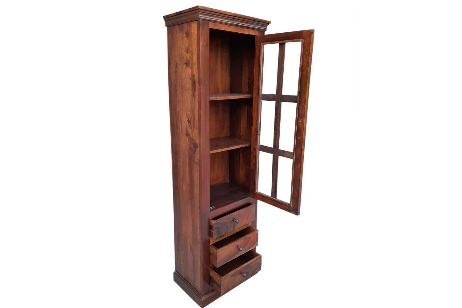 Shutter one Door wardrobe is made up of Mango wood with walnut finishing.This wooden furniture wardrobe contains Shutter pattern door and three shelf with four sections.It is used in living room, bedroom as well as wardrobe and storage.You can buy this beautiful wooden furniture wardrobe online from O my furniture.