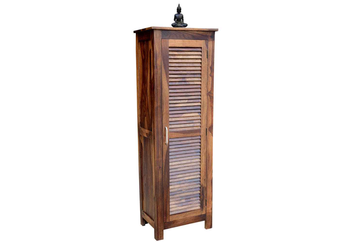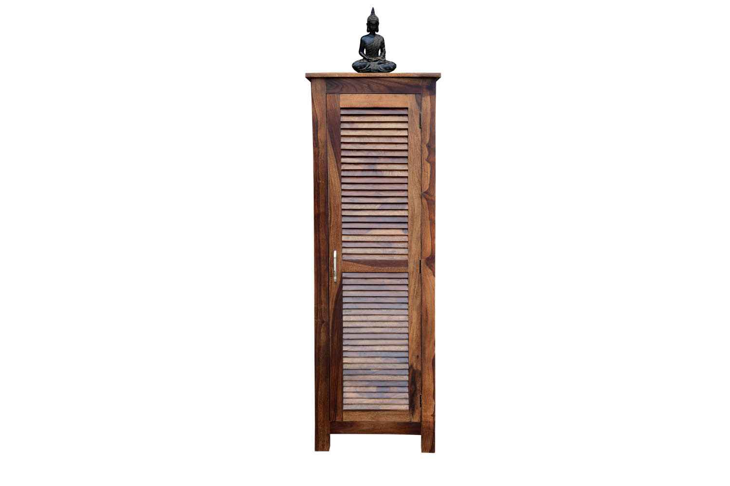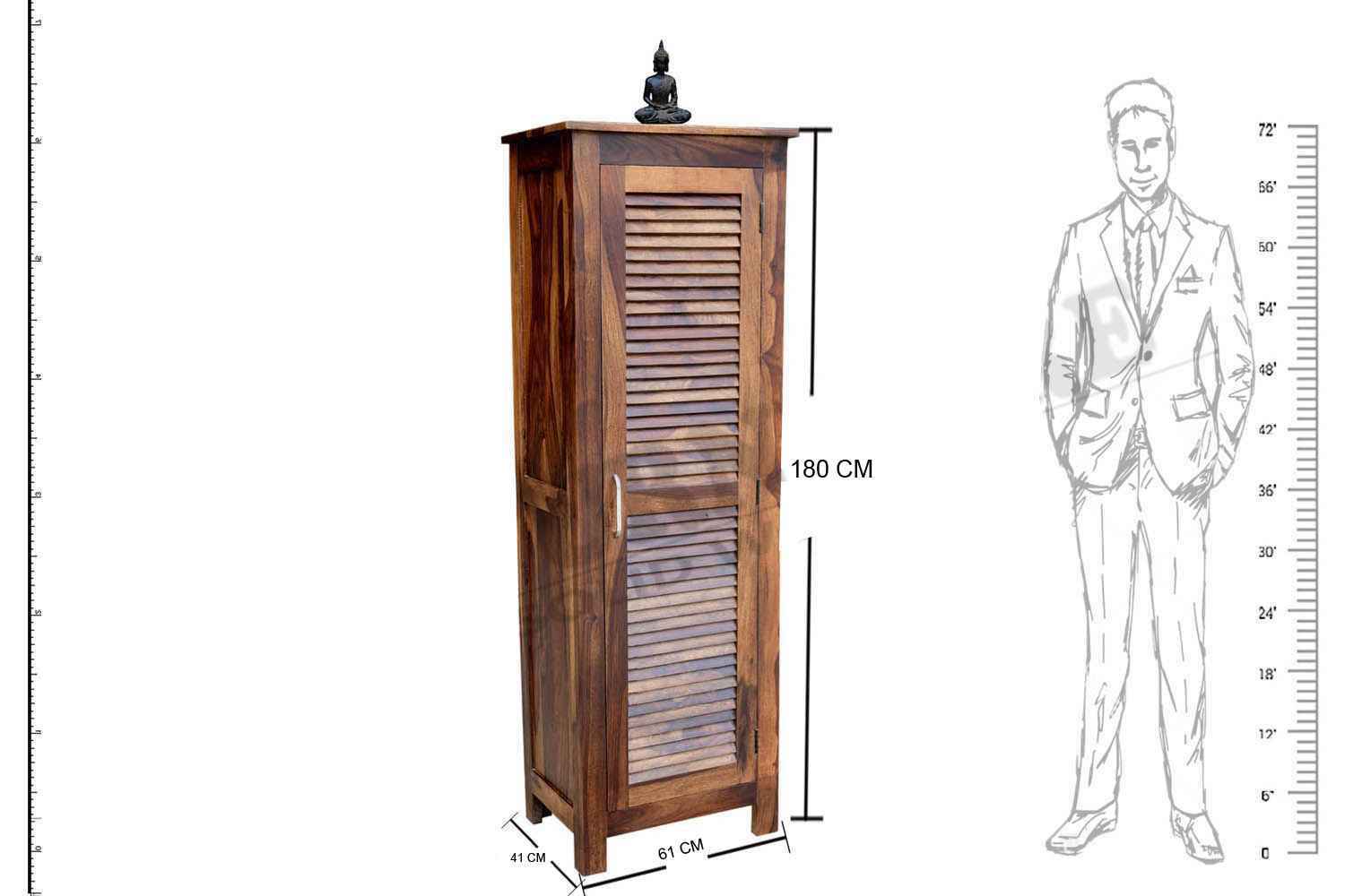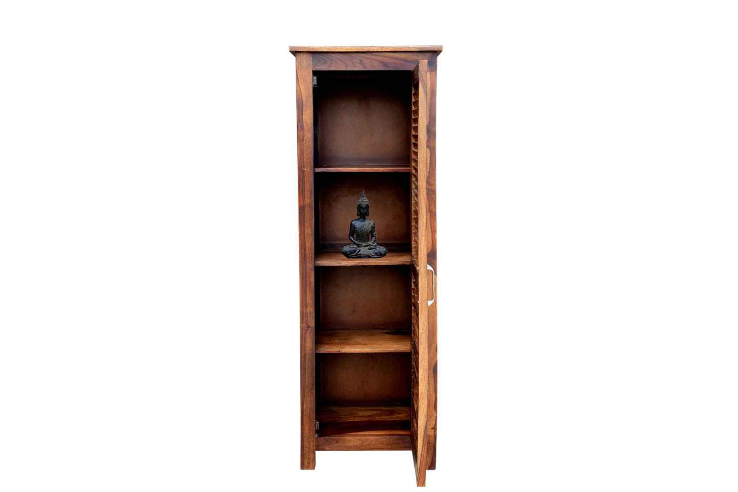 Shutter one Door wardrobe is made up of Mango wood with walnut finishing.This wooden furniture wardrobe contains Shutter pattern door and three shelf with four sections.It is used in living room, bedroom as well as wardrobe and storage.You can buy this beautiful wooden furniture wardrobe online from O my furniture.