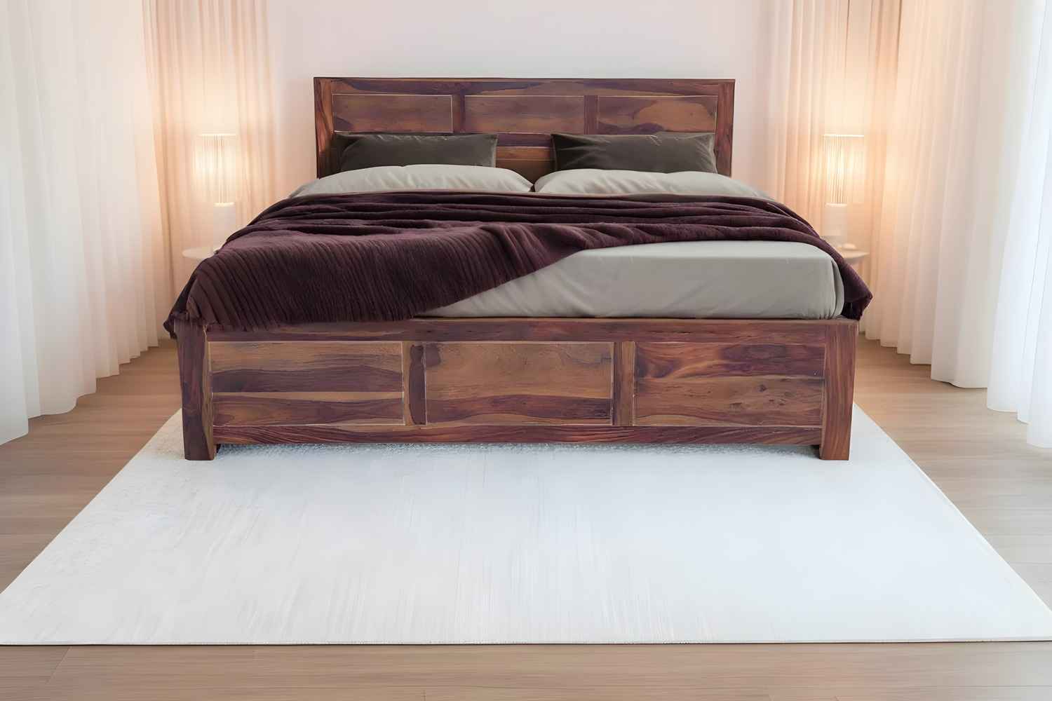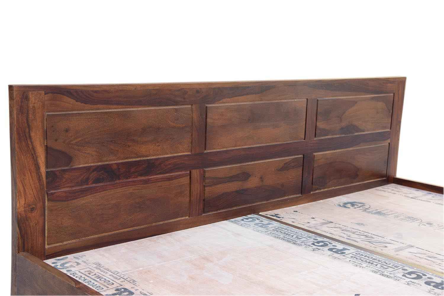 Spline Queen Bed is made up of Sheesham (Rosewood) with teak and iron finishing. It is queen size bed. Head and leg portion of the bed are design with Sheesham wooden strips quilling by iron rods. It is without storage bed and easy to move. It’s quilling strip giving a unique look.You can buy this Sheesham wood furniture online from O my furniture.