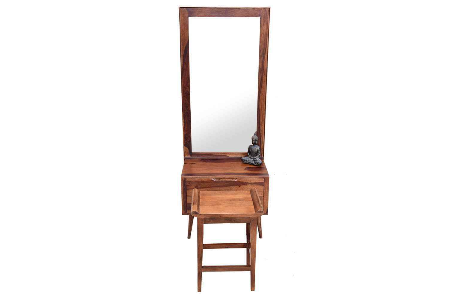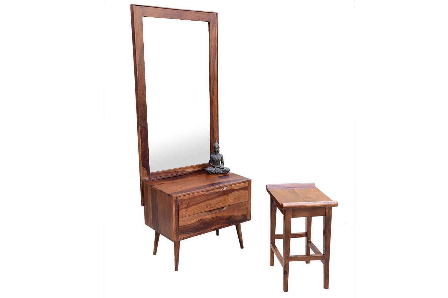 Salivro round leg dressing table is made by Sheesham(Rosewood) with teak finish.This dressing table set contains two drawer and four round cone shape legs.It is fully knockdown product and its manufacturing style is very special.It is very beautiful product for our home.Its compact size make it more useful for small space area.