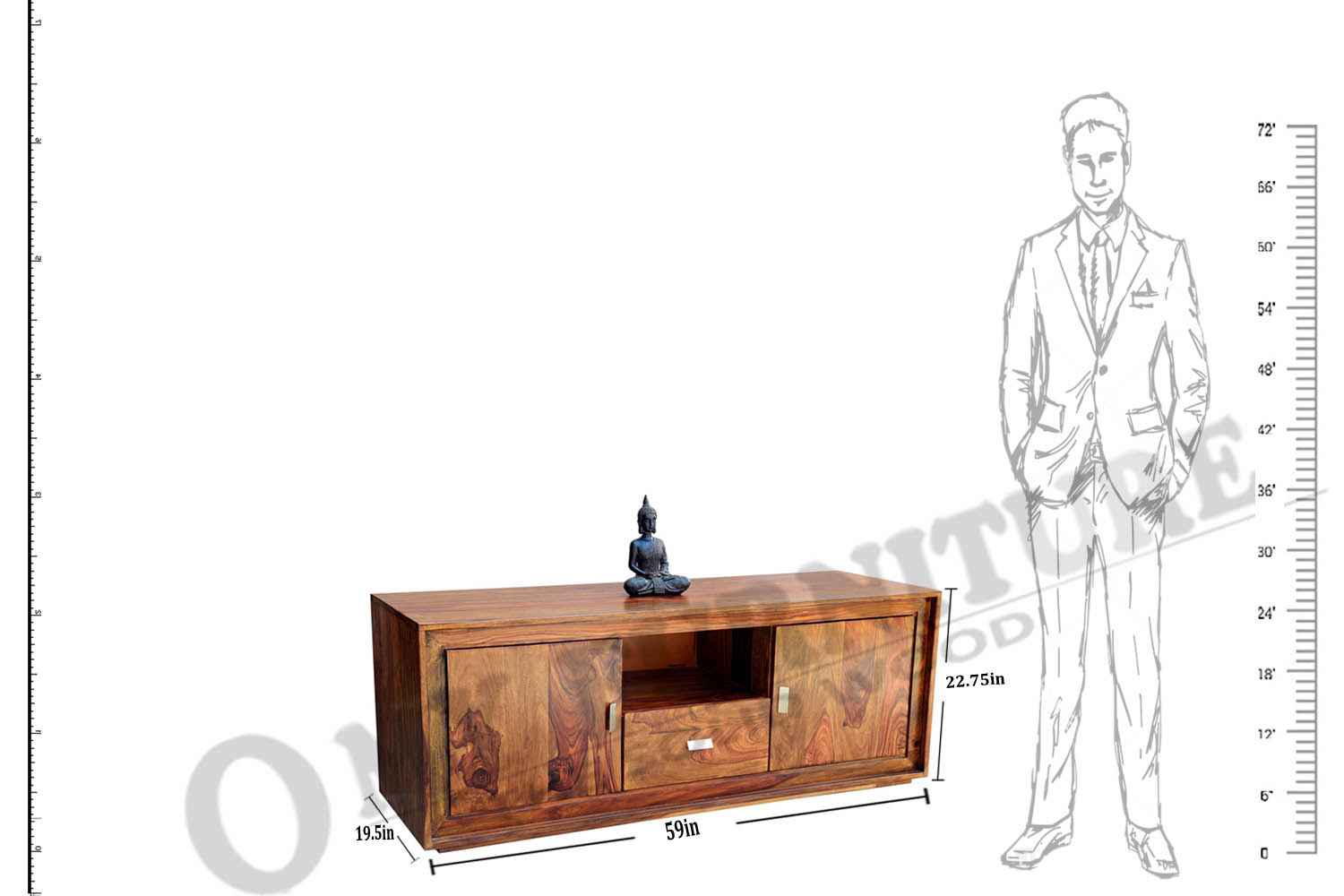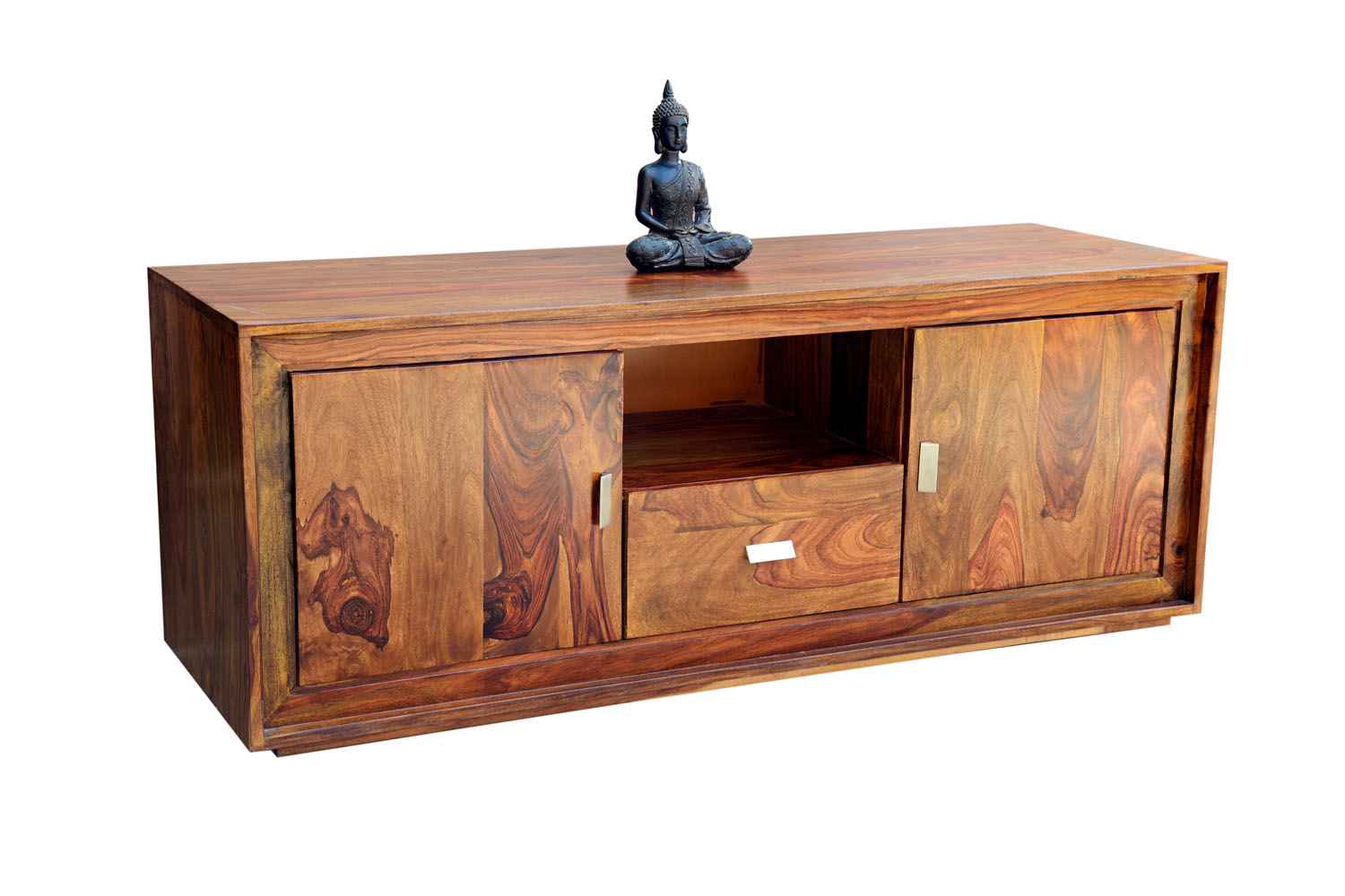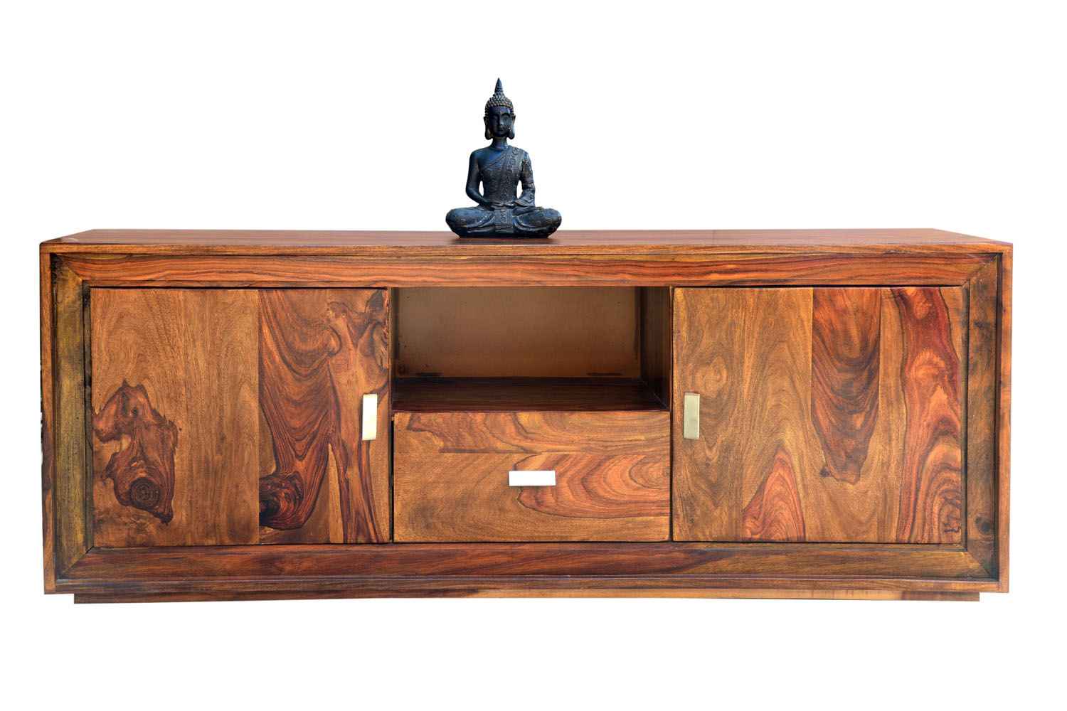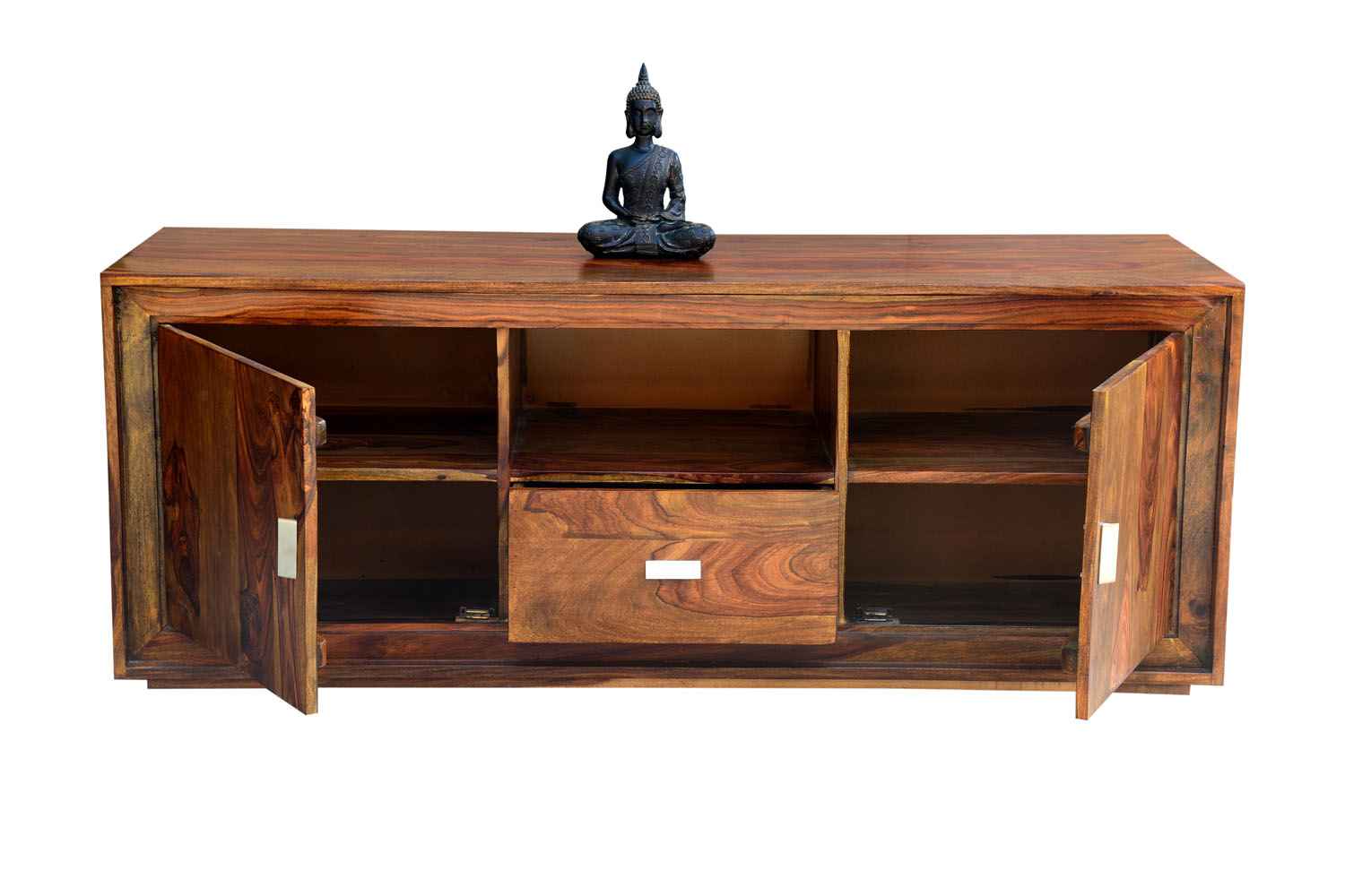 Recto three drawer tv unit is made by Sheesham (Rosewood) with teak finish. It is a television unit that contains three drawers and one blank section. We use Stainless steel accessories. It is a heavy and stable product. Sheesham wood furniture always count as a best quality product to buy.You can buy Solid wood furniture online from O my furniture.