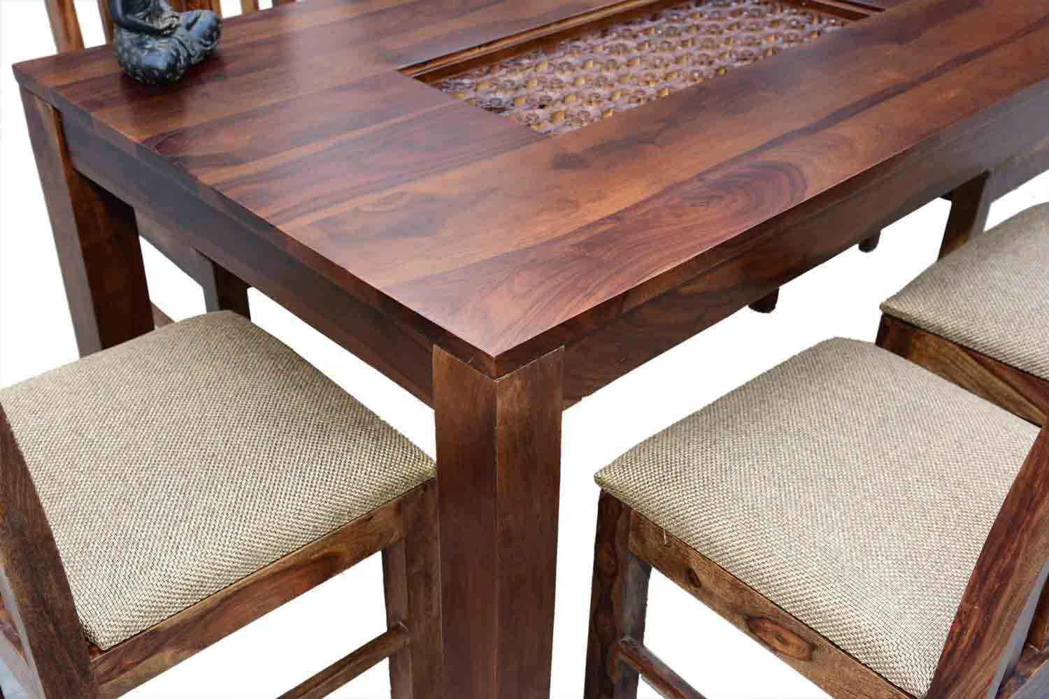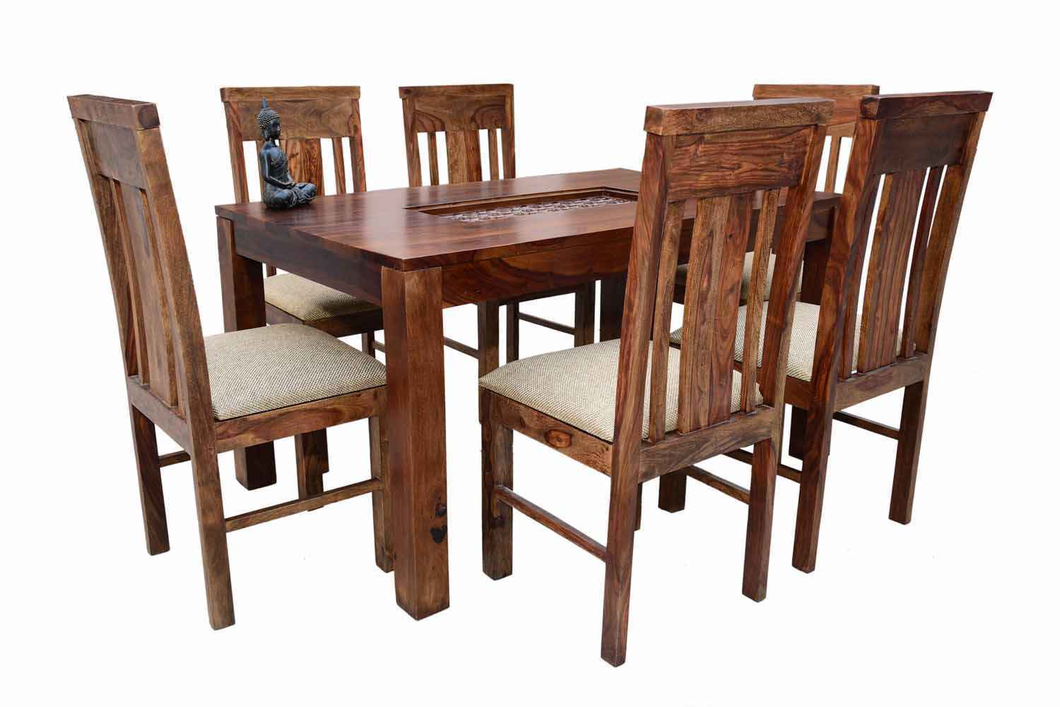 6-Seater pencil Dining table with Upholstery chair set is made by Sheesham(Rosewood) with teak finish.We gave pencil shape design table in leg portion that giving amazing look.It’s top and top support frame divided by a curved line.It is very stable Sheesham wooden dining table set and available in knockdown facility that makes shifting easy.