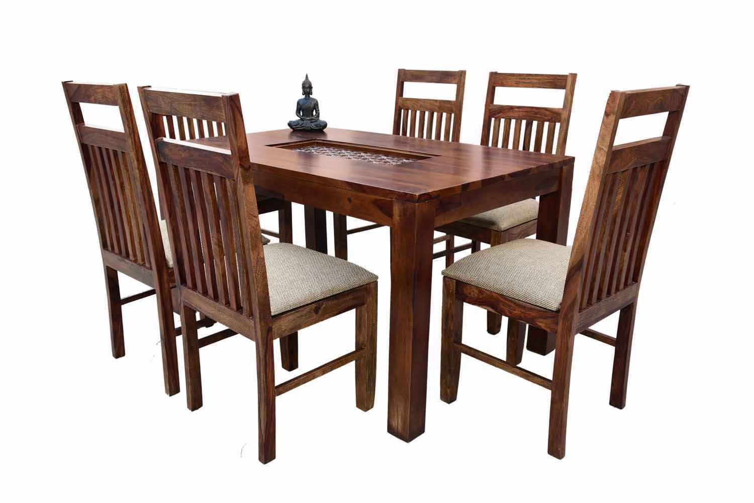 6 Seater Classic Dining Table  Set Small size is made for your sweet home.It is made by Sheesham (Rosewood)with walnut finish. This dining table set is simple and good looking. This design mostly used in small space area.This dining table contains six Sheesham wood chair with teak finish. Sheesham wood furniture is always count in best quality furniture.
