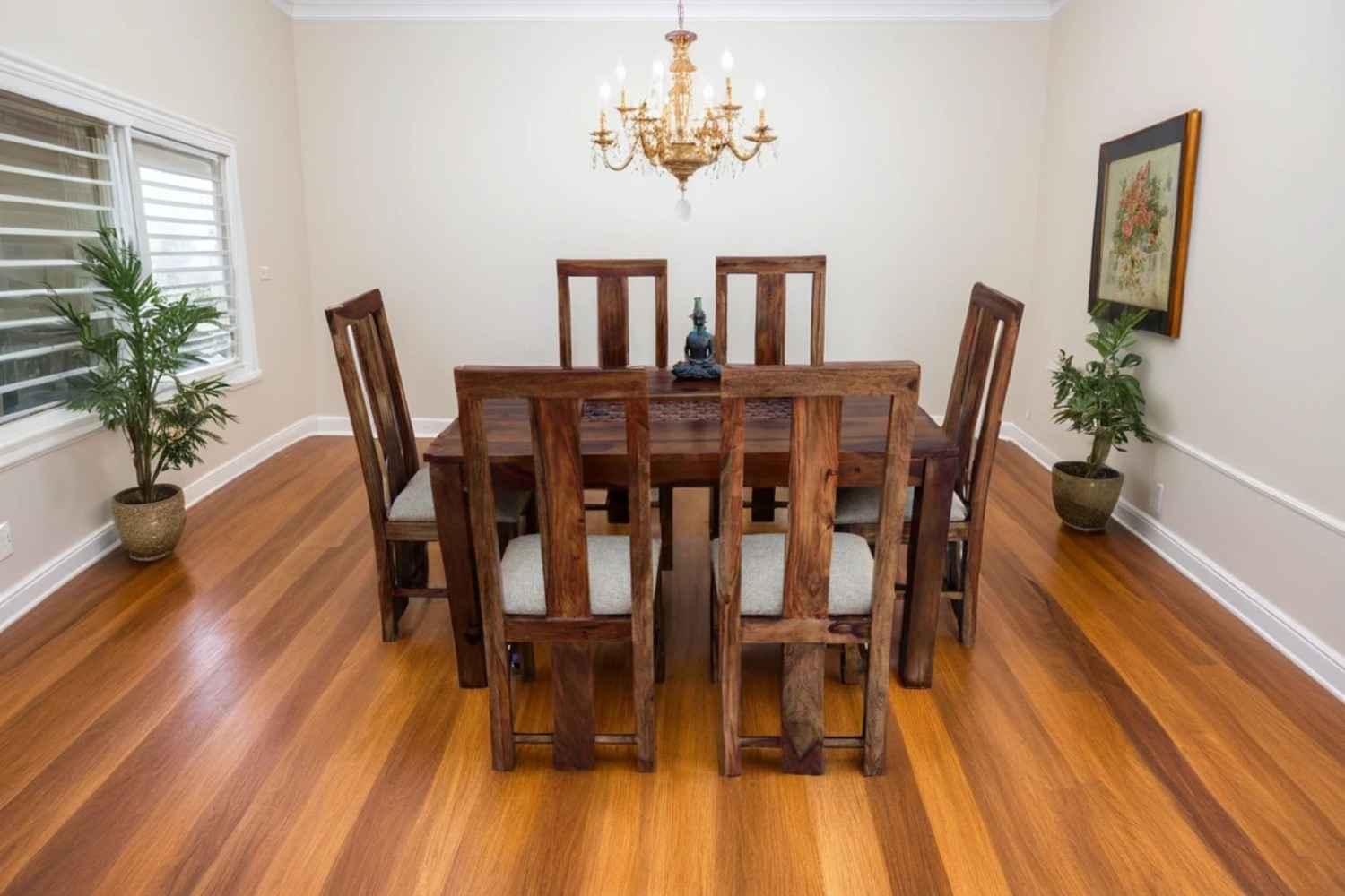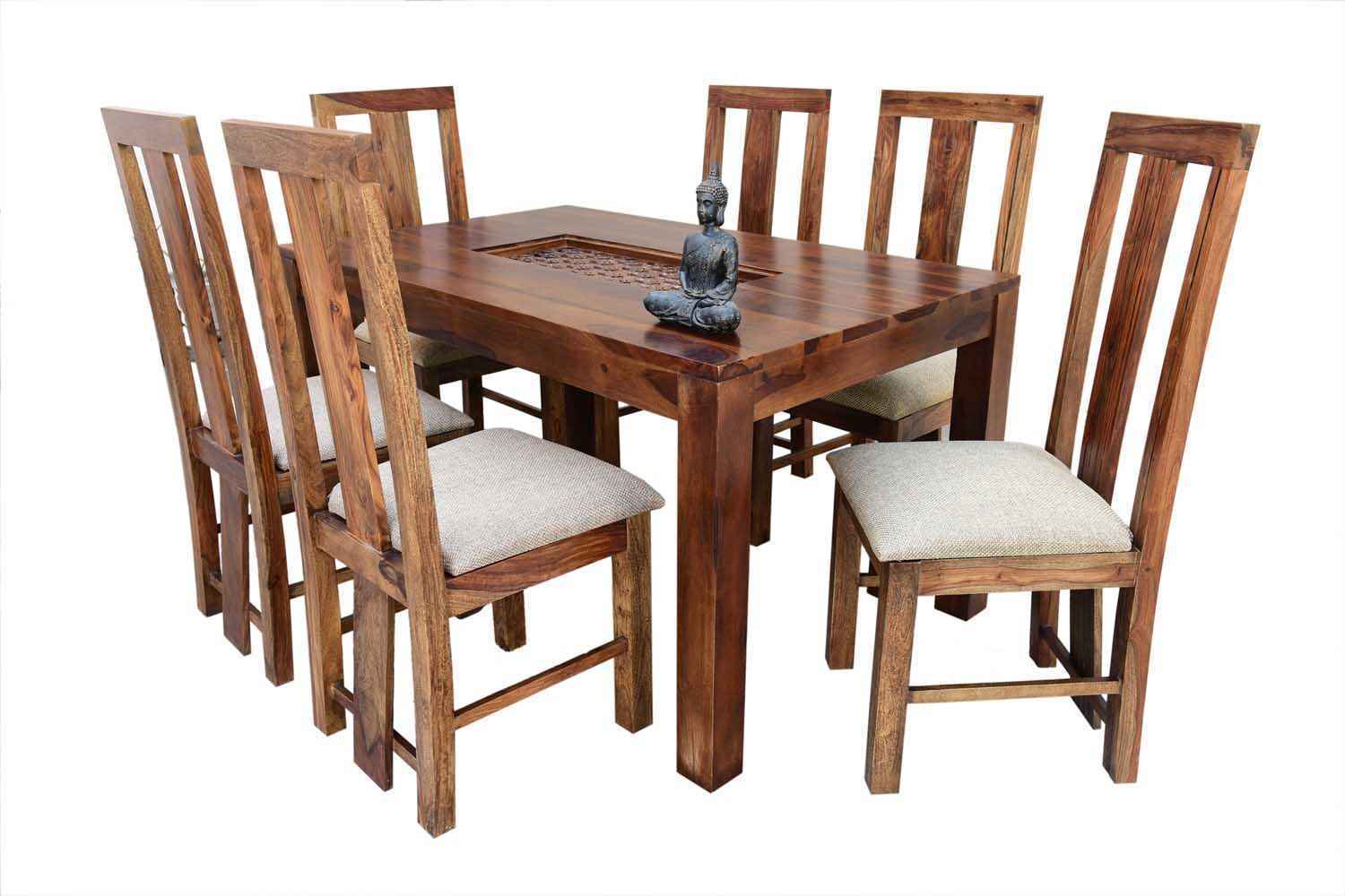 6 Seater Classic Dining Table Set Small size is made for your sweet home.It is made by Sheesham (Rosewood)with walnut finish. This dining table set is simple and good looking. This design mostly used in small space area.This dining table contains six Sheesham wood chair with teak finish. Sheesham wood furniture is always count in best quality furniture.
