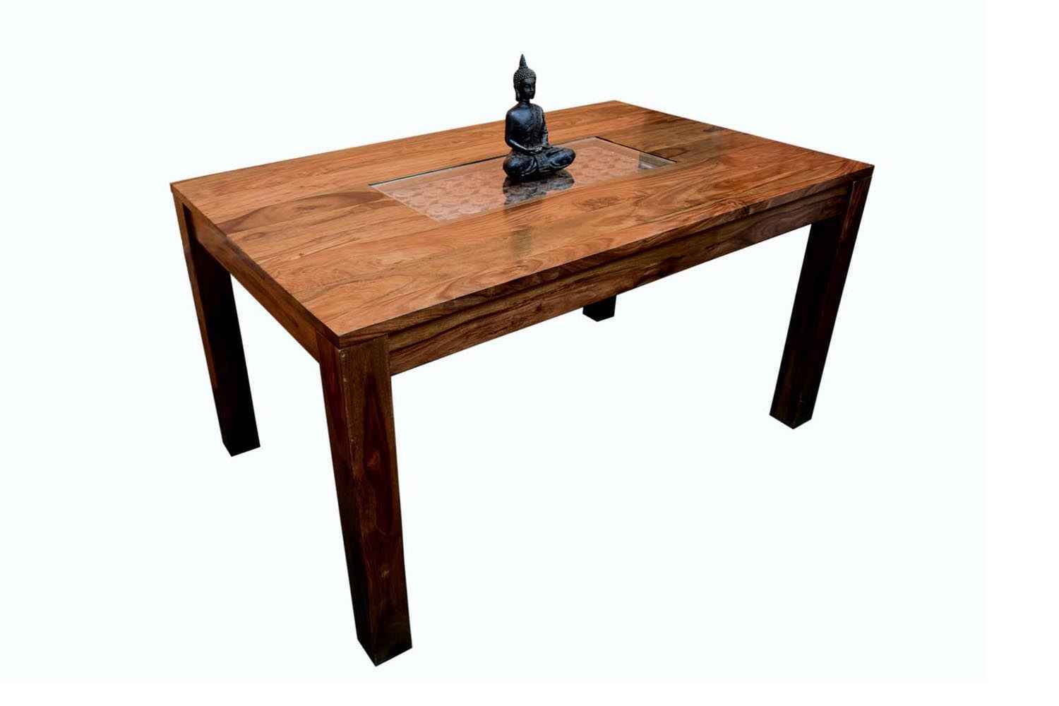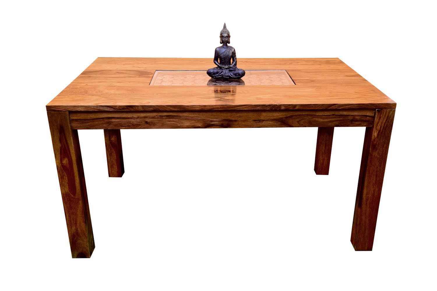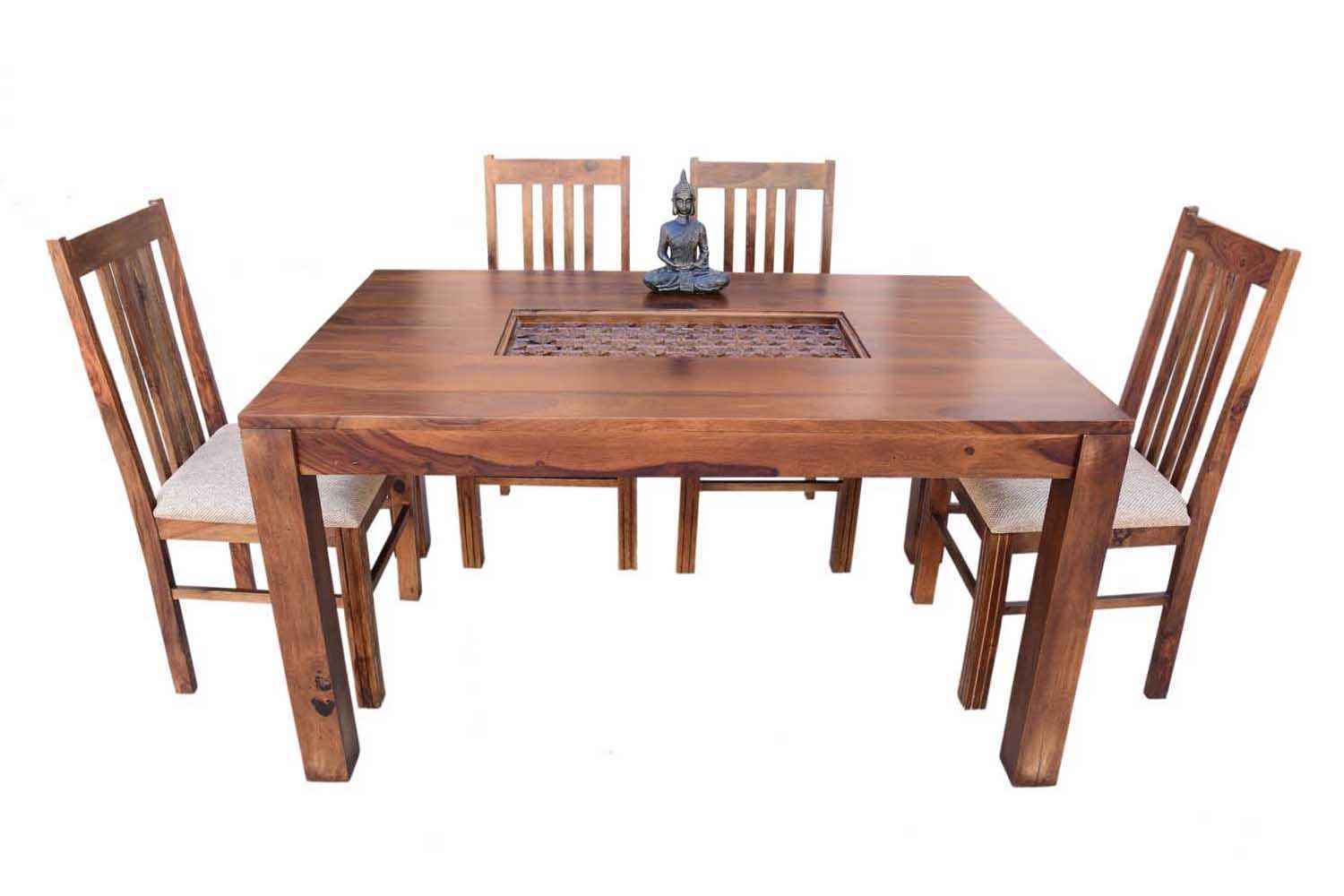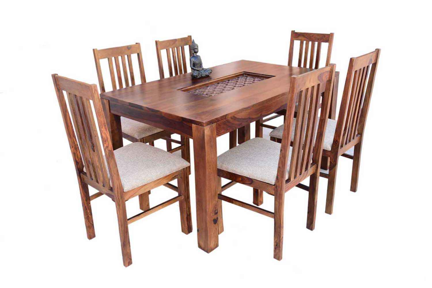 6- Seater Amusable recto carving dining table with Vernal upholstery chair  is made by Sheesham(Rosewood) with teak finish.It is sheesham wood dining table that contains wooden carving covered by glass top in middle portion of it’s top.Its legs are in rectangle shape.It is unique and simple design to make your place beautiful.
