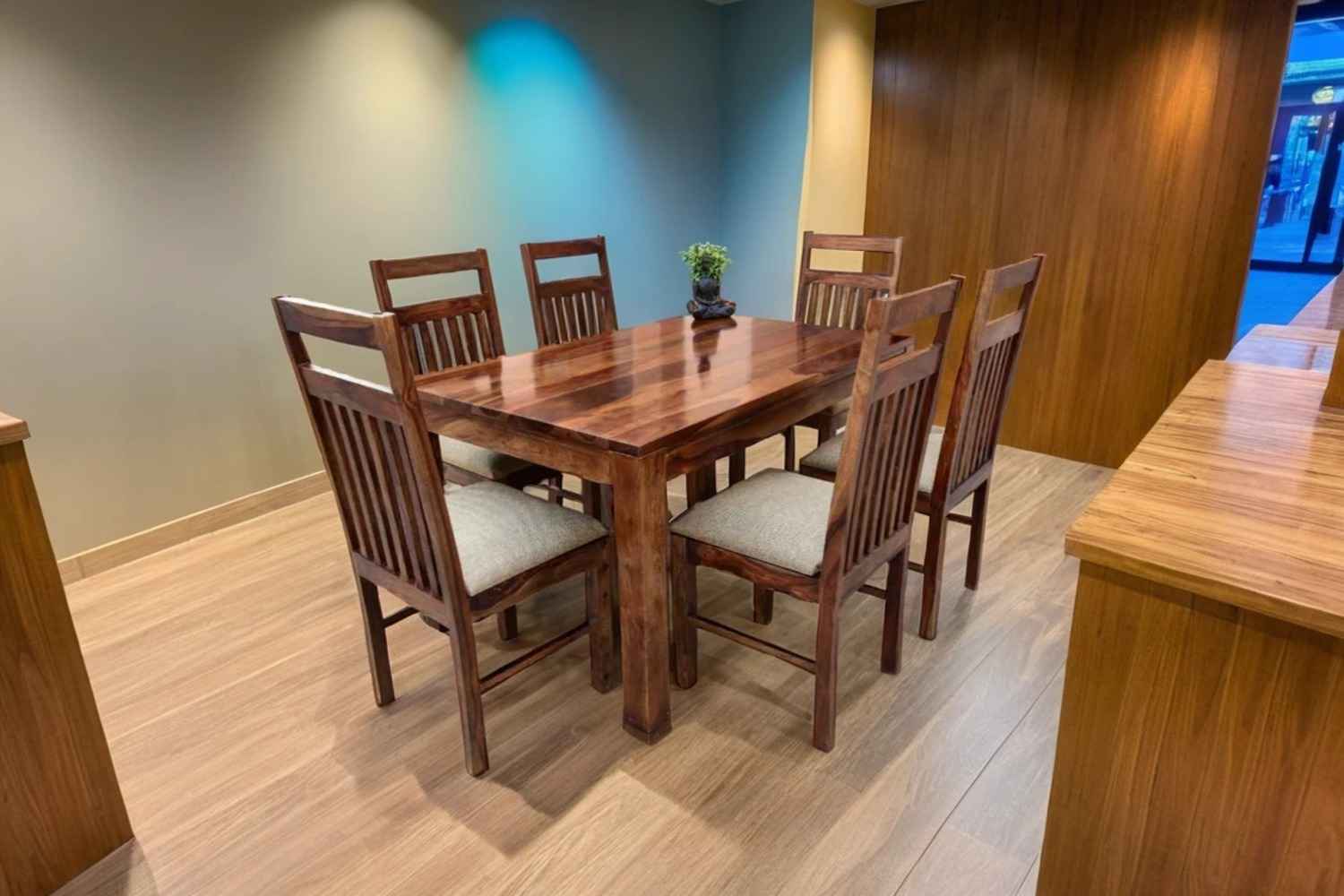 6 Seater Classic Dining Table Set Small size is made for your sweet home.It is made by Sheesham (Rosewood)with walnut finish. This dining table set is simple and good looking. This design mostly used in small space area.This dining table contains six Sheesham wood chair with teak finish. Sheesham wood furniture is always count in best quality furniture.