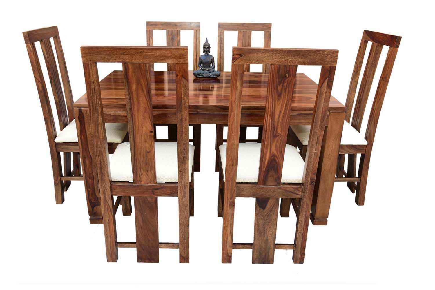 6-Seater pencil Dining table with Upholstery chair set is made by Sheesham(Rosewood) with teak finish.We gave pencil shape design table in leg portion that giving amazing look.It’s top and top support frame divided by a curved line.It is very stable Sheesham wooden dining table set and available in knockdown facility that makes shifting easy.