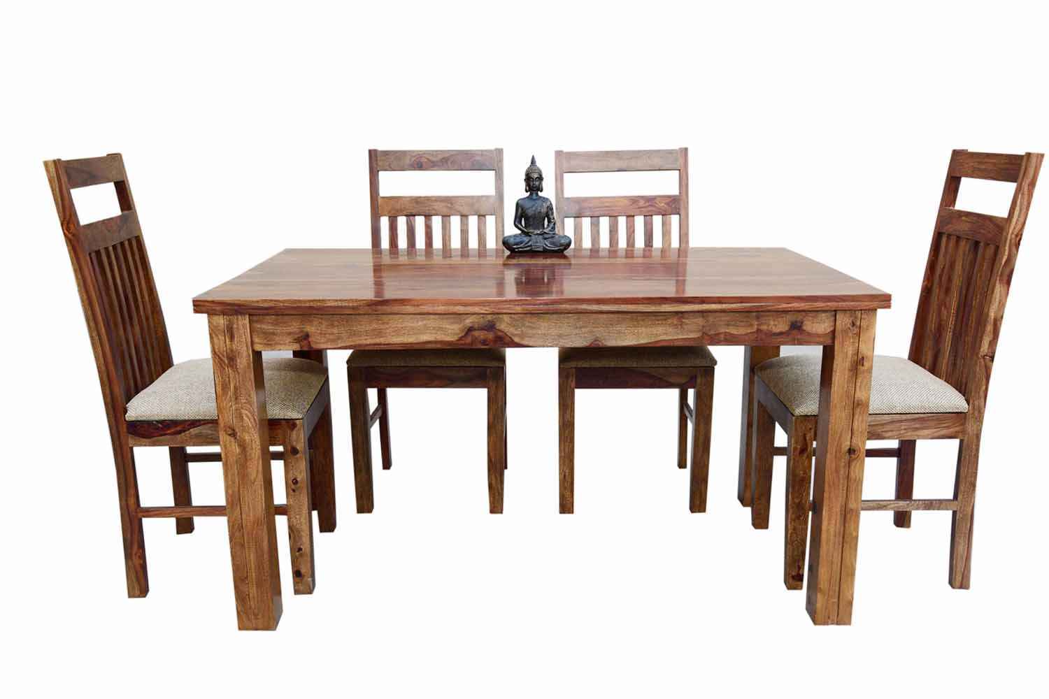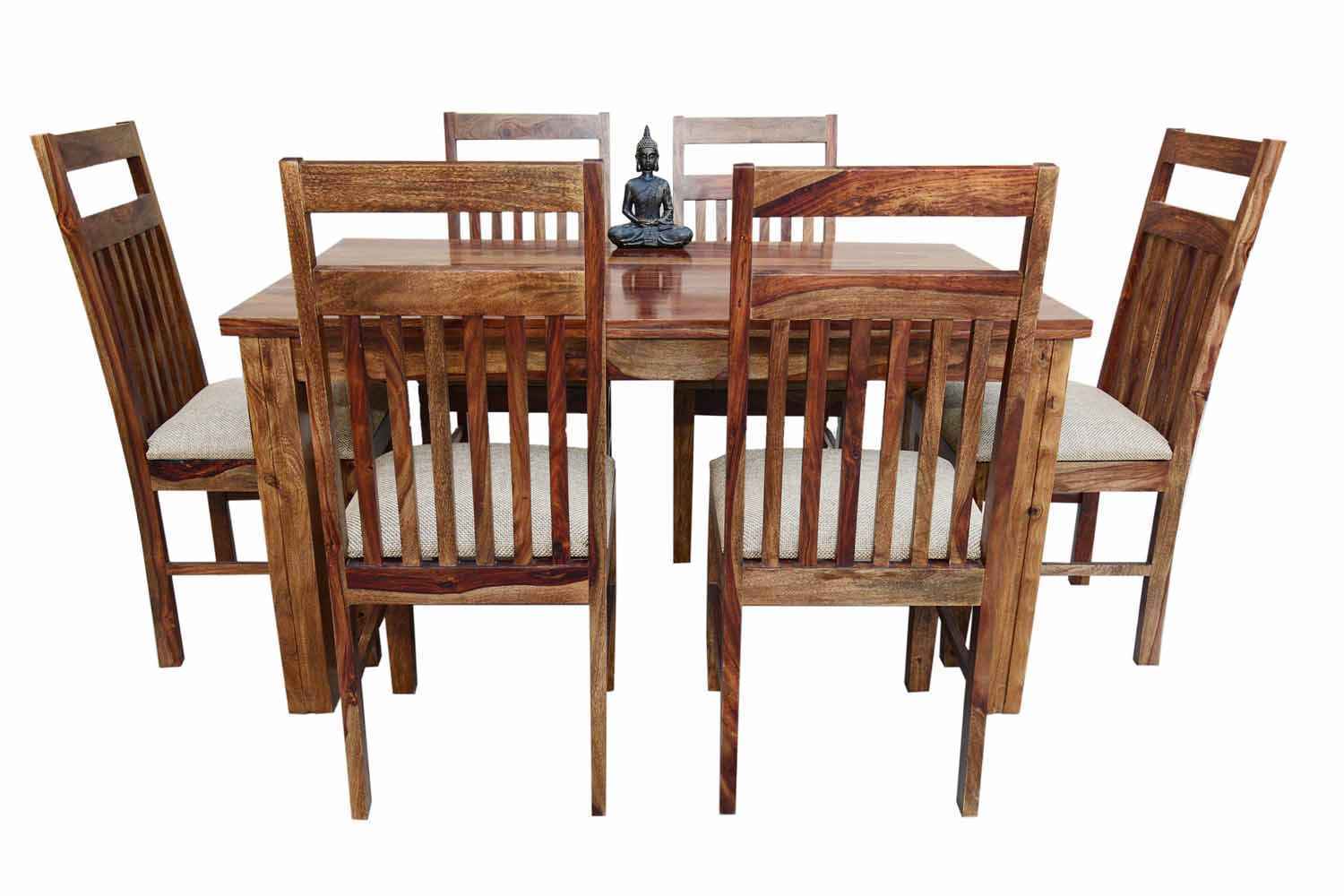 6-Seater pencil Dining table with Upholstery chair set is made by Sheesham(Rosewood) with teak finish.We gave pencil shape design table in leg portion that giving amazing look.It’s top and top support frame divided by a curved line.It is very stable Sheesham wooden dining table set and available in knockdown facility that makes shifting easy.