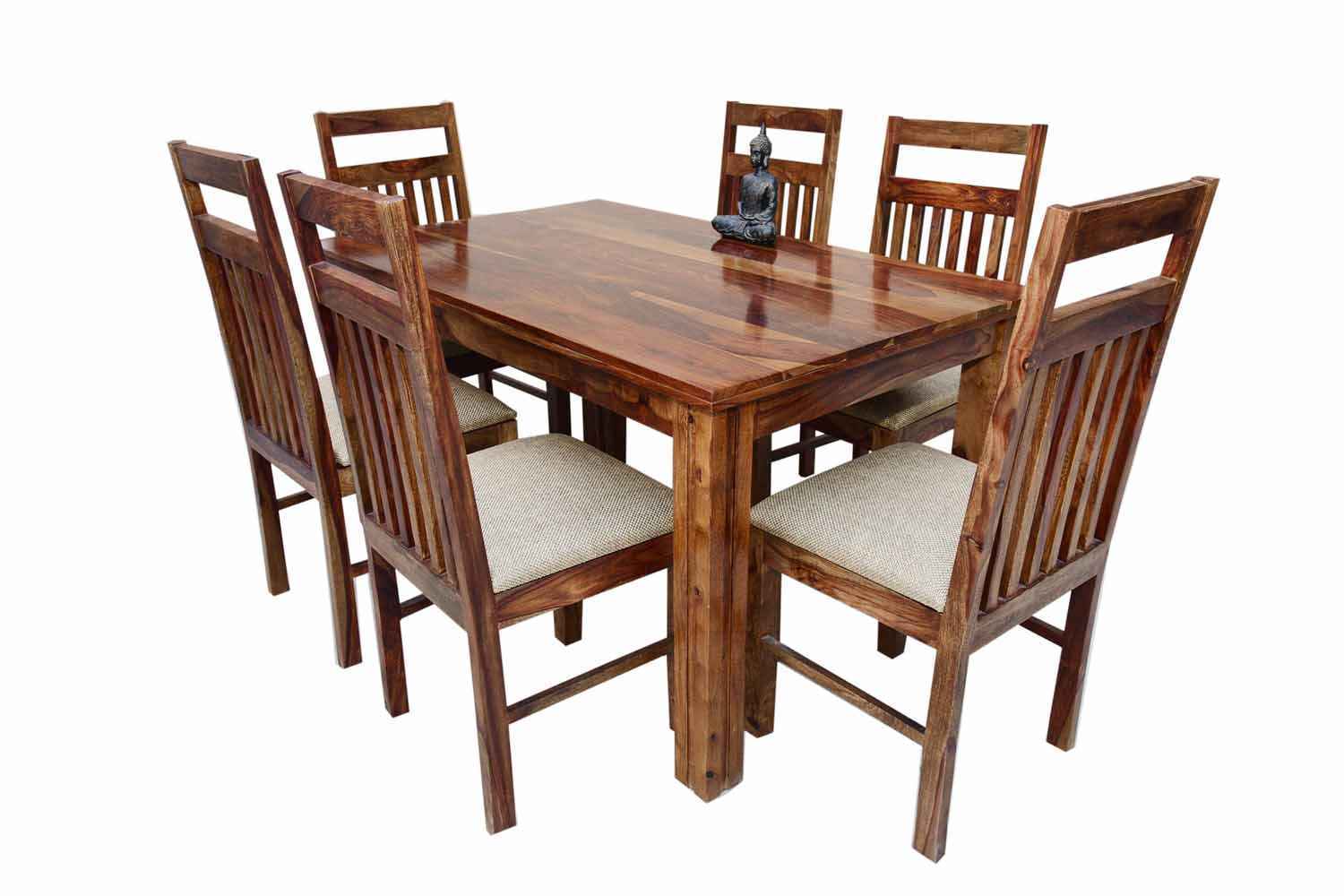 6 Seater Classic Dining Table  Set Small size is made for your sweet home.It is made by Sheesham (Rosewood)with walnut finish. This dining table set is simple and good looking. This design mostly used in small space area.This dining table contains six Sheesham wood chair with teak finish. Sheesham wood furniture is always count in best quality furniture.