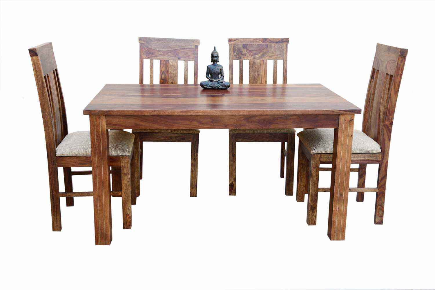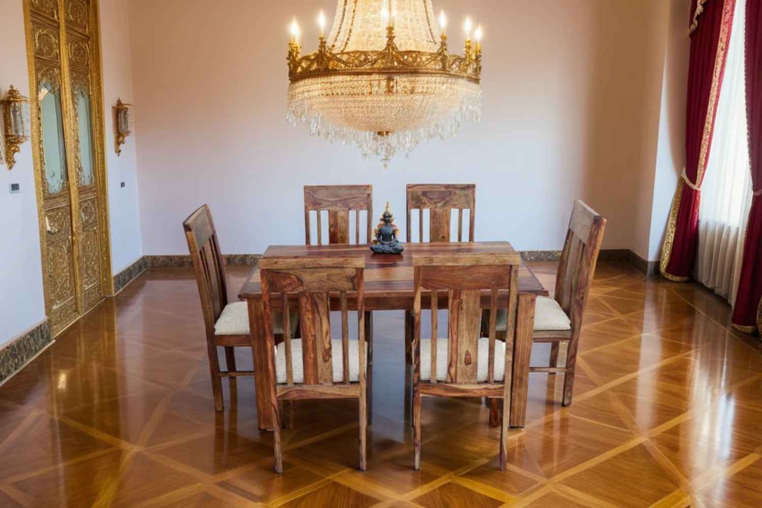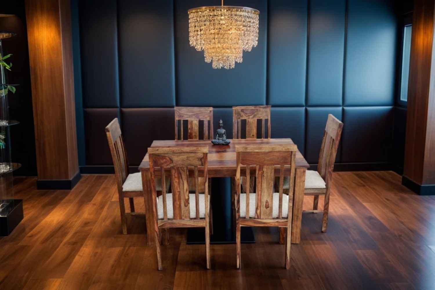 6 Seater Classic Dining Table Set Small size is made for your sweet home.It is made by Sheesham (Rosewood)with walnut finish. This dining table set is simple and good looking. This design mostly used in small space area.This dining table contains six Sheesham wood chair with teak finish. Sheesham wood furniture is always count in best quality furniture.