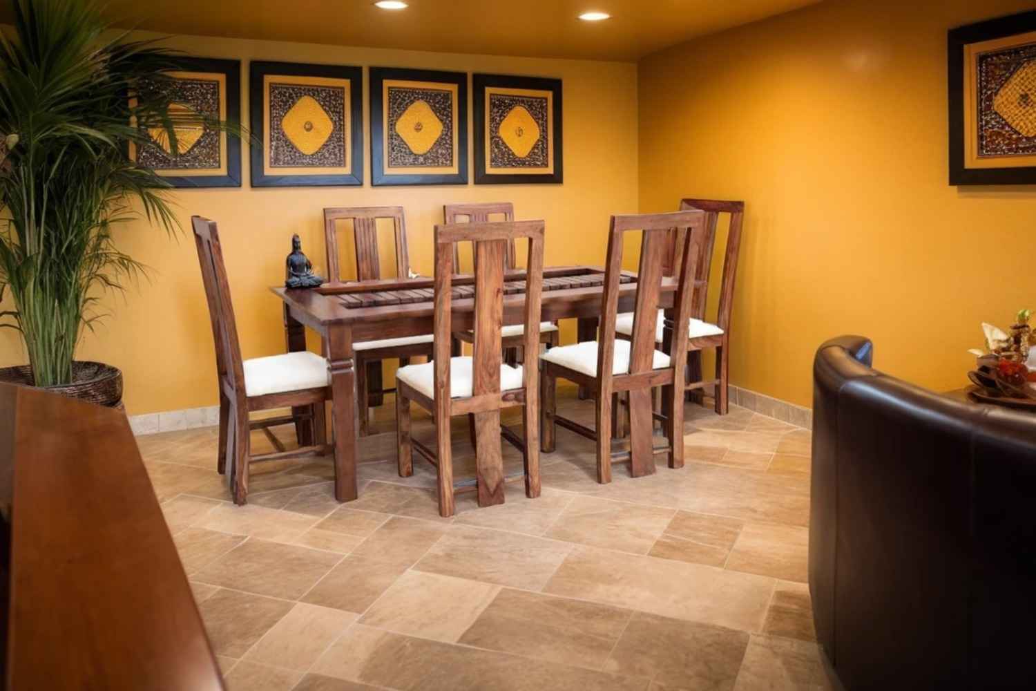 6-Seater pencil Dining table with Upholstery chair set is made by Sheesham(Rosewood) with teak finish.We gave pencil shape design table in leg portion that giving amazing look.It’s top and top support frame divided by a curved line.It is very stable Sheesham wooden dining table set and available in knockdown facility that makes shifting easy.