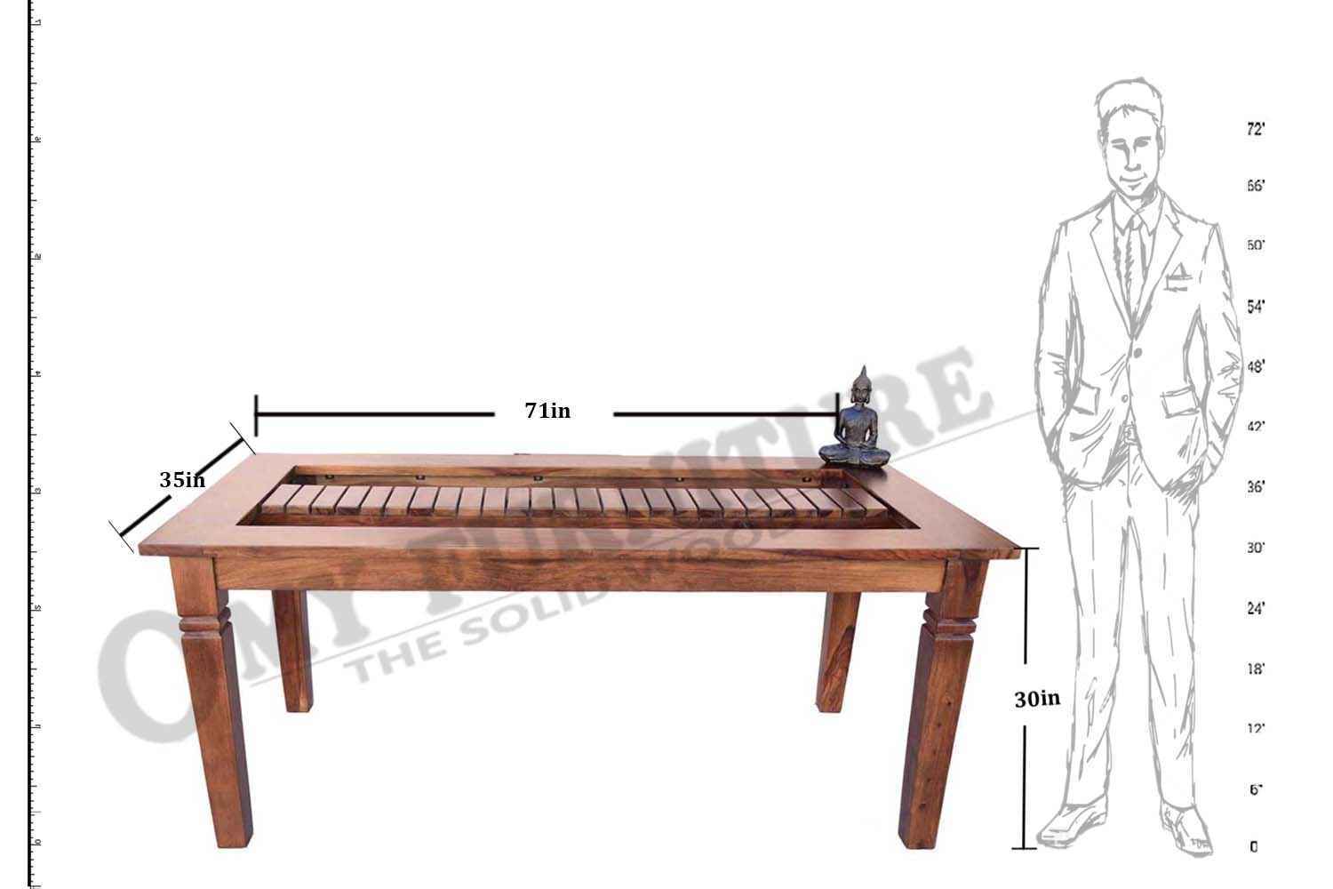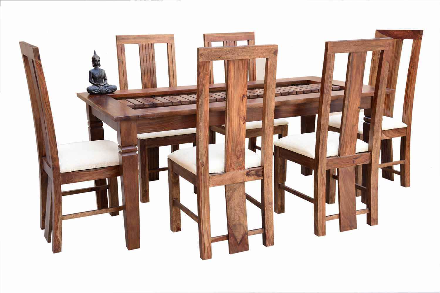 6 Seater Quondam Dining Table Set is made by old wood with walnut finish.It is six sitting dining table with rough finish.legs are attach with top that giving a antique rough look. This dining table contain six Sheesham wood chair with walnut finish. Sheesham wood furniture always count as a best quality and reliable product.