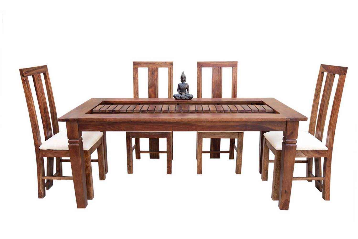 4 seater swingo dining table with Elpho brown upholstery chair set is made by Sheesham (Rosewood) with teak finish.It is four seater dining table.Carving work separates its design from others.Its top design is very unique.We gave rectangle shape hole in both side of top carving and all top area covered by transparent glass.It is available in knockdown facility that makes easy shifting. (WE ARE NOT PROVIDING GLASS WITH THIS DINING TABLE)