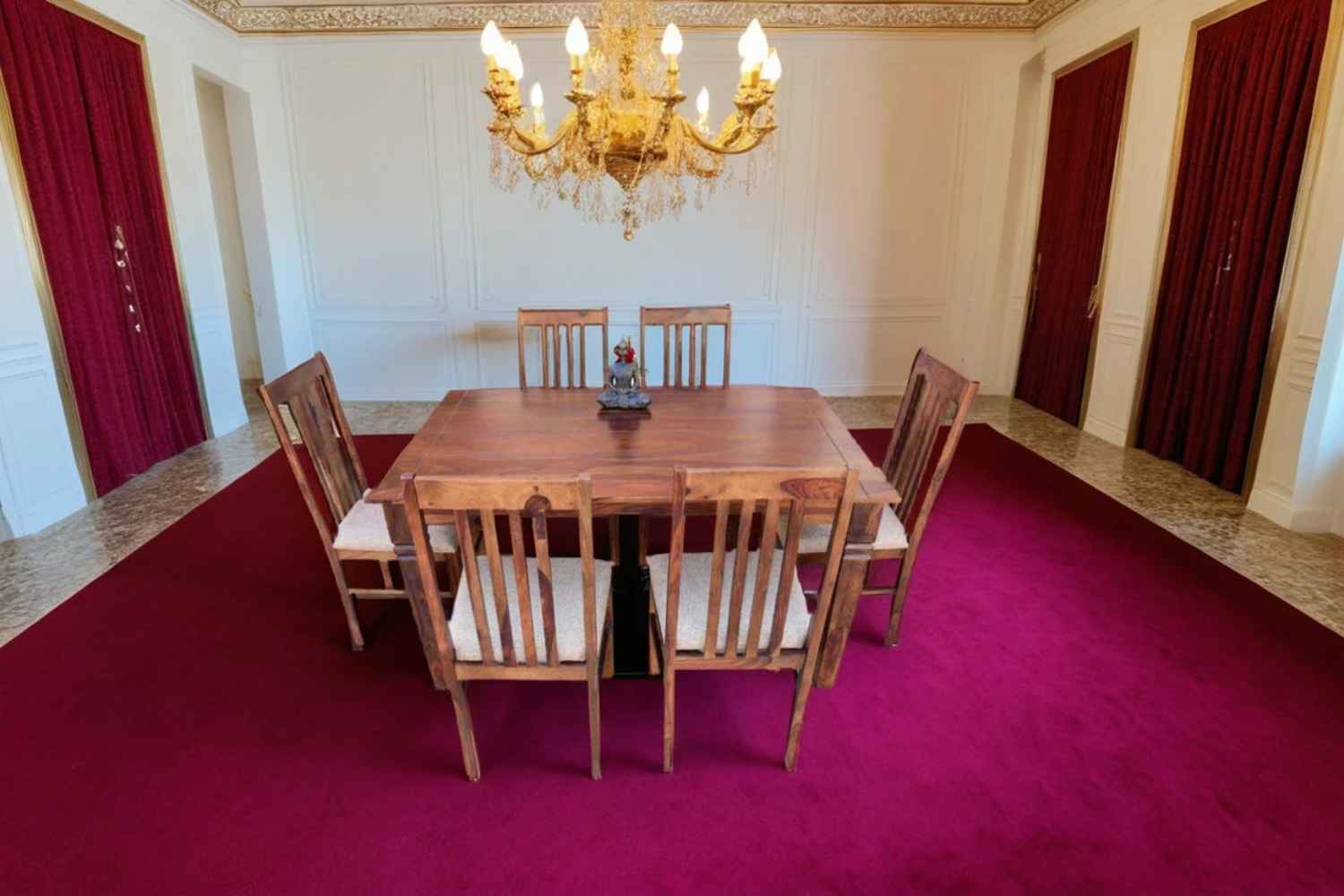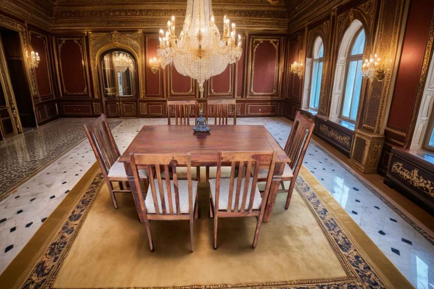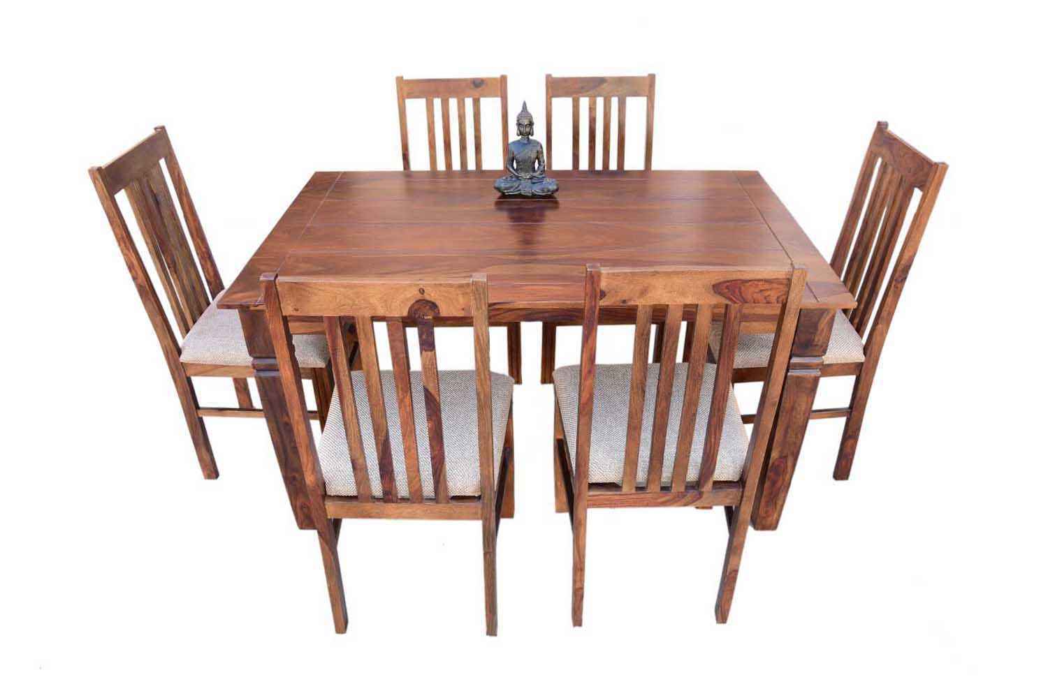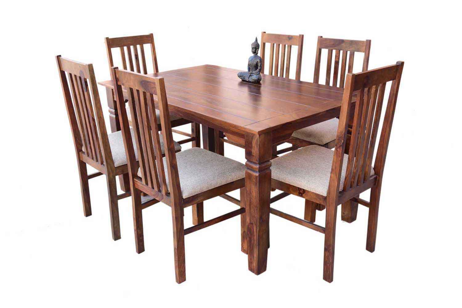 6 Seater Classic Dining Table Set Small size is made for your sweet home.It is made by Sheesham (Rosewood)with walnut finish. This dining table set is simple and good looking. This design mostly used in small space area.This dining table contains six Sheesham wood chair with teak finish. Sheesham wood furniture is always count in best quality furniture.