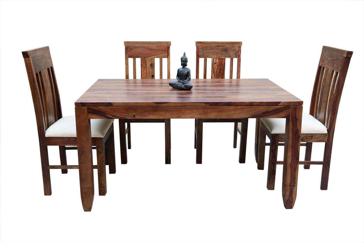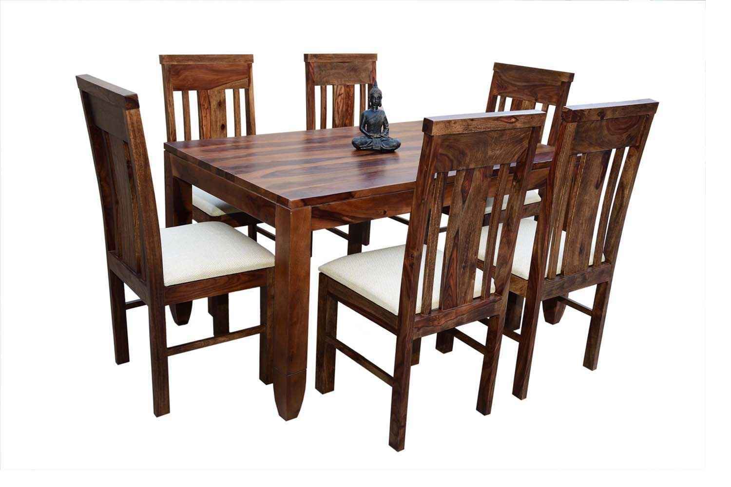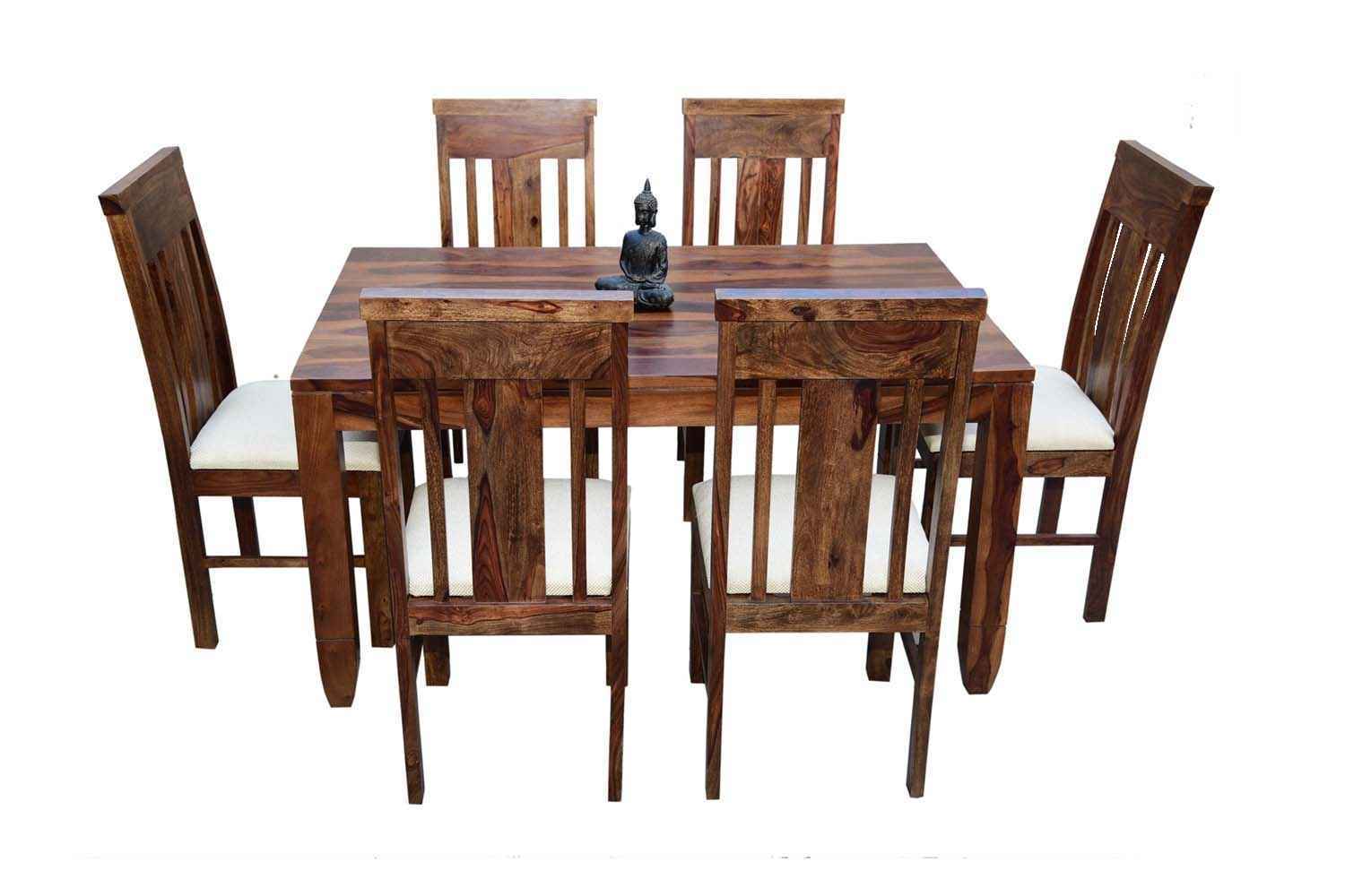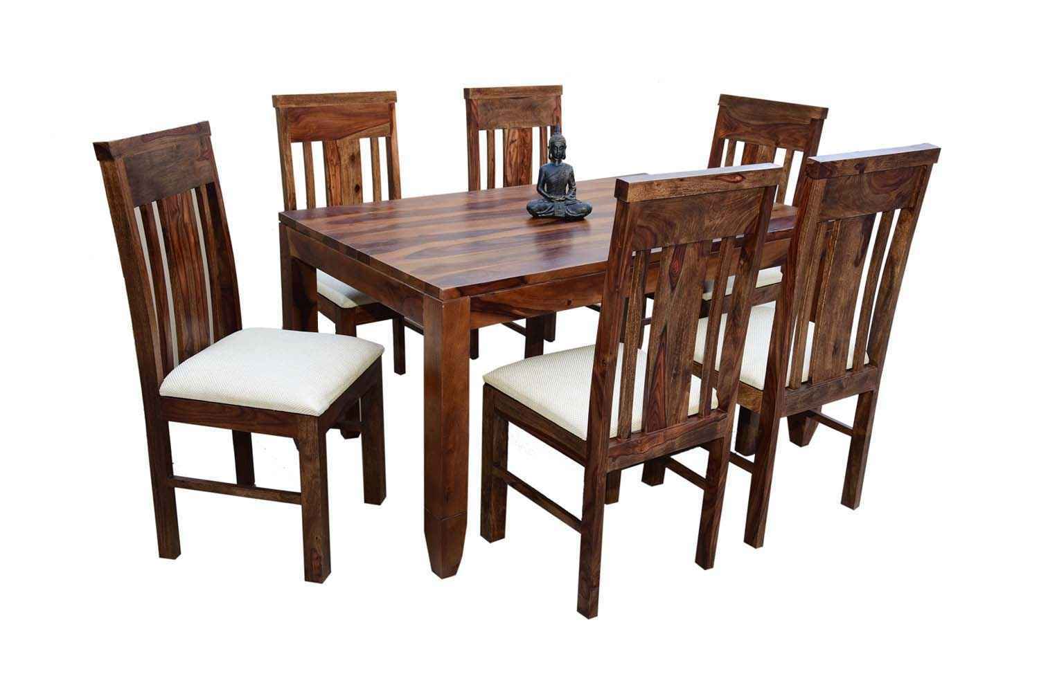 6 Seater Classic Dining Table Set Small size is made for your sweet home.It is made by Sheesham (Rosewood)with walnut finish. This dining table set is simple and good looking. This design mostly used in small space area.This dining table contains six Sheesham wood chair with teak finish. Sheesham wood furniture is always count in best quality furniture.
