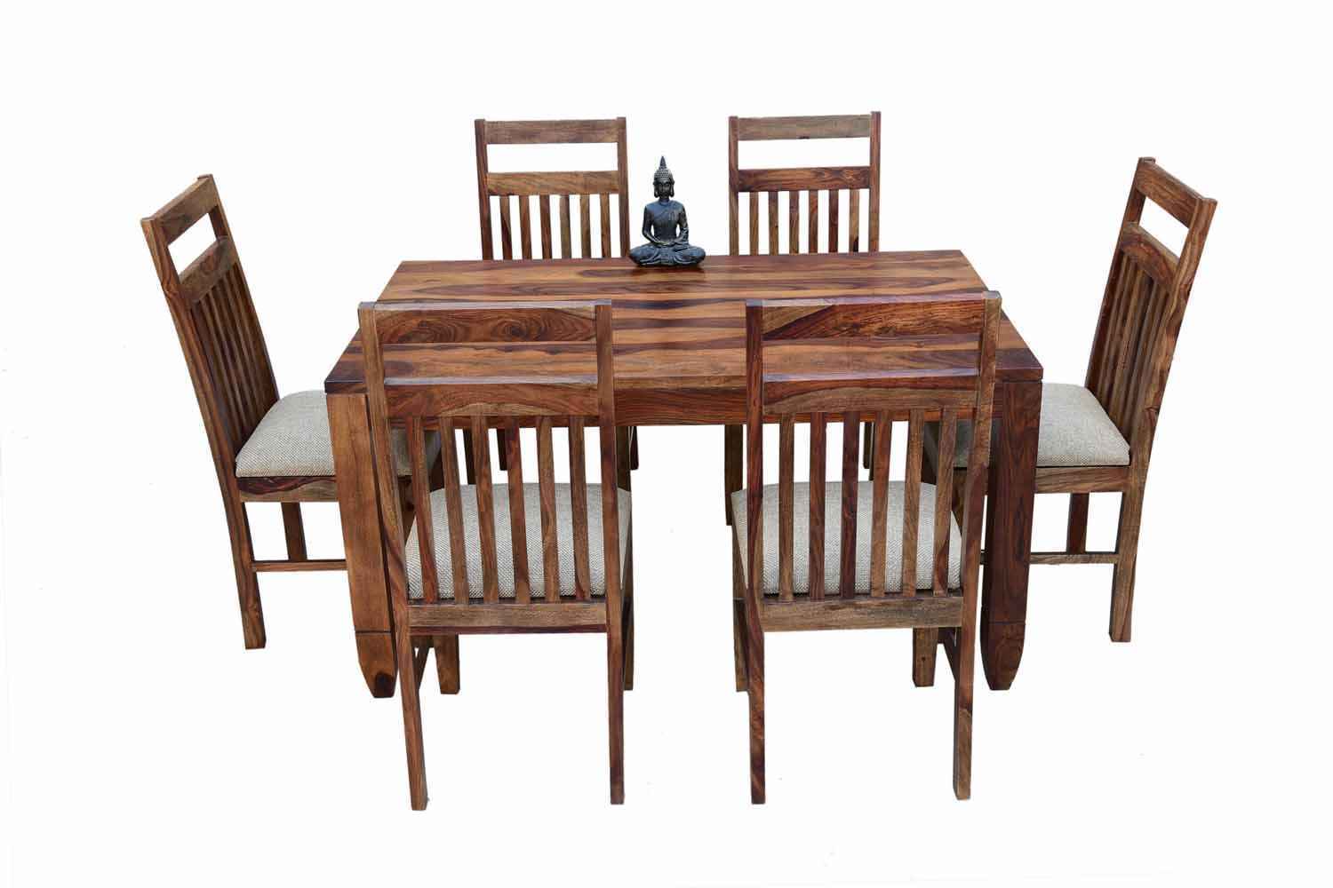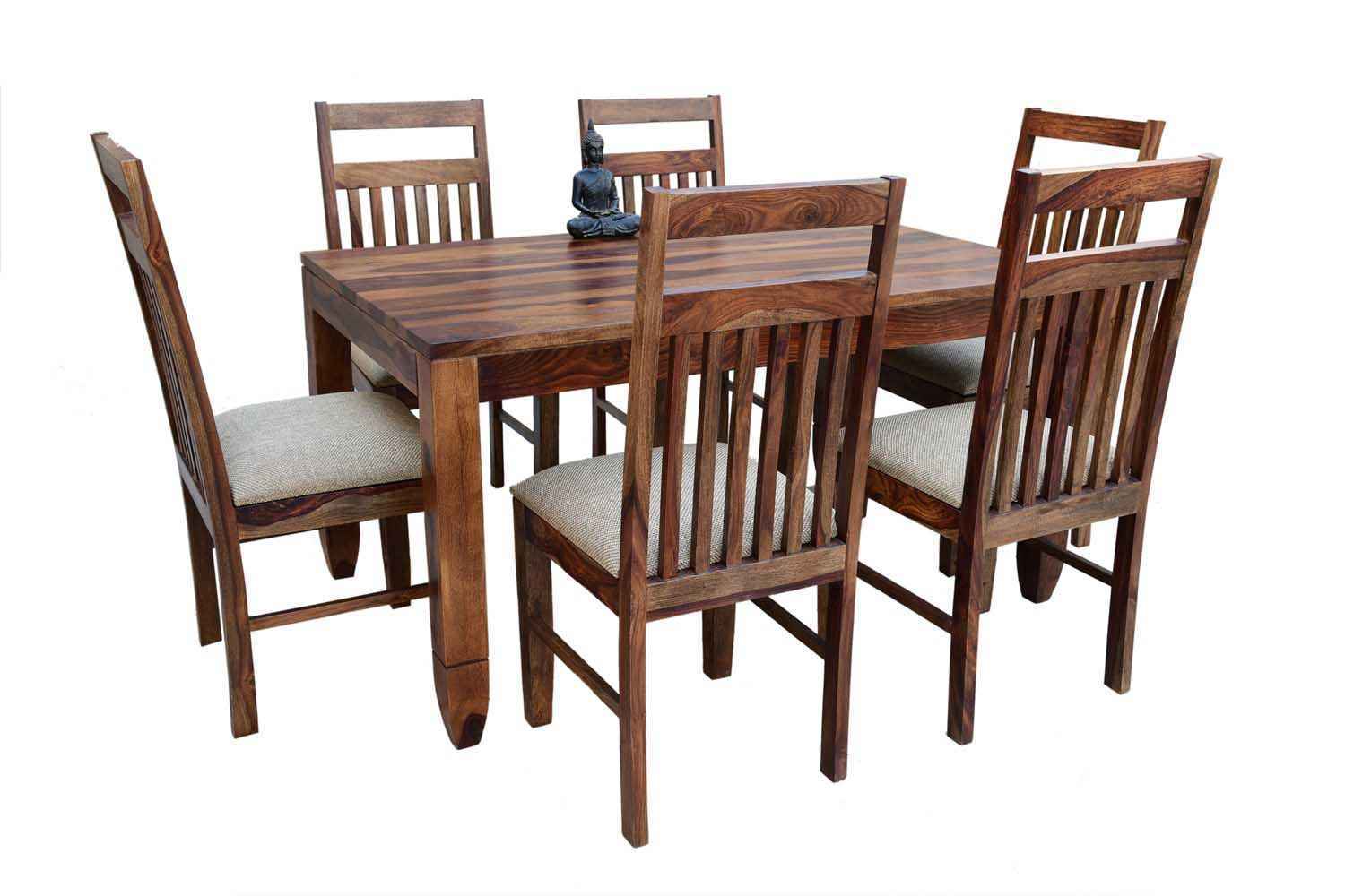 6 Seater Classic Dining Table Set Small size is made for your sweet home.It is made by Sheesham (Rosewood)with walnut finish. This dining table set is simple and good looking. This design mostly used in small space area.This dining table contains six Sheesham wood chair with teak finish. Sheesham wood furniture is always count in best quality furniture.