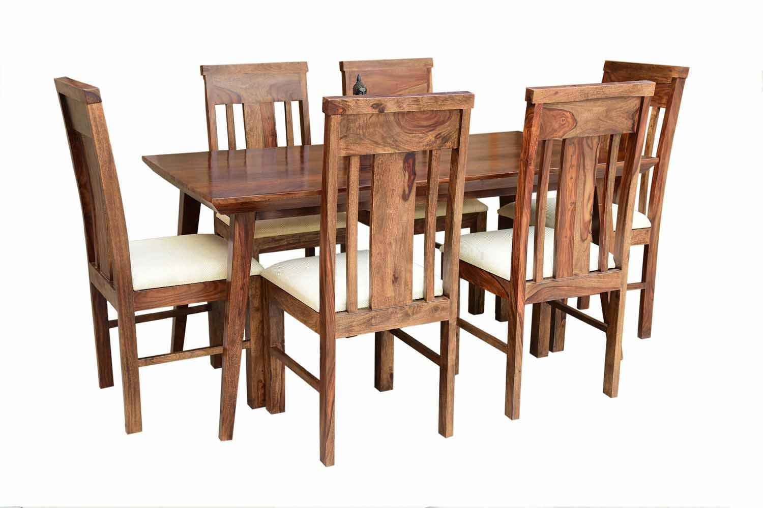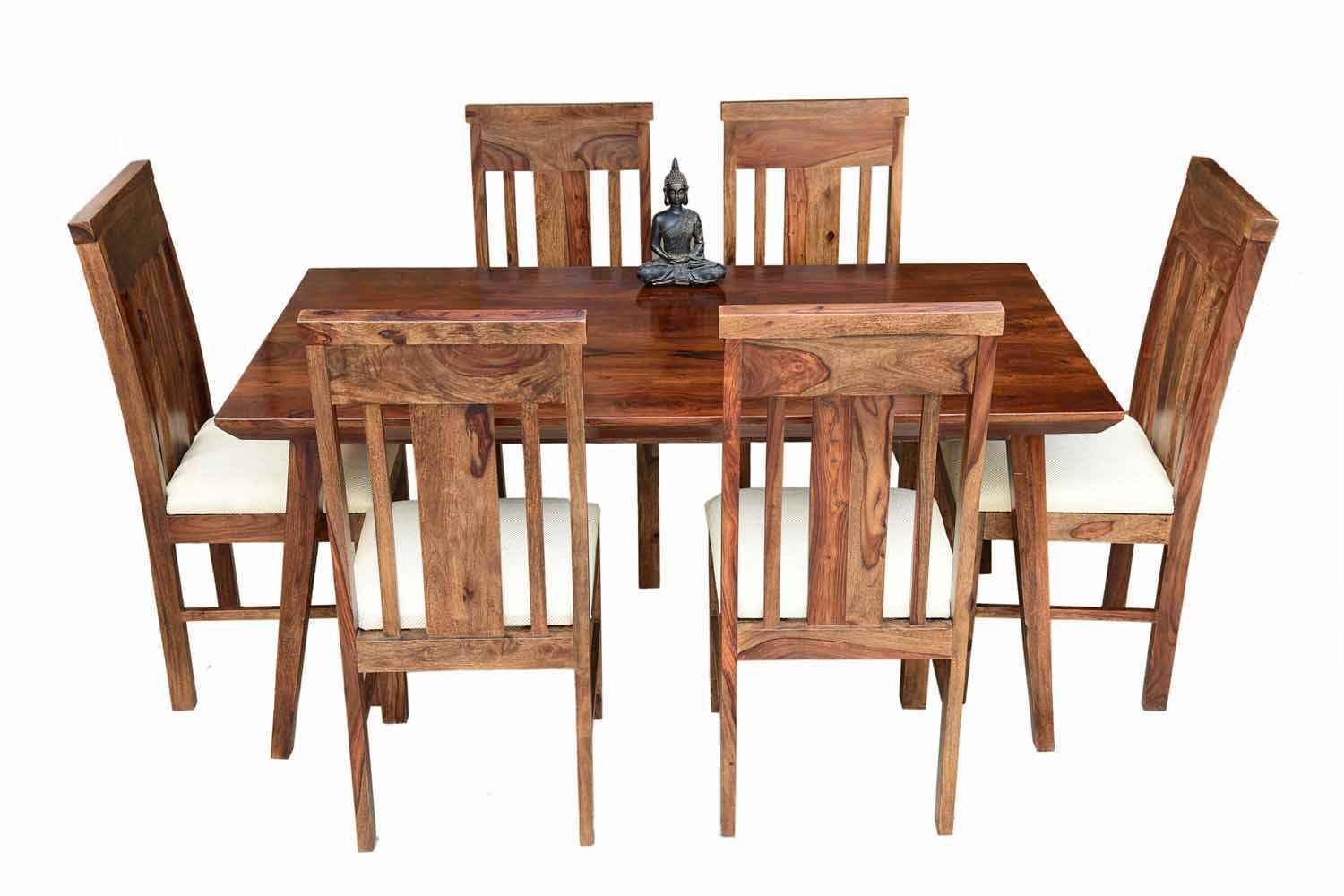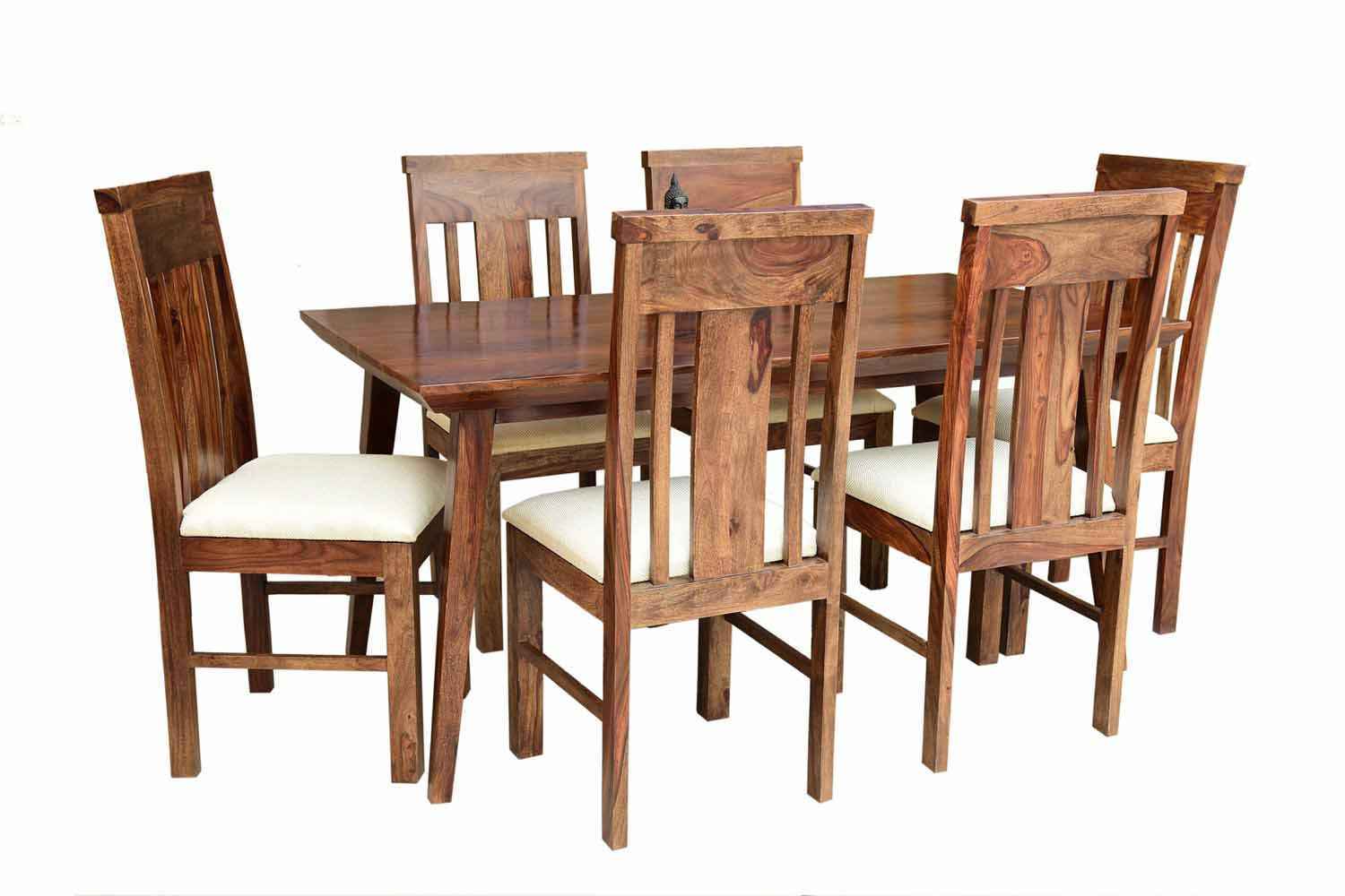 6 Seater Classic Dining Table Set Small size is made for your sweet home.It is made by Sheesham (Rosewood)with walnut finish. This dining table set is simple and good looking. This design mostly used in small space area.This dining table contains six Sheesham wood chair with teak finish. Sheesham wood furniture is always count in best quality furniture.