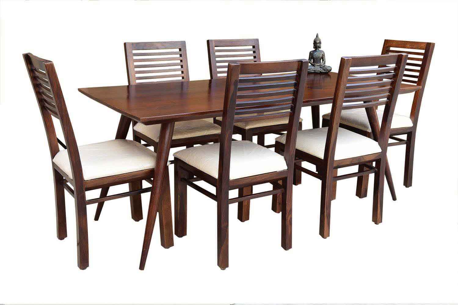 6-Seater pencil Dining table with Upholstery chair set is made by Sheesham(Rosewood) with teak finish.We gave pencil shape design table in leg portion that giving amazing look.It’s top and top support frame divided by a curved line.It is very stable Sheesham wooden dining table set and available in knockdown facility that makes shifting easy.