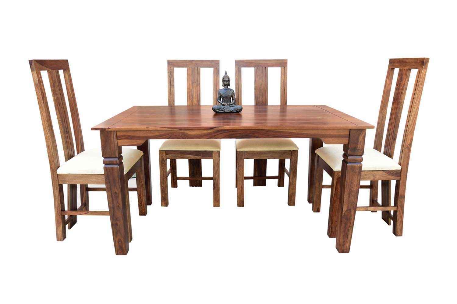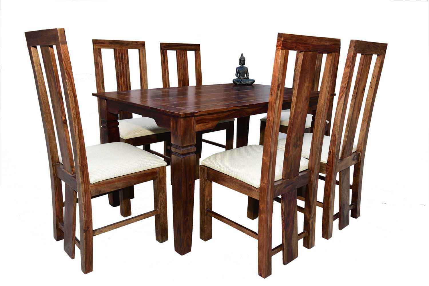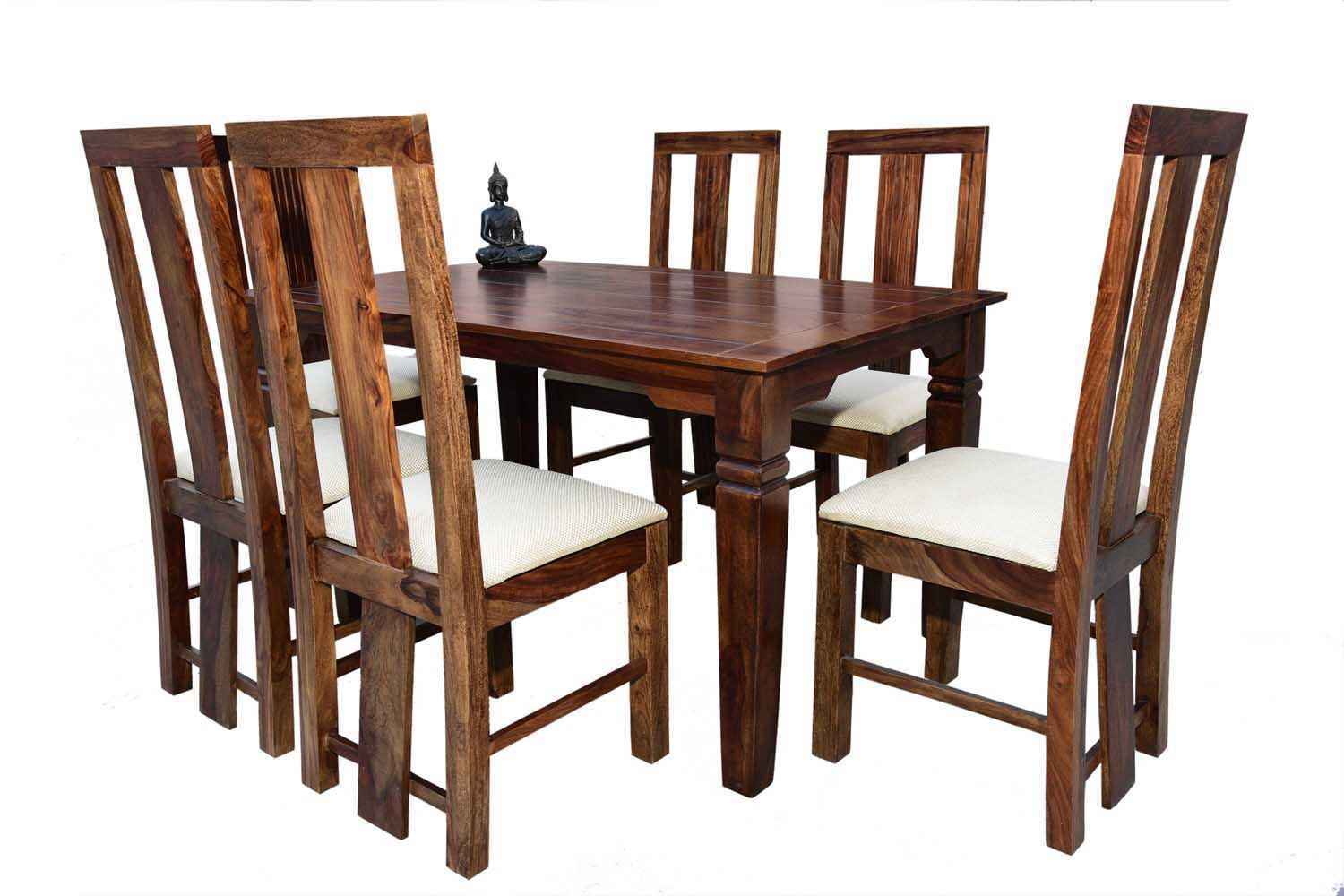 6 Seater Classic Dining Table Set Small size is made for your sweet home.It is made by Sheesham (Rosewood)with walnut finish. This dining table set is simple and good looking. This design mostly used in small space area.This dining table contains six Sheesham wood chair with teak finish. Sheesham wood furniture is always count in best quality furniture.