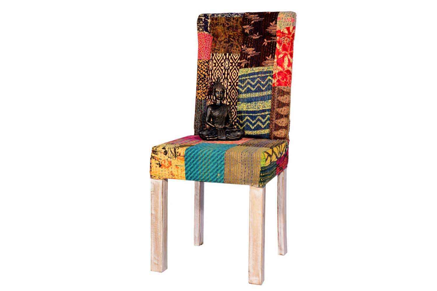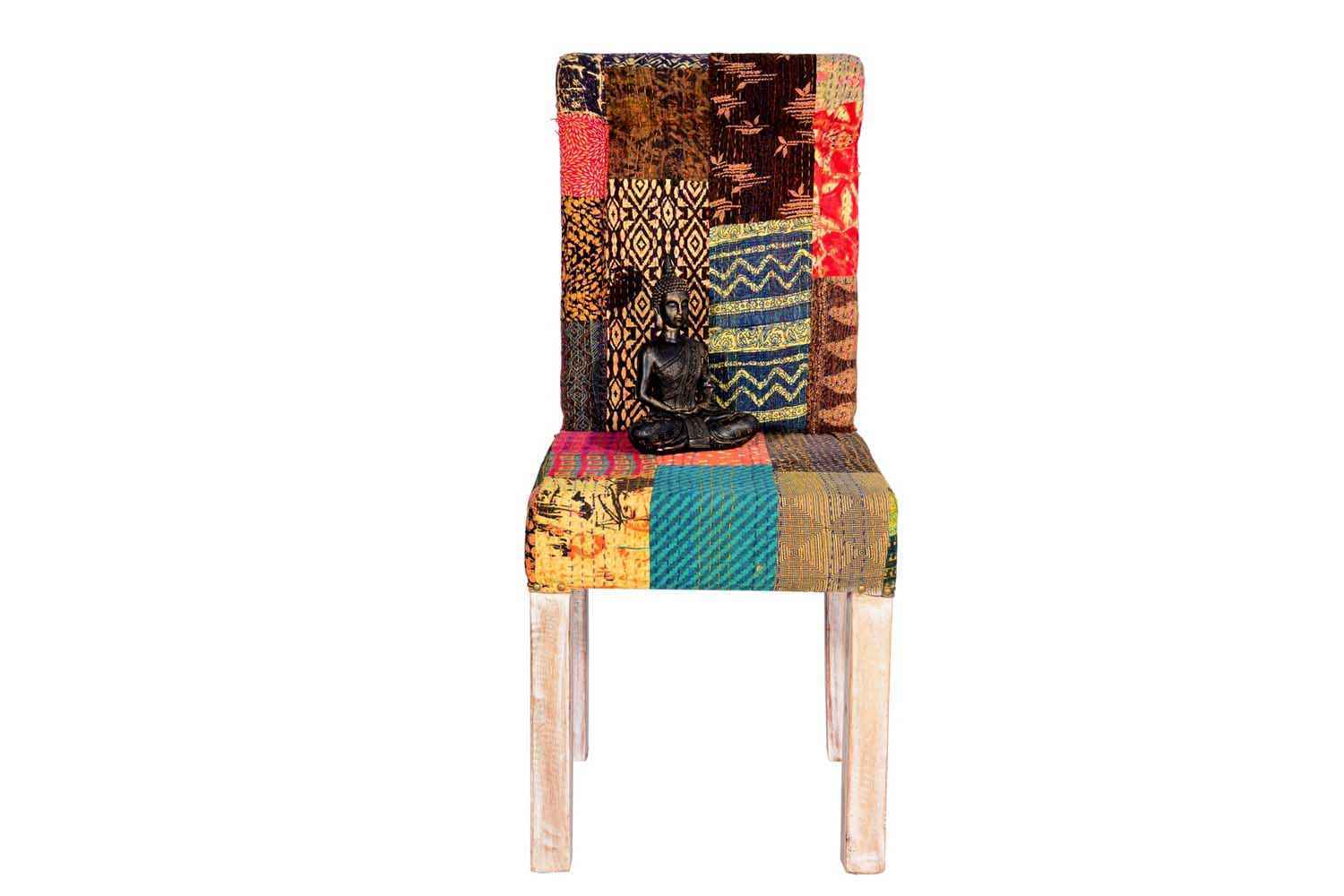Pair of A Garniture patch work chair is made by Mango wood with Dico rustic finish and upholstery.  We use recycle colorful upholstery to make product comfortable and beautiful.It leg finish is rustic.Its back rest upper portion (head rest) is in round shape.You can buy Solid wood furniture online from O my furniture.