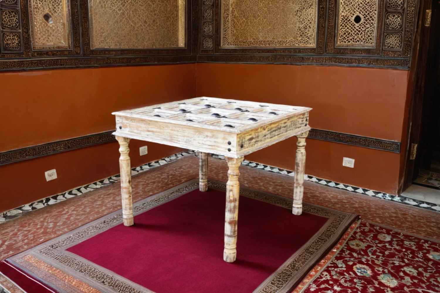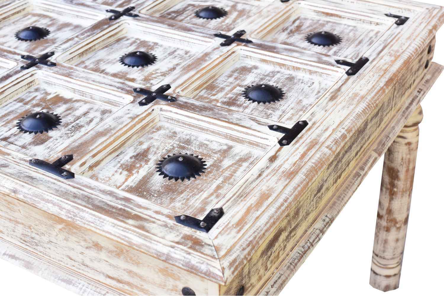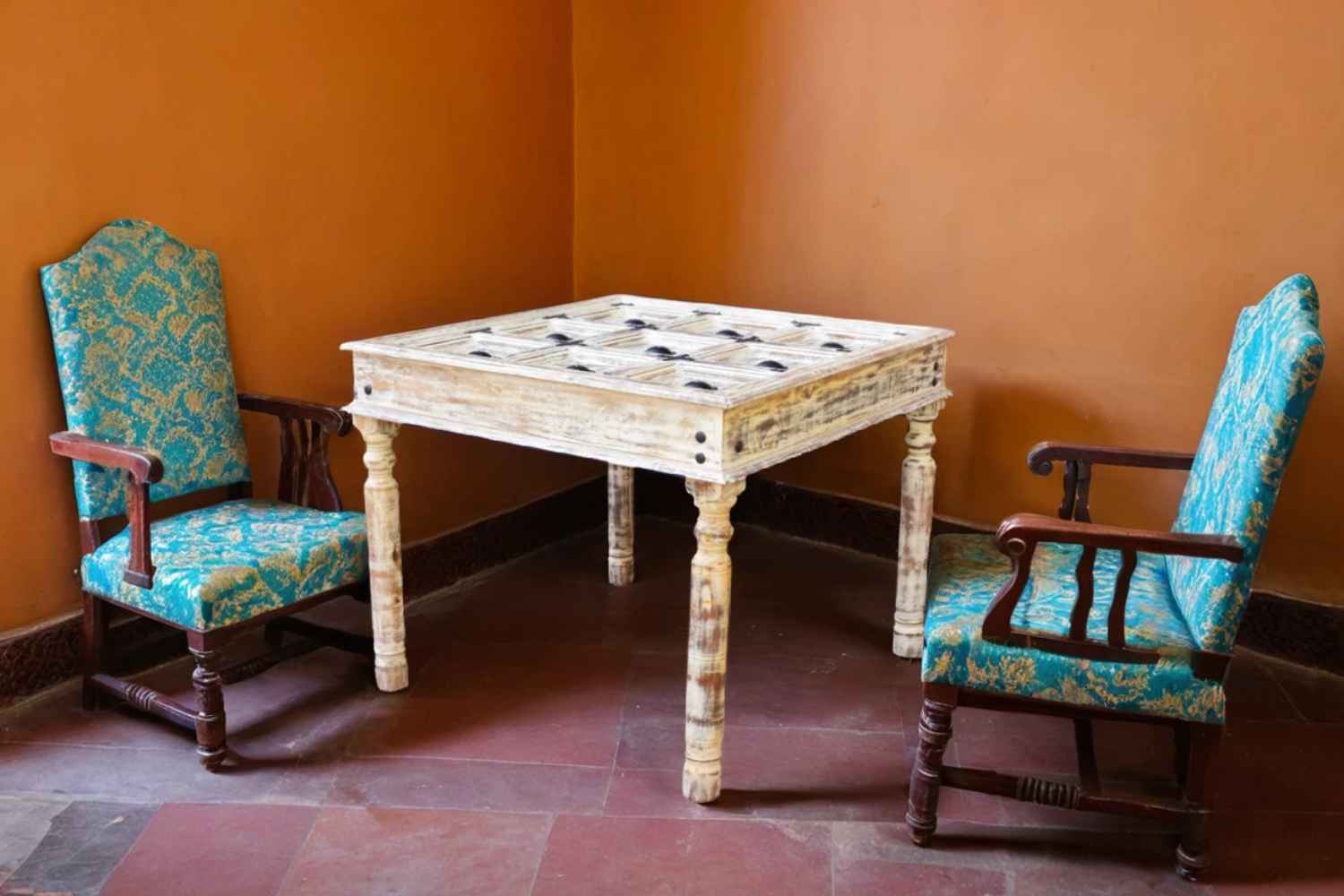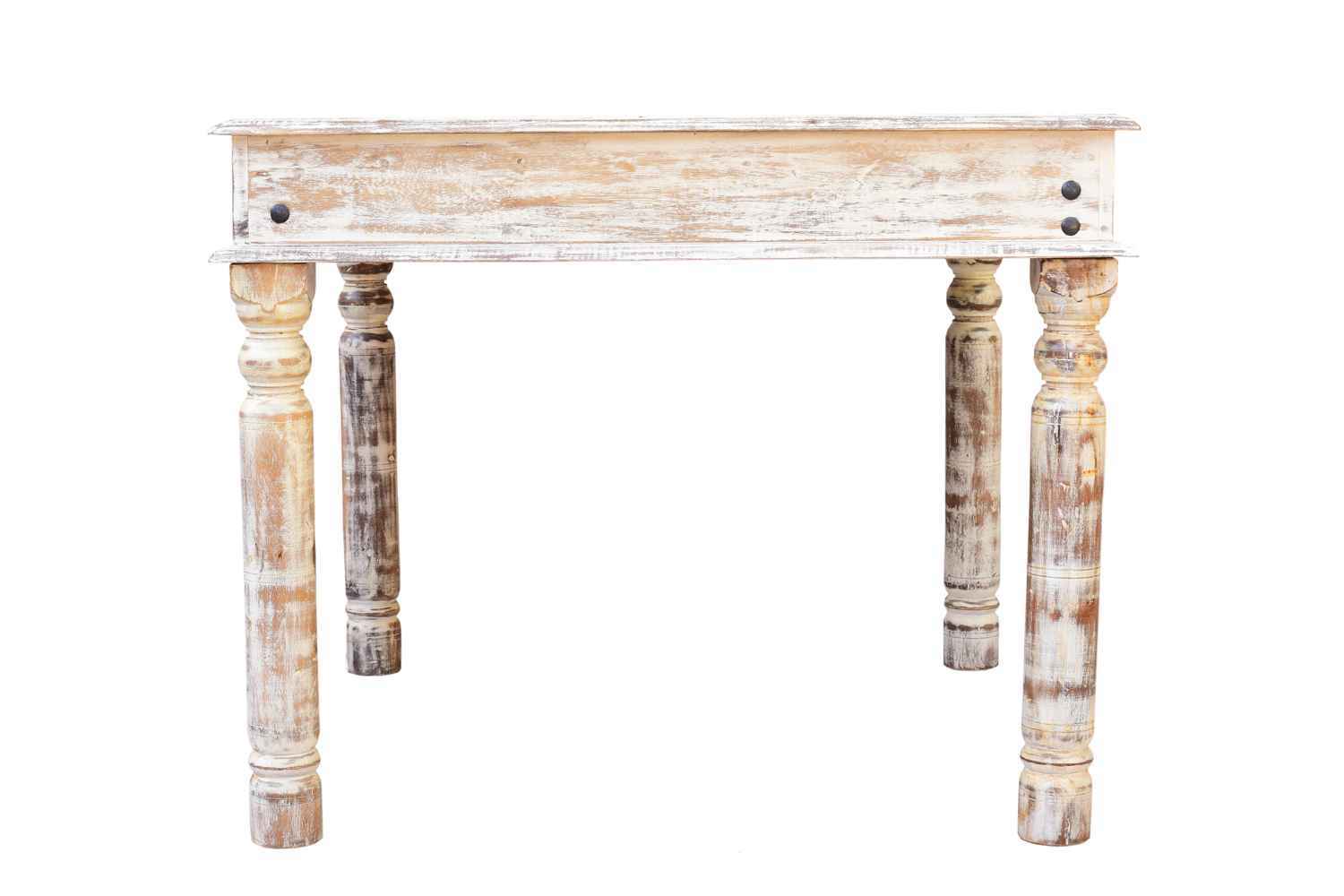 Moldy Dining Table is made by Sheesham (Rosewood) with dico rustic finish.Its legs are in round shape with low carving and top is giving a rustic antique look.It is iron fitting with carving design and glass top.It is a four sitting dining table with glass top.Sheesham wood furniture is always best choice to purchase furniture online.