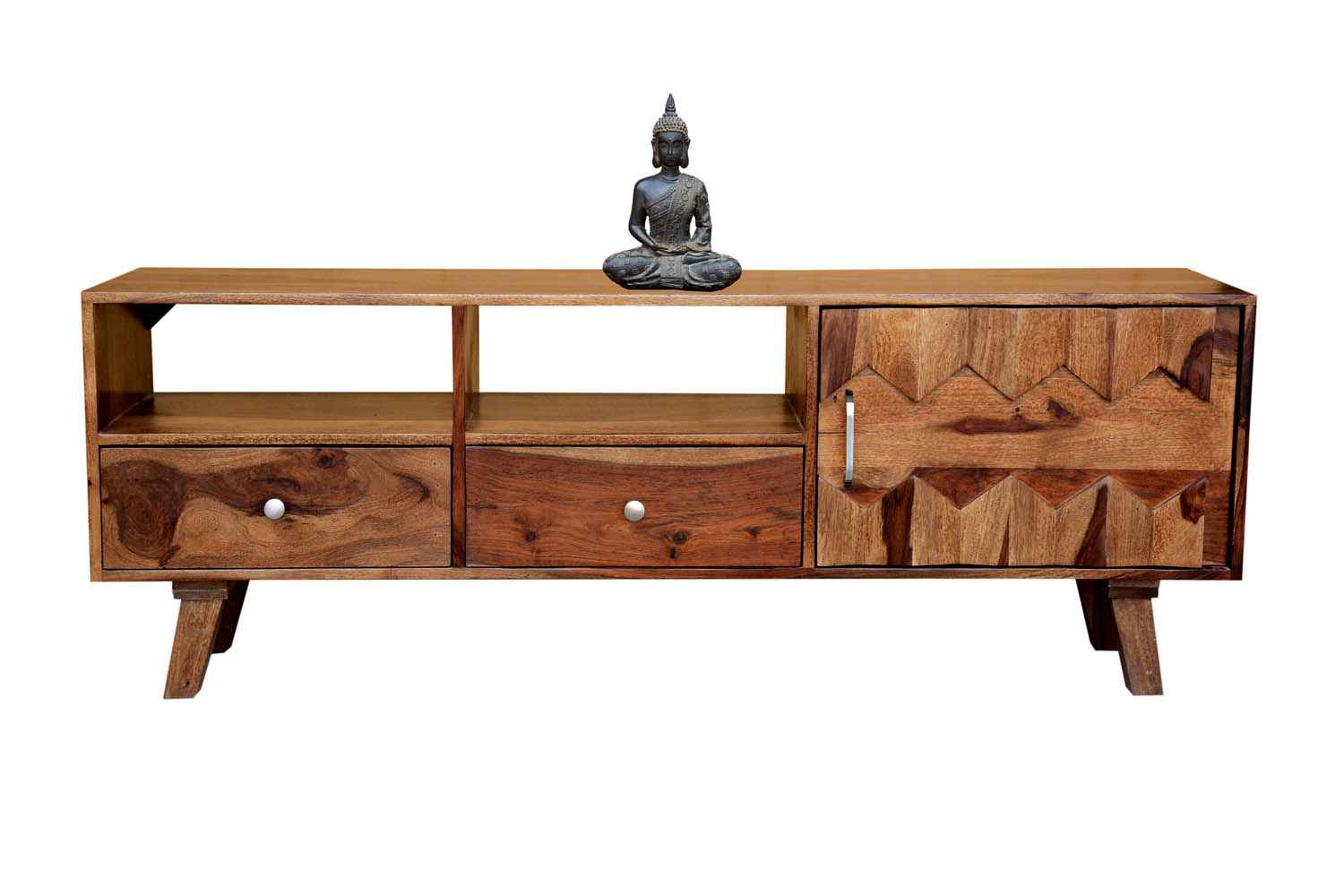 Recto three drawer tv unit is made by Sheesham (Rosewood) with teak finish. It is a television unit that contains three drawers and one blank section. We use Stainless steel accessories. It is a heavy and stable product. Sheesham wood furniture always count as a best quality product to buy.You can buy Solid wood furniture online from O my furniture.