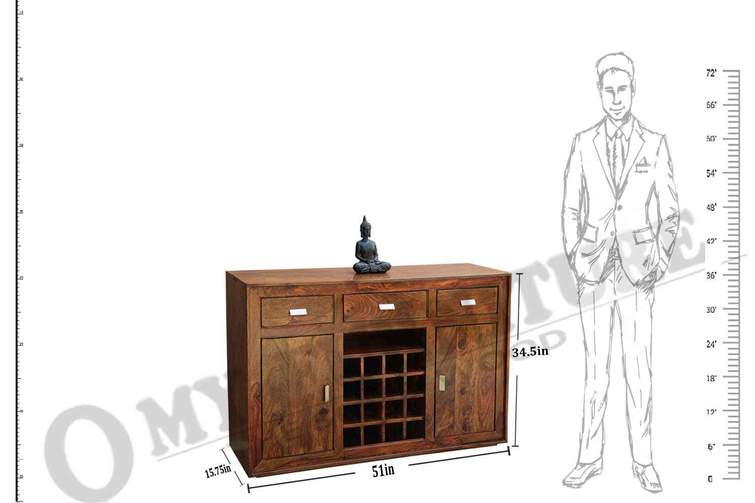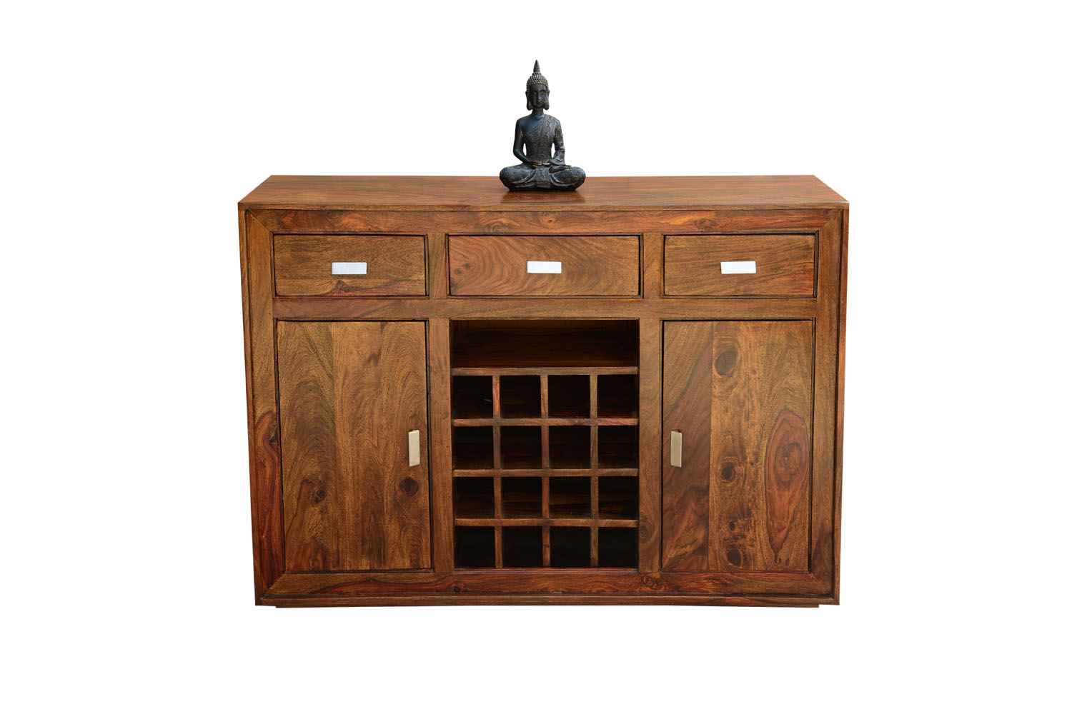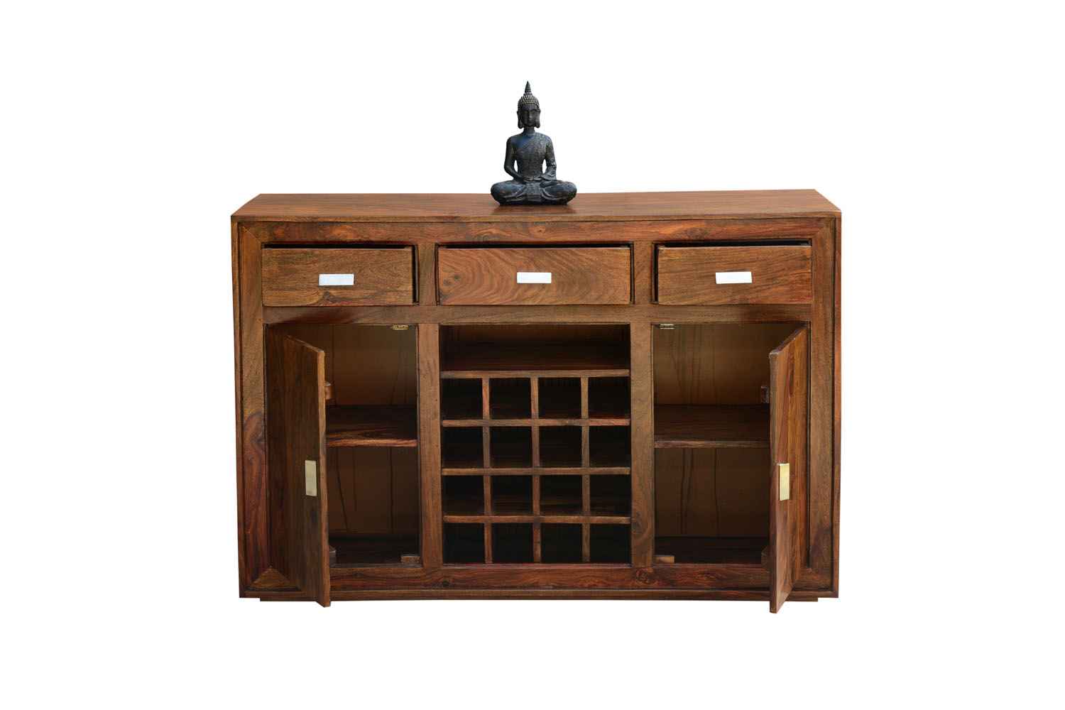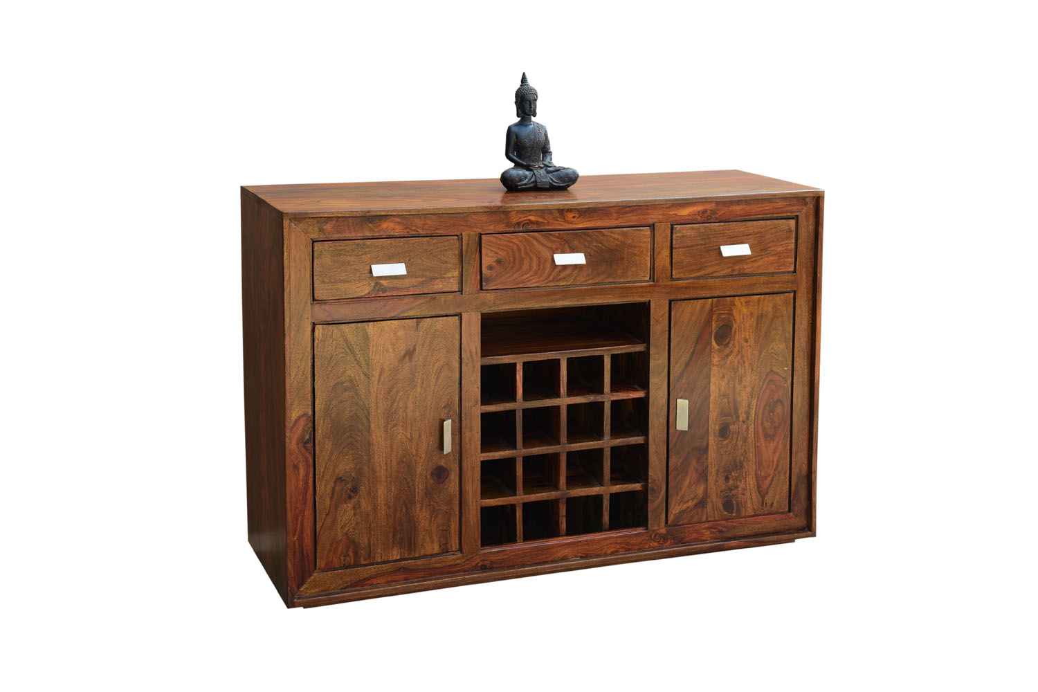 Eva side board cum bar cabinet is made by sheesham wood with teak finishing and back Section of product is made by high Quality MDF . It is multiple used side board that contain two side door storage compartment with shelf in it and middle part with twelve bottle rack and three drawers at above part of sideboard.