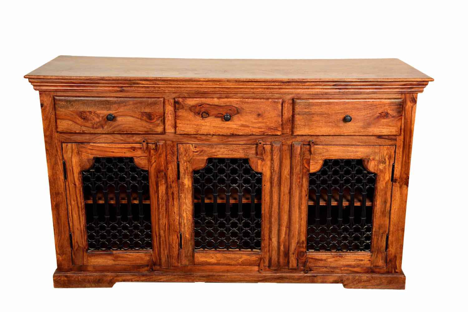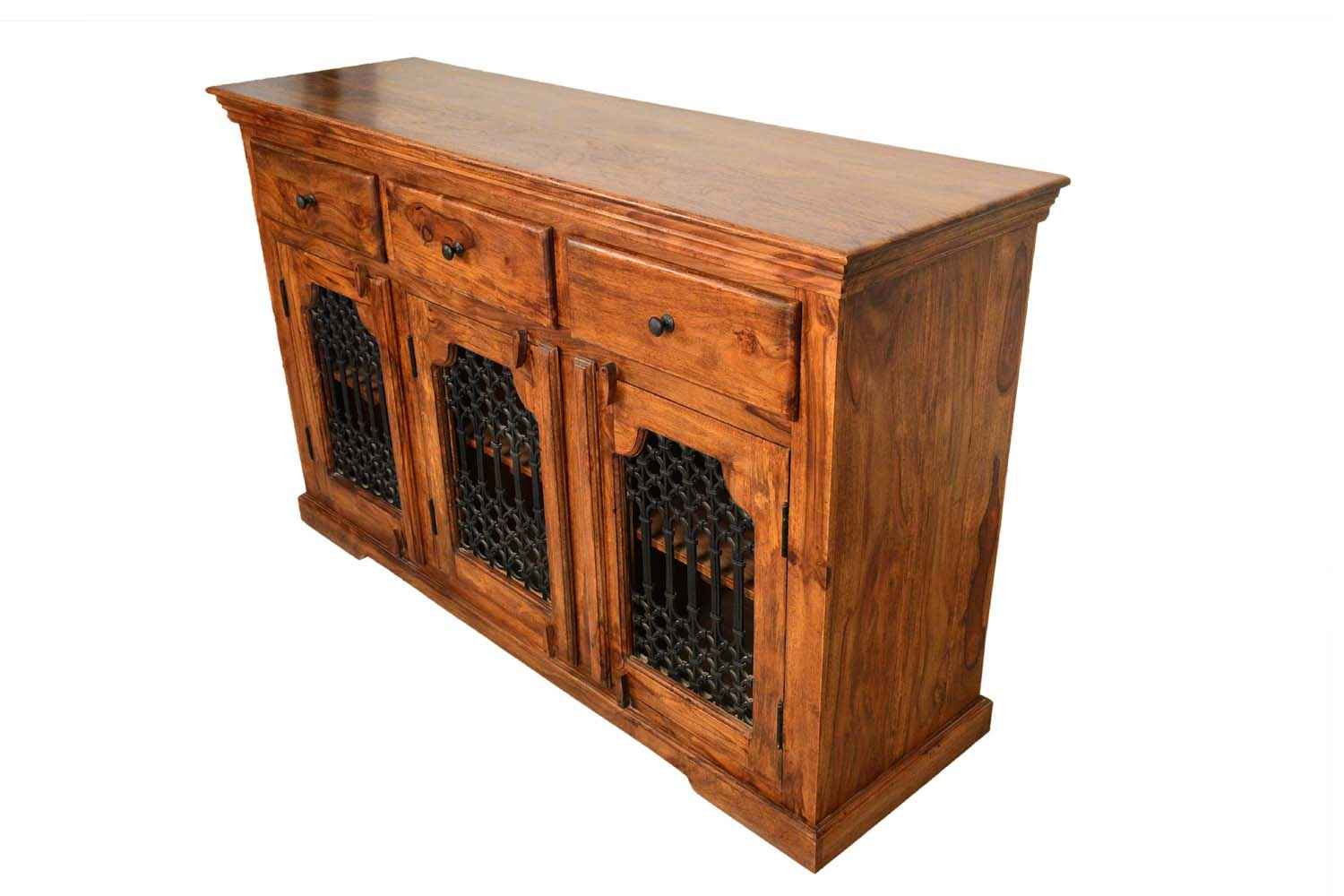 Ghoomer three drawer three door side board is made by Sheesham (Rosewood) with teak finish. This is three drawers and three door sideboard. Door designed is in capsule jail pattern. Cabinet inner sections are divided in two parts by middle shelf. Its looks are like old antique product that will make your interior more attractive. You can buy Solid wood furniture online from O my furniture.