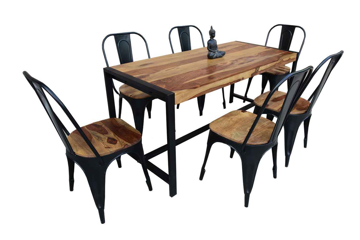 6 seater picco dining with molding Black iron chair Set Made by sheesham wood with teak finish and powder coated Iron. sheesham wood dining table is 6 seater table. This is very durable and long lasting Table on very reasonable price. You can use in living room and outdoor.