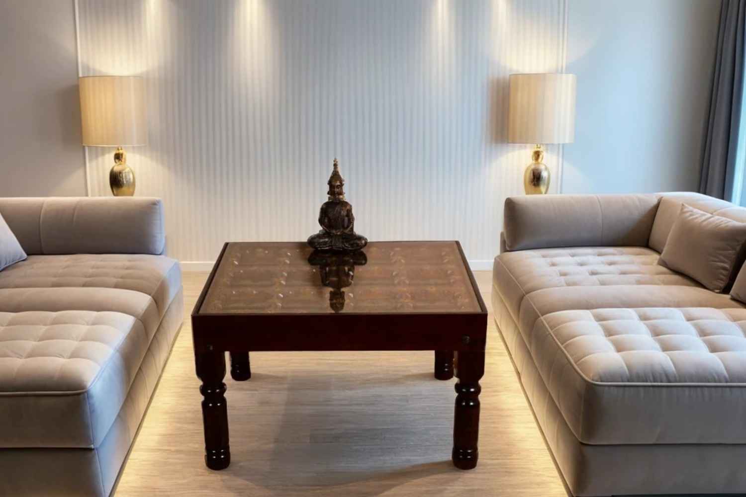 Antiquity JC coffee table is made by Sheesham (Rosewood) with walnut finish. Brass and iron worked on carving wood top that covered by glass top.This coffee table contains well carving round legs.It is a knockdown table.It is in light weight and easy to move. Sheesham wood furniture is always best choice to purchase furniture online.You can buy Solid wood furniture online from O my furniture.