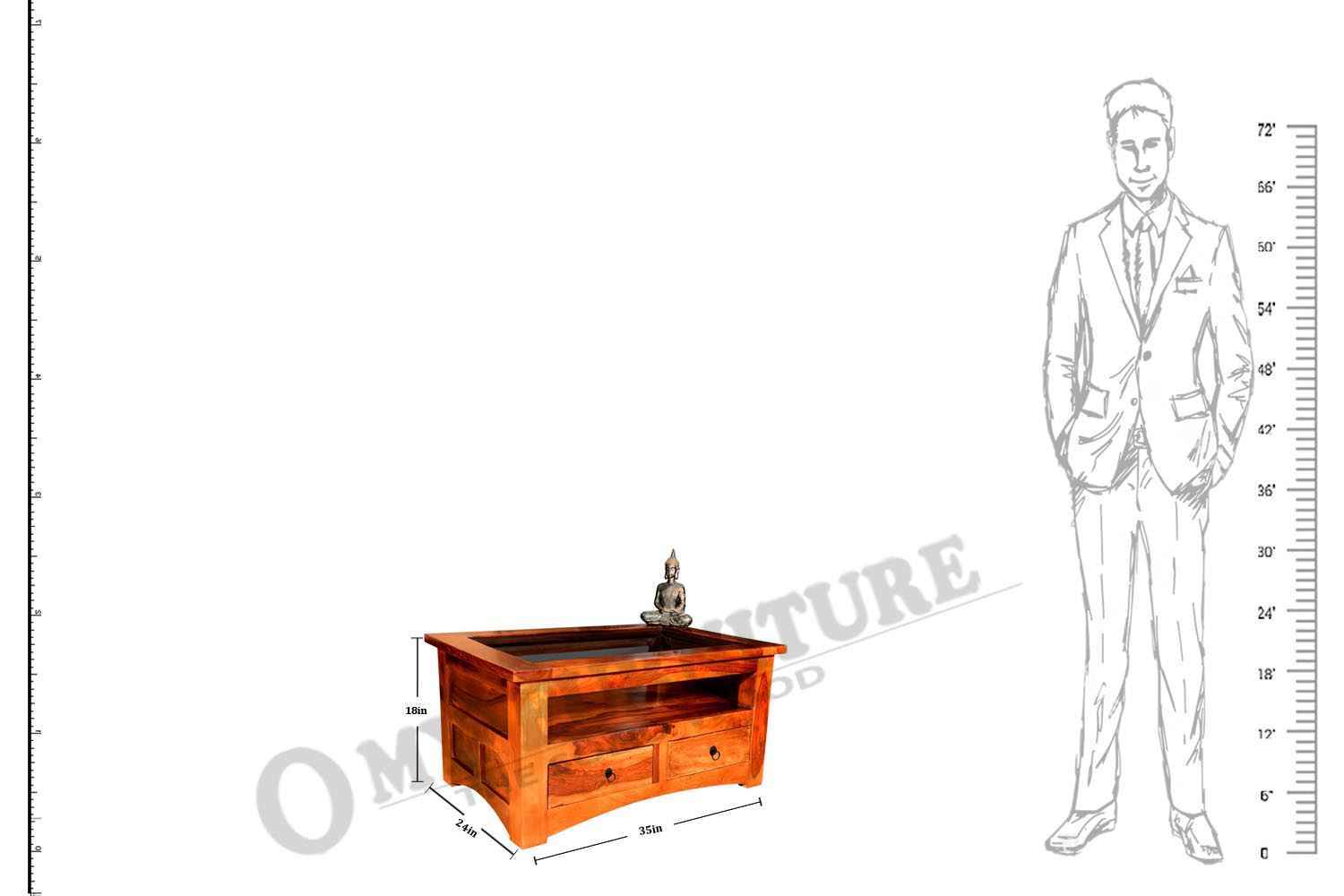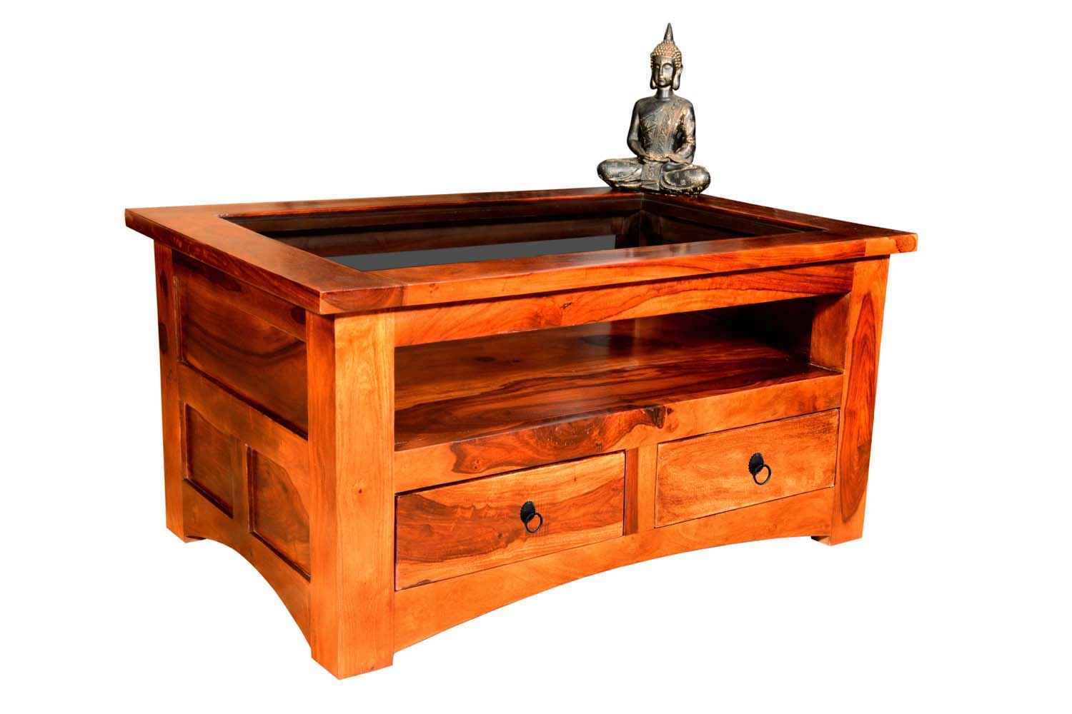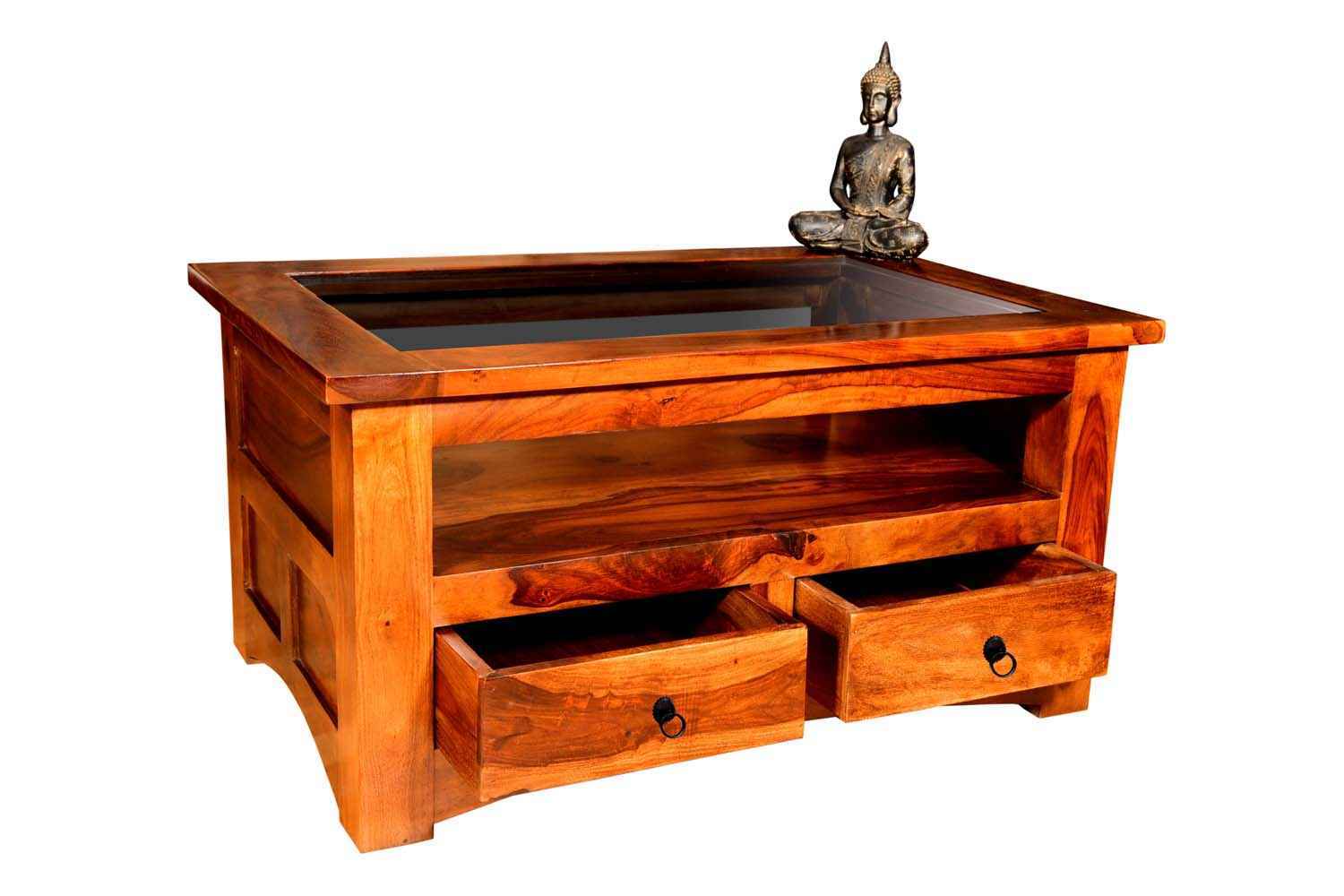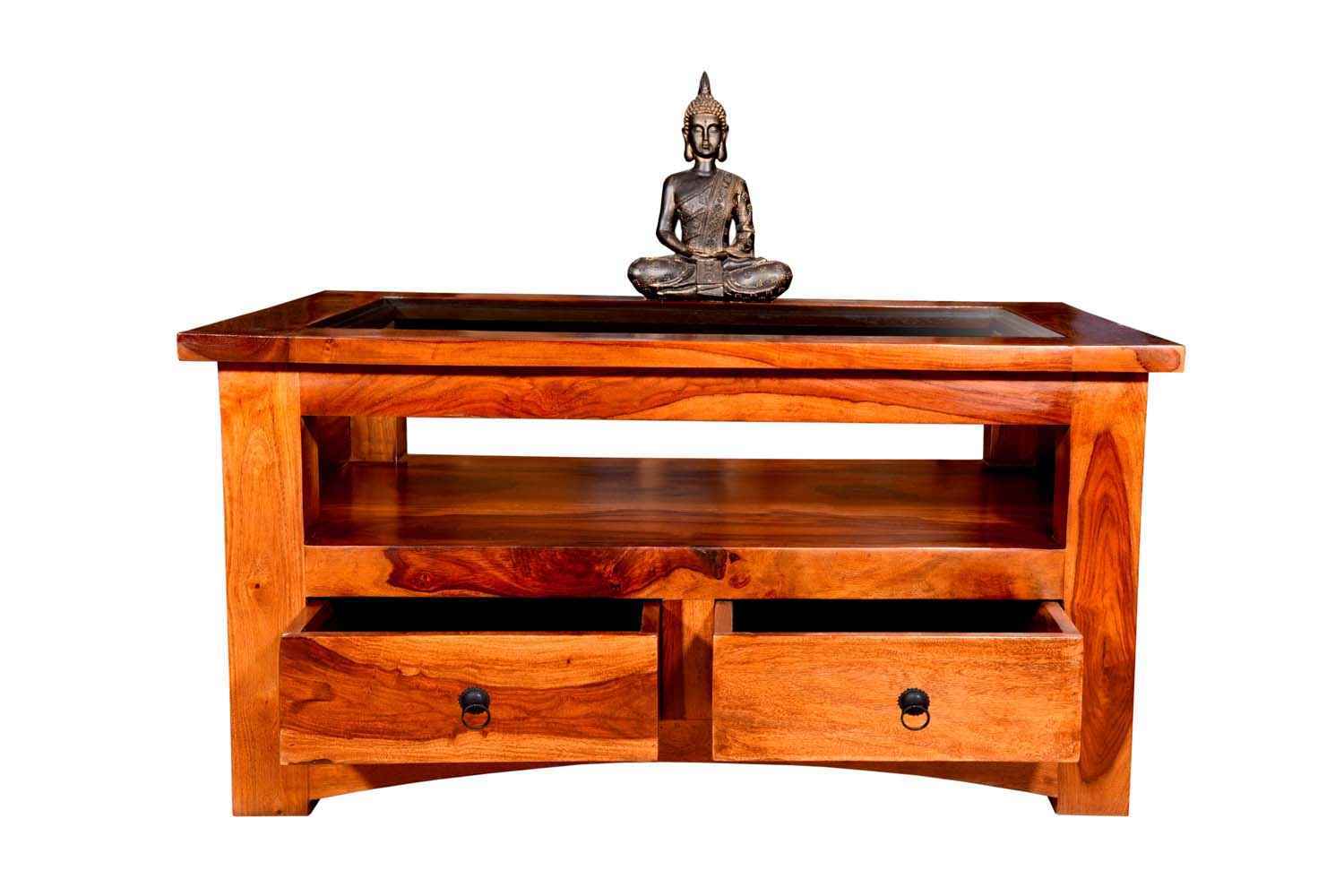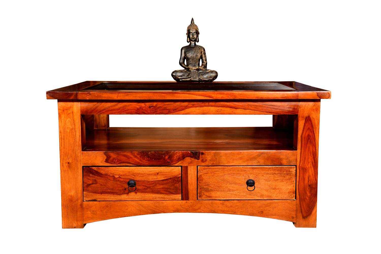 Mint two drawer teak finish coffee table is made by Sheesham wood with teak finish.This Sheesham wood coffee table contains glass top covered in wooden frame and both side open functionality drawer with metal accessories. We used curved design in each side of bottom area.It has a blank section between top and drawer that be use for any article or crockery stand. Its side portion also has square and rectangle shape design and top is lightly outer of whole body frame. It is very lovely design for living area.It is heavy and stable. Sheesham wood furniture is always count in best quality furniture.You can buy Sheesham wood furniture online from O my furniture.