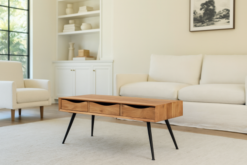 Quondam bottom shelf coffee table is made by Acacia wood with bleach finish. Bleach finish for giving this product rough look.This coffee table have two slit line design on bottom left and right side. A rectangle bottom shelf is attached with their legs. That gives antique look. Solid wood furniture always count in best quality furniture.O my furniture a complete Solid wood furniture stores help to increase your living room and bedroom decorum.