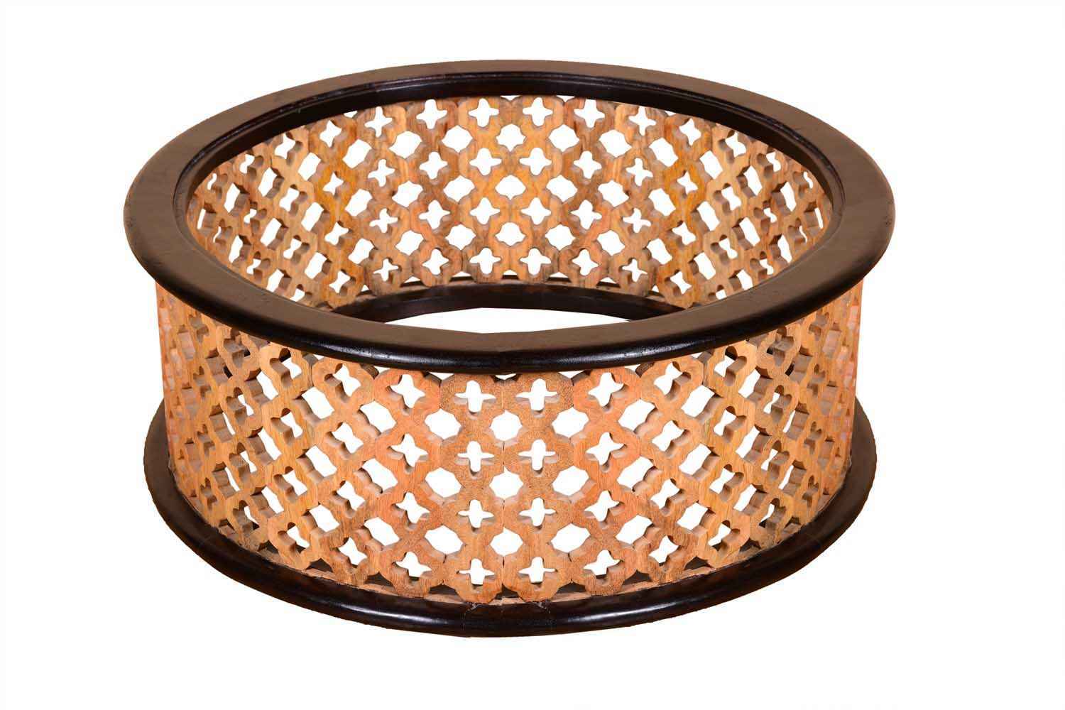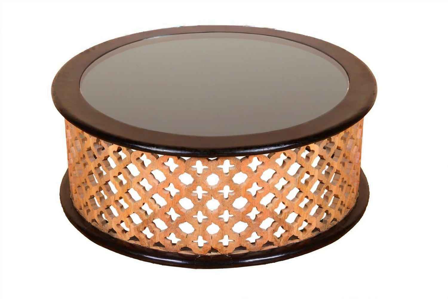 Jamboree design decor item is made by Mango wood with walnut and natural finish.It is round shape glass top coffee table.This coffee table contain star shape well carving in middle frame area.Its bottom and top covered with wooden wide strip is in walnut finish.You can buy Solid wood furniture online from O my furniture.