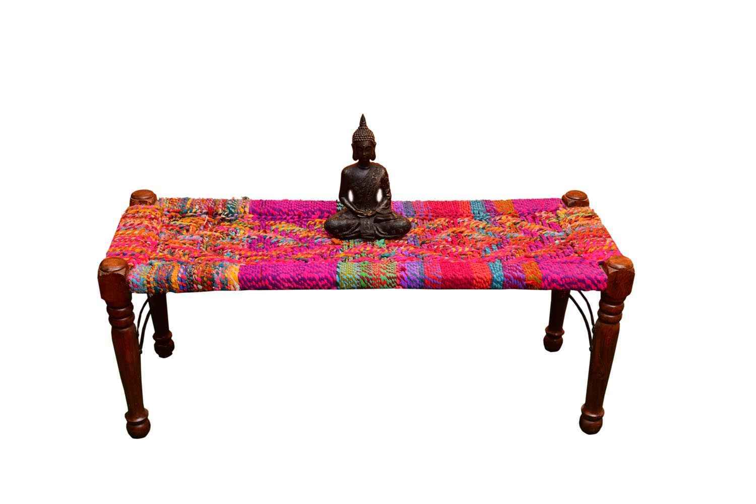 Munj round carving leg two seater bench is made by Sheesham (Rosewood)  with teak finish. We have used clothes strips in the making of the seating area to make it as a vintage look and unique design. Legs are in well round design. It is light weighted,easy for shifting. You can buy best quality Sheesham wood furniture online from O my furniture.
