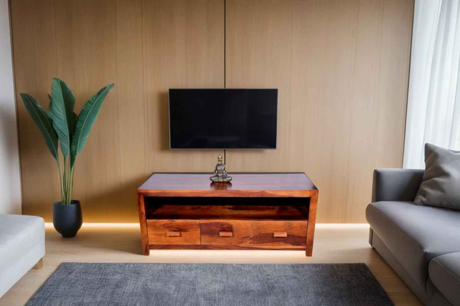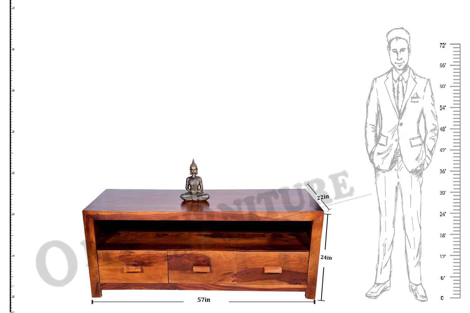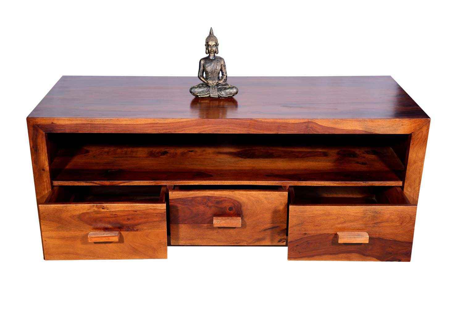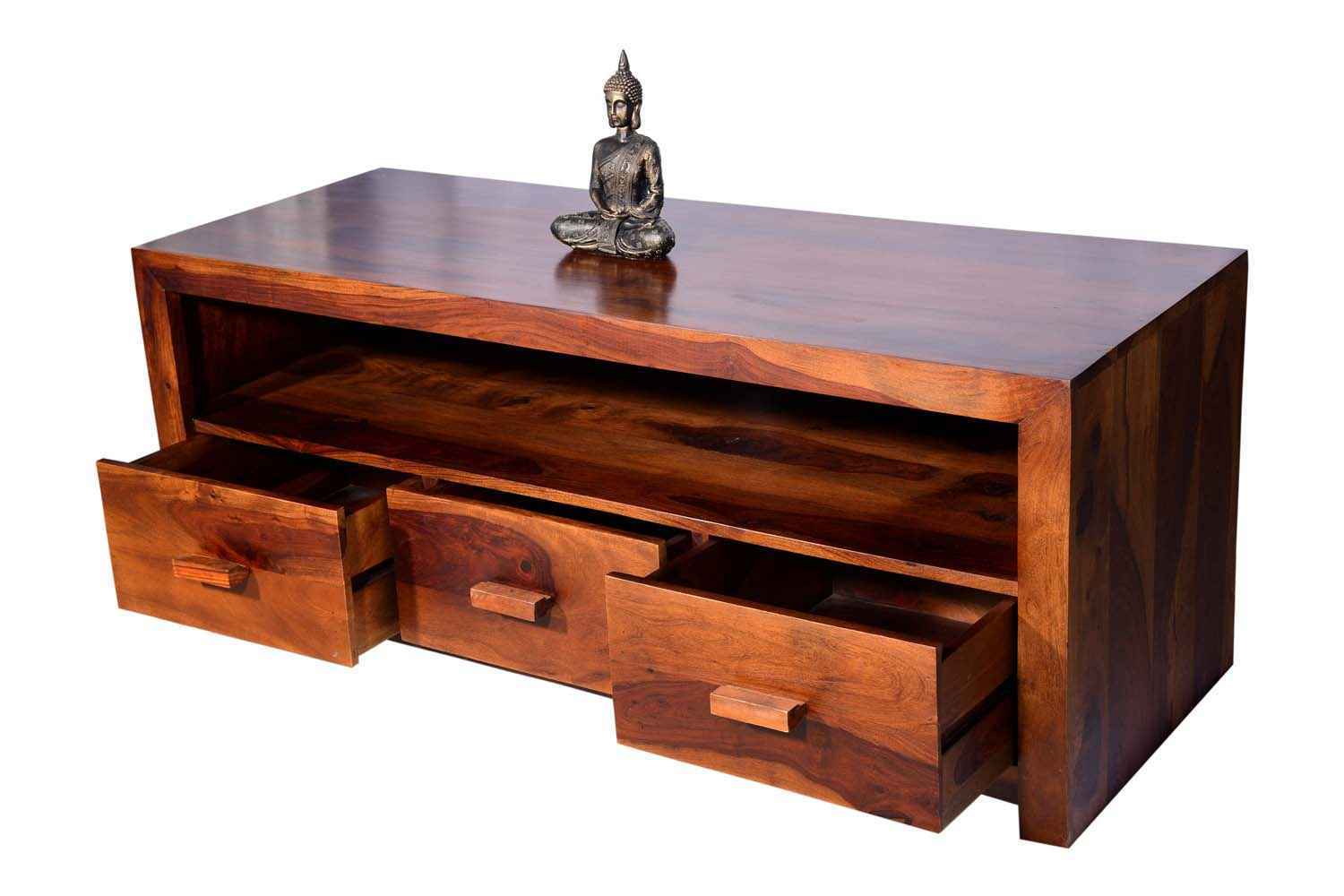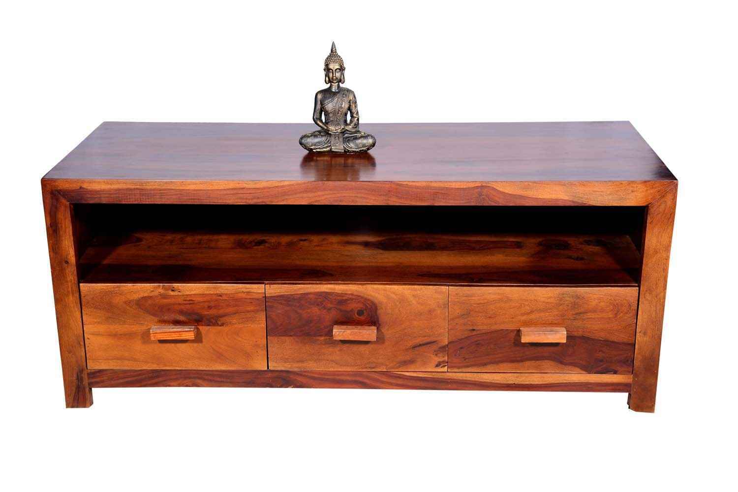 Recto three drawer tv unit is made by Sheesham (Rosewood) with teak finish. It is a television unit that contains three drawers and one blank section. We use Stainless steel  accessories. It is a heavy and stable product. Sheesham wood furniture always count as a best quality product to buy.You can buy Solid wood furniture online from O my furniture.